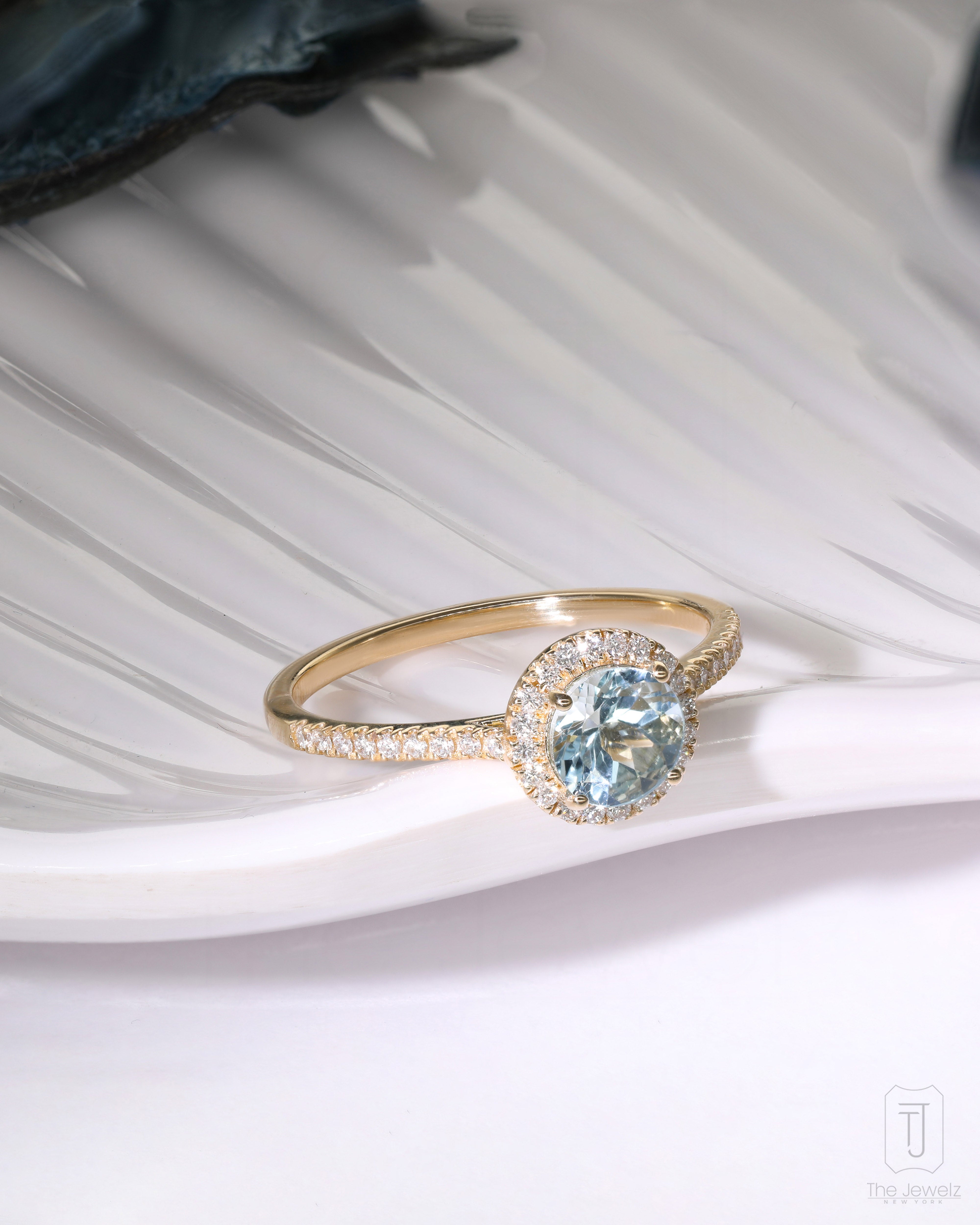 "This stunning aquamarine ring is a timeless masterpiece, featuring a mesmerizing oval-cut aquamarine gemstone that radiates a tranquil blue hue. Nestled in a 14K gold band, it is accentuated by a halo of brilliant-cut diamonds, adding a touch of elegance and sparkle. Perfect for making a statement, this ring is ideal for special occasions or as an everyday piece for those who love refined luxury. Its serene aquamarine tones exude sophistication and charm.