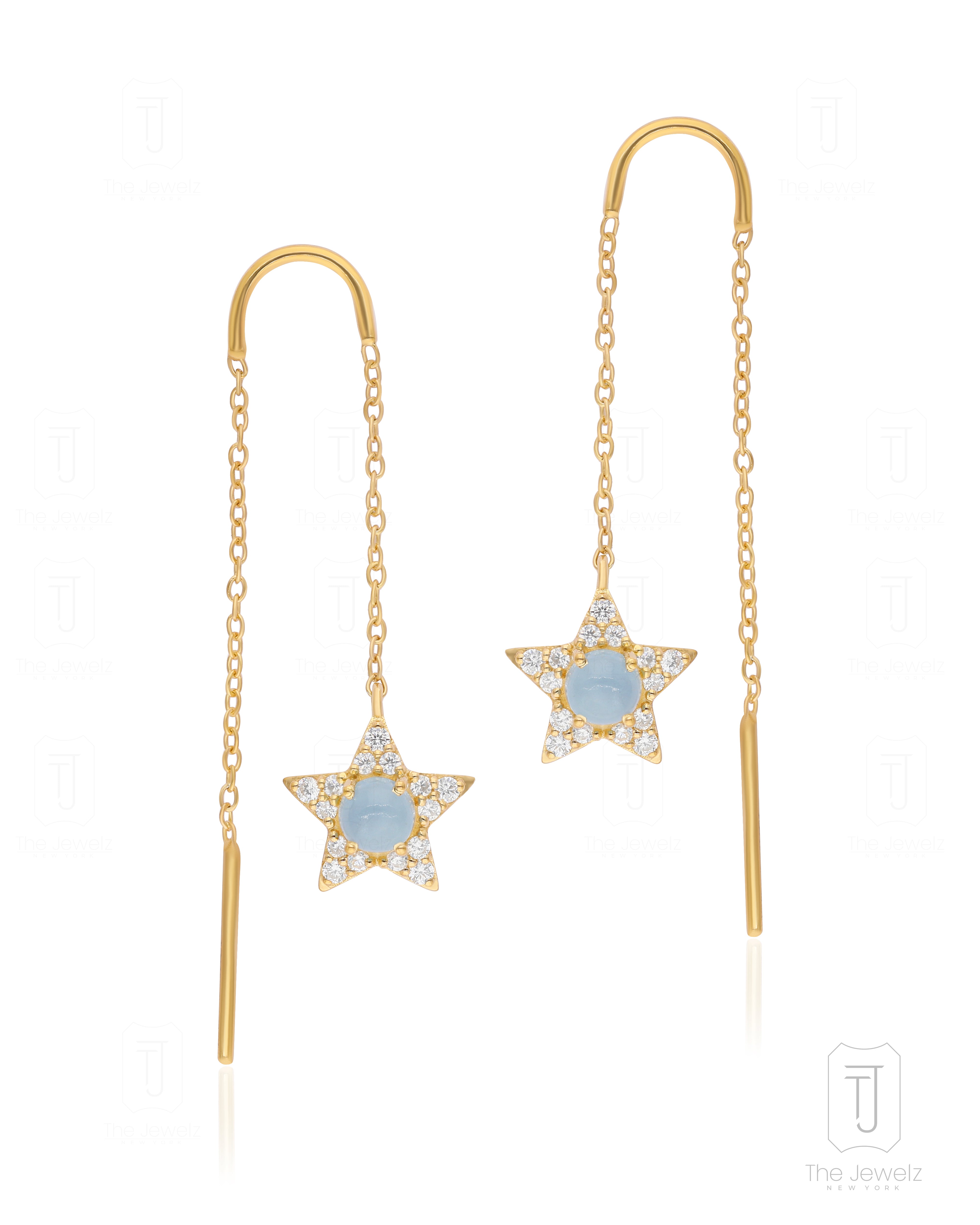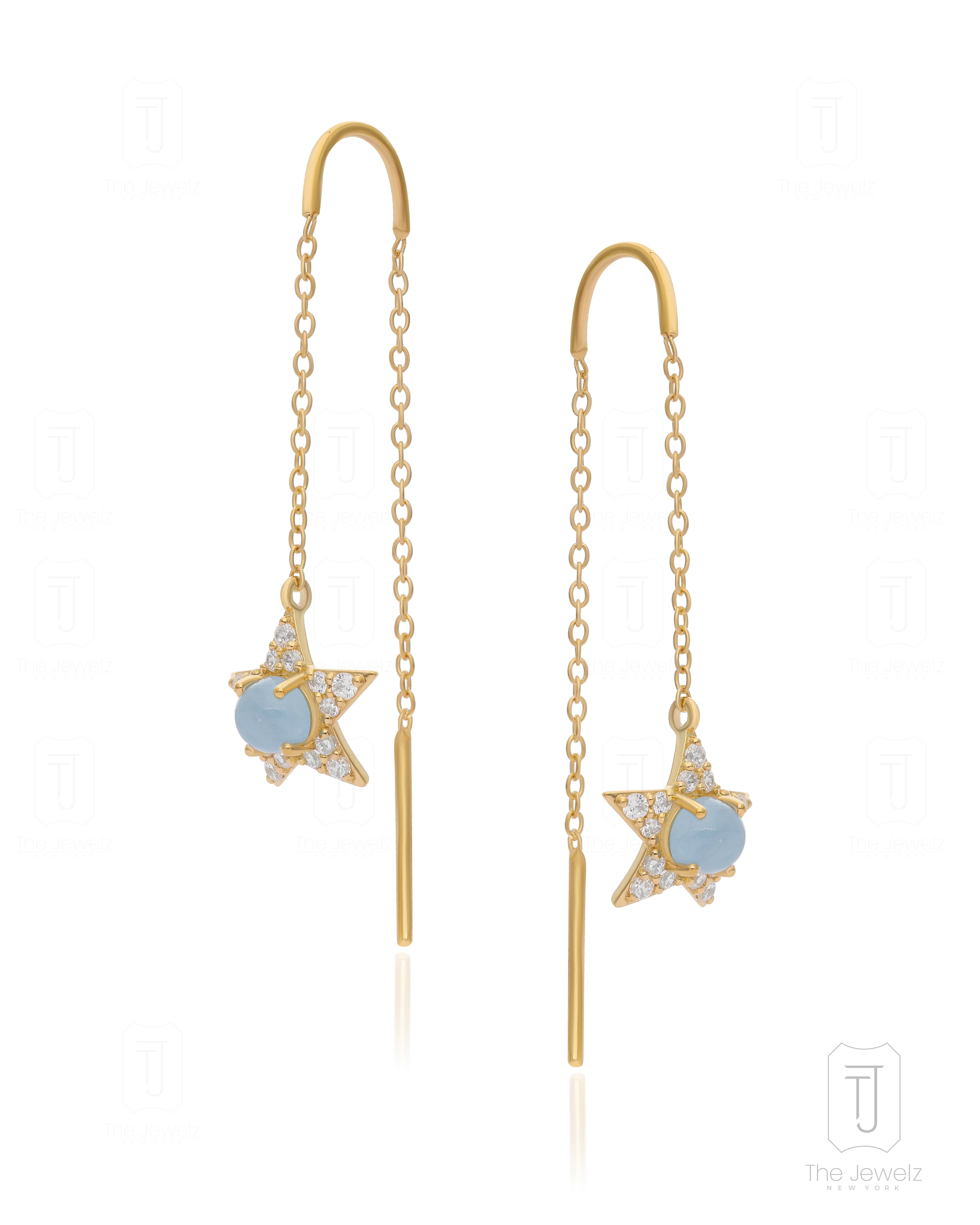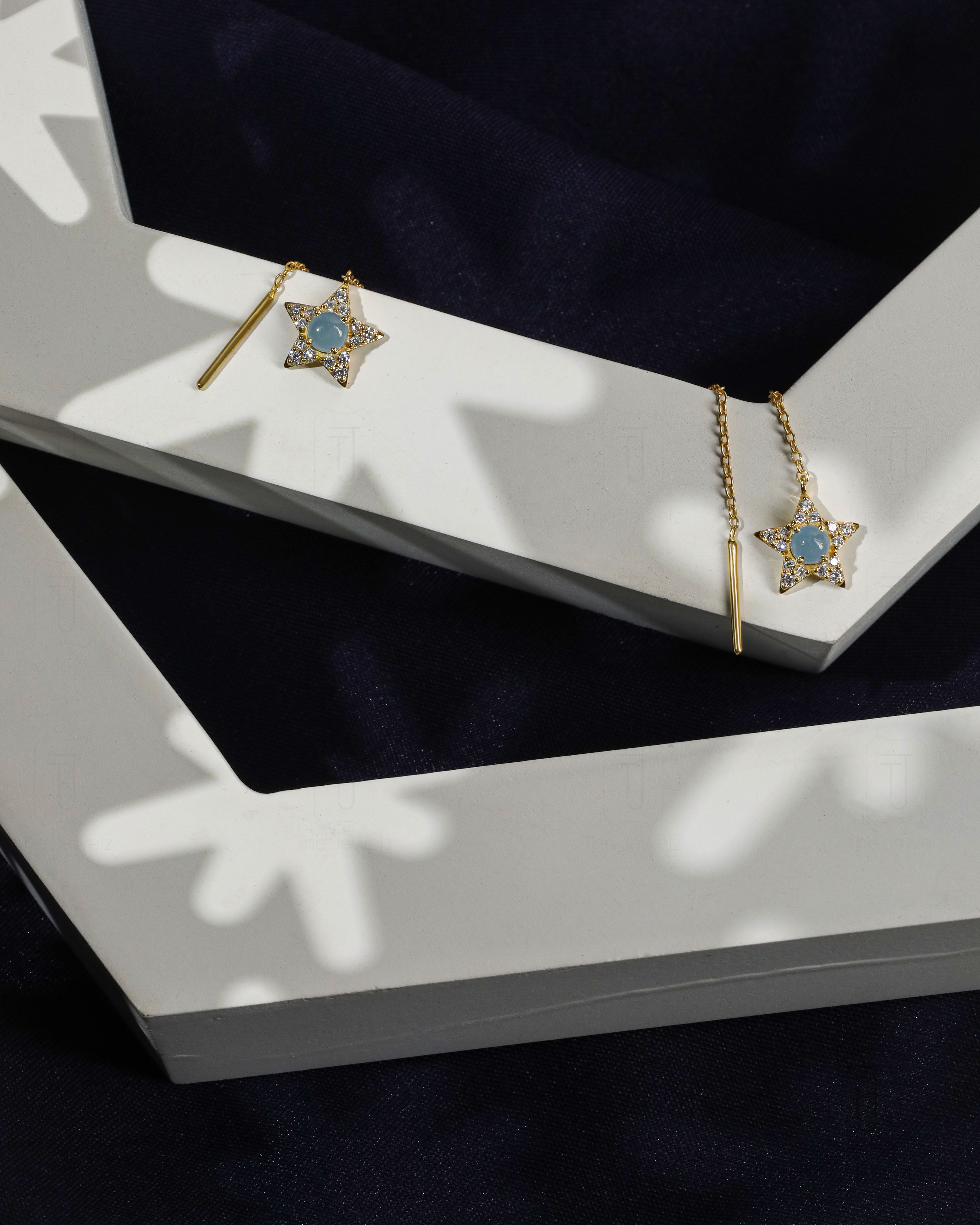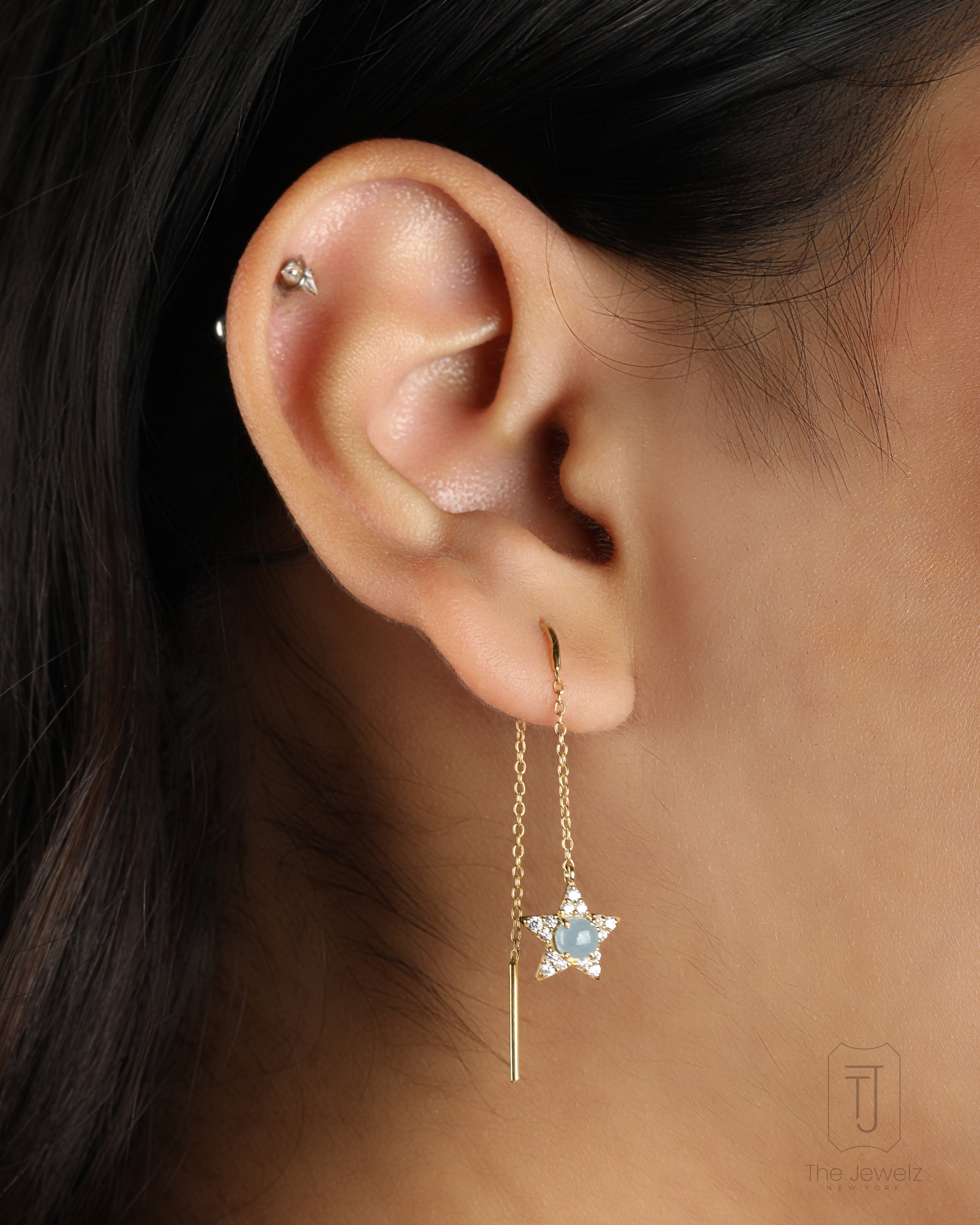 Channel your inner star child with these cosmically cool threaders. Each earring is a tiny galaxy, with an aquamarine star at its center. They're like a piece of the night sky, captured and crafted just for you. They're the perfect blend of understated elegance and cosmic allure, making them a versatile accessory for day or night.