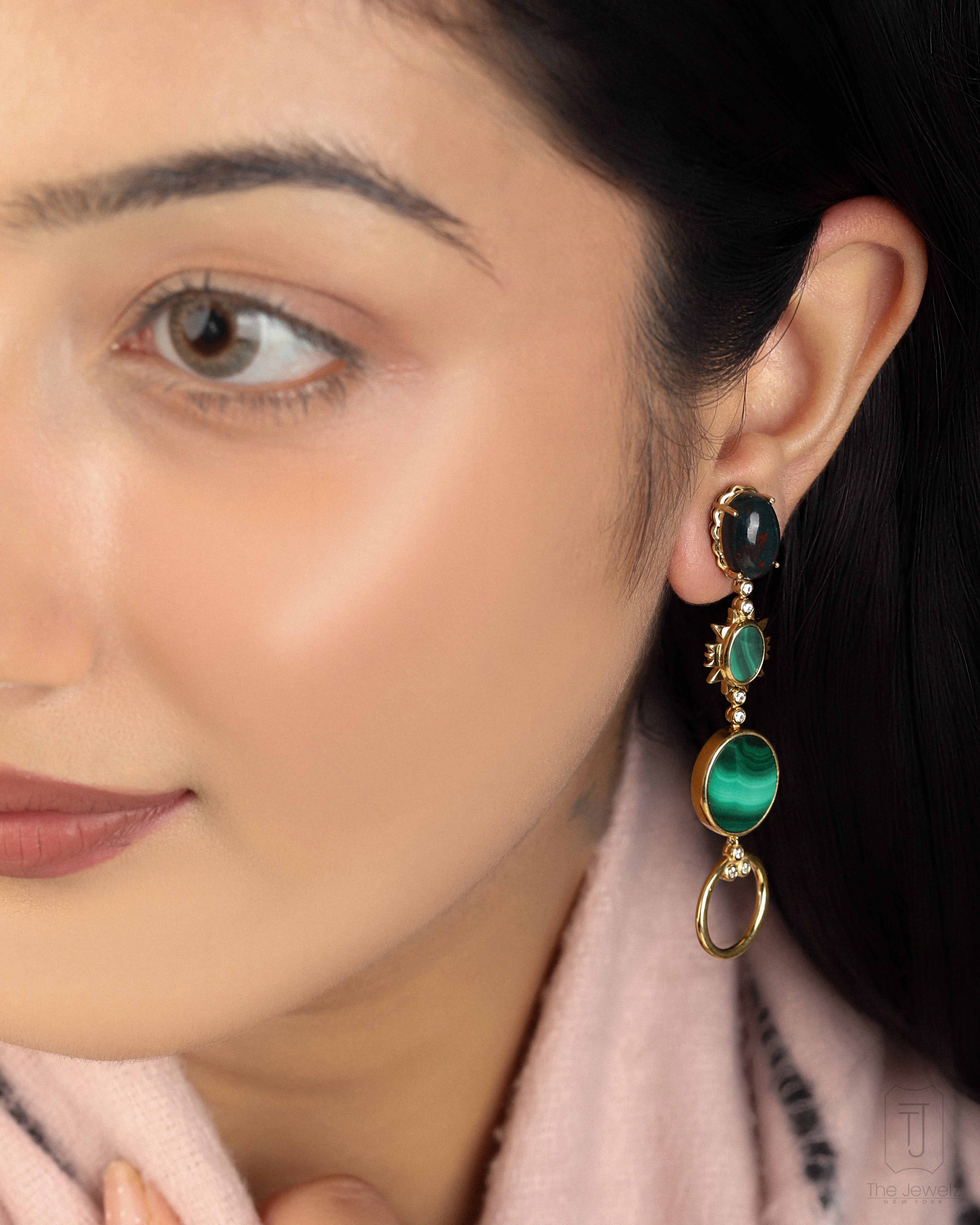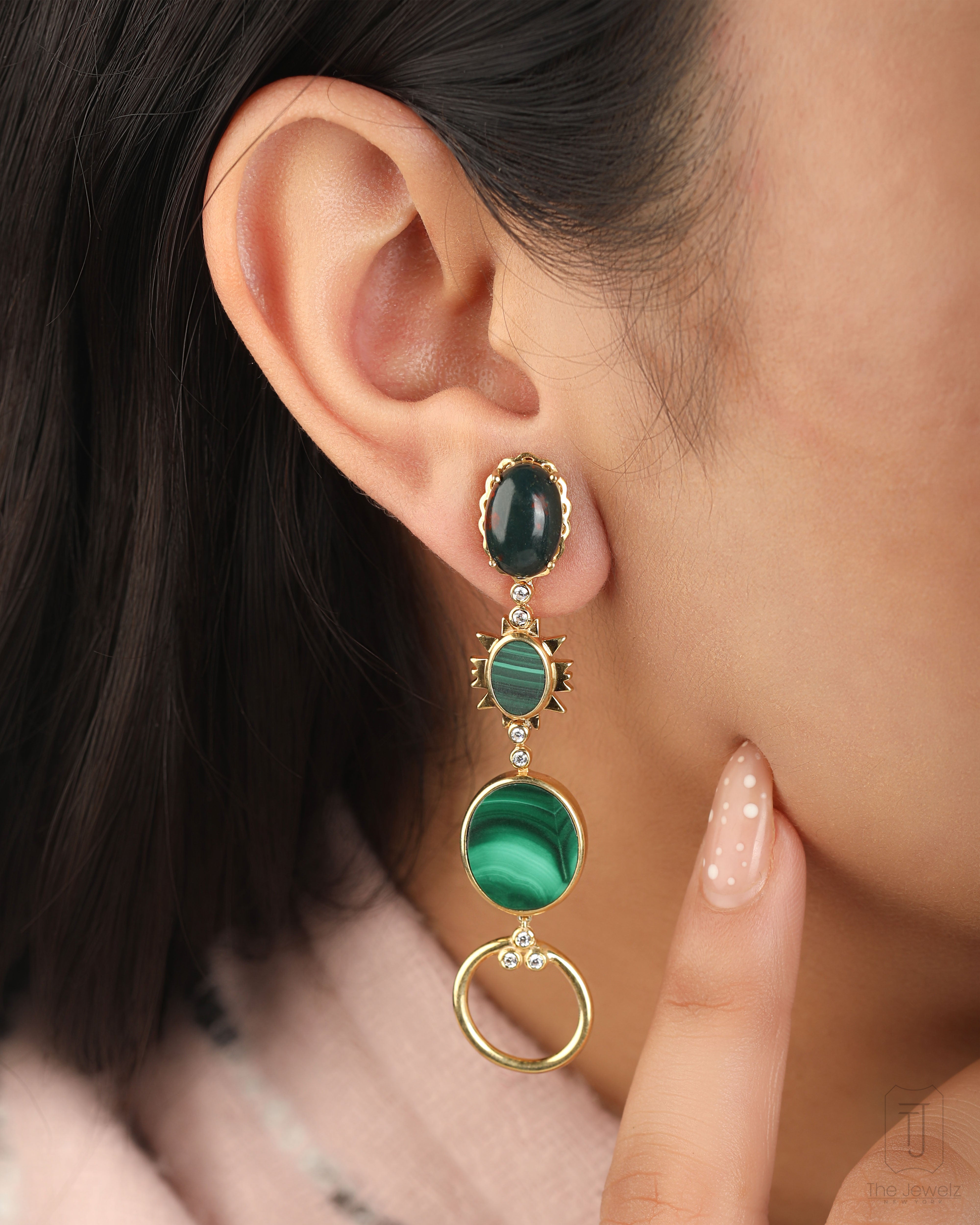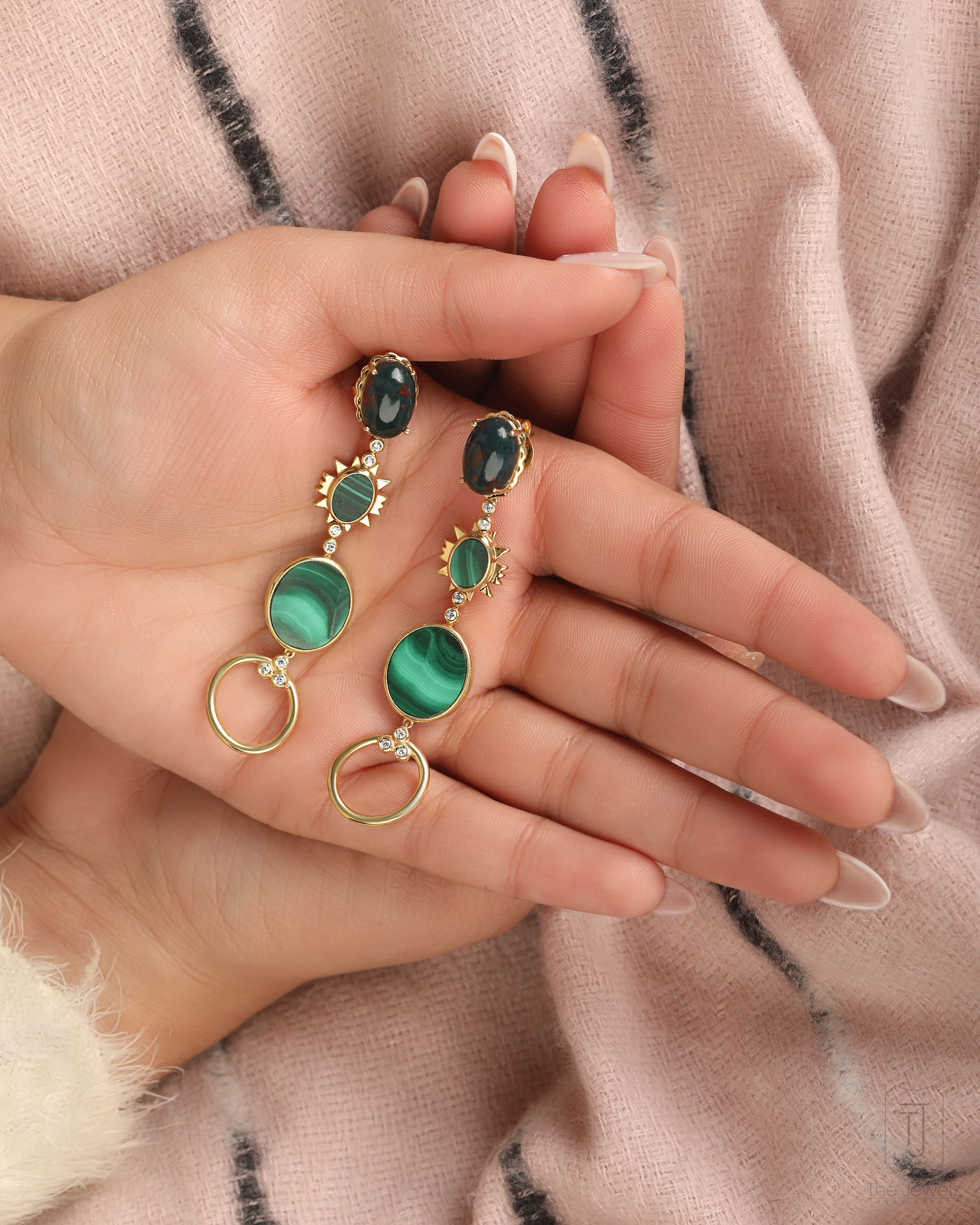 Charmed Danglers – featuring the striking contrast of deep Bloodstone and rich green Malachite, evoke an air of mystery and sophistication. The fluid, dangling design is a nod to contemporary artistic expression. Perfect for the modern muse, these earrings embody the allure of artistic creativity while making a confident statement in any ensemble.