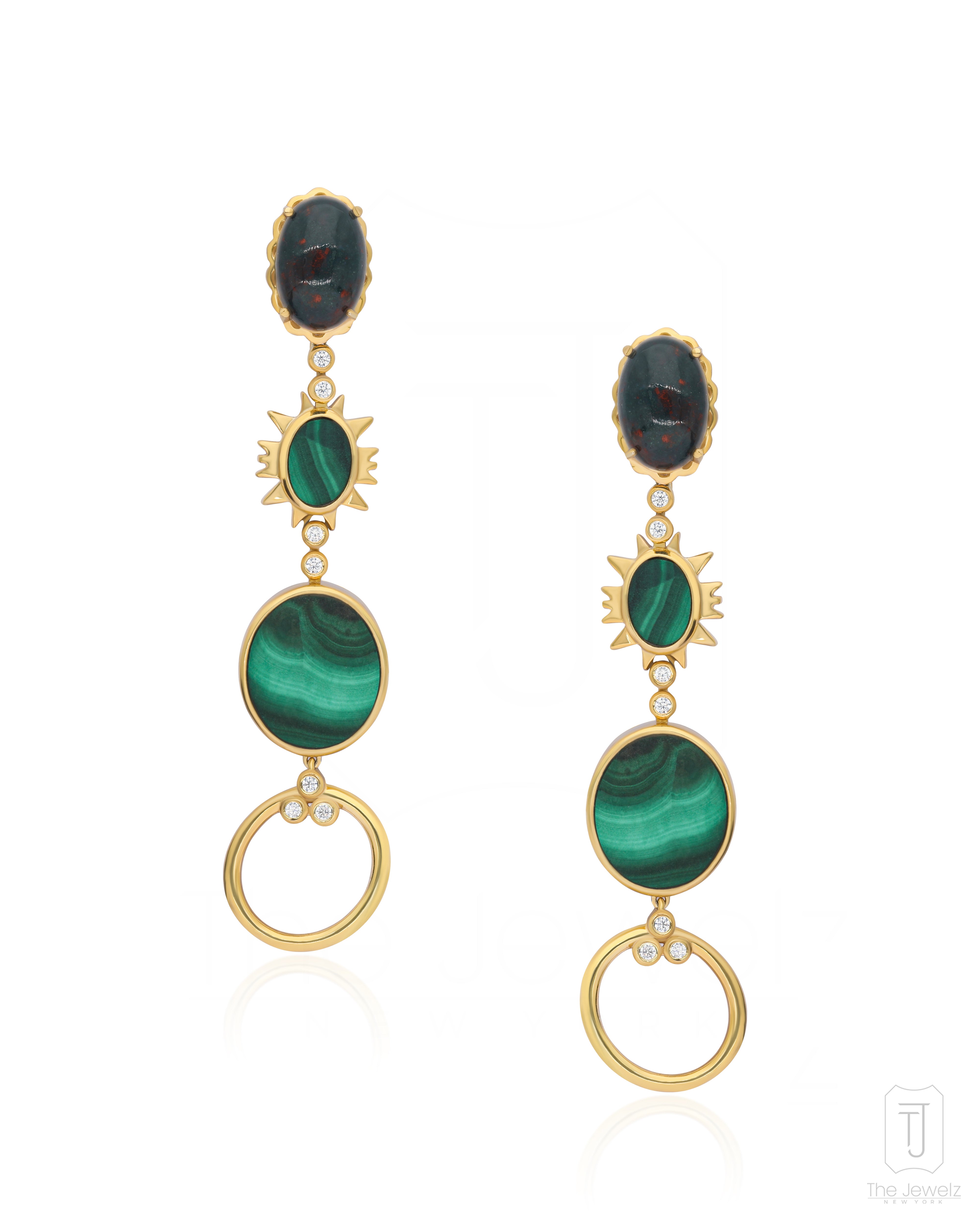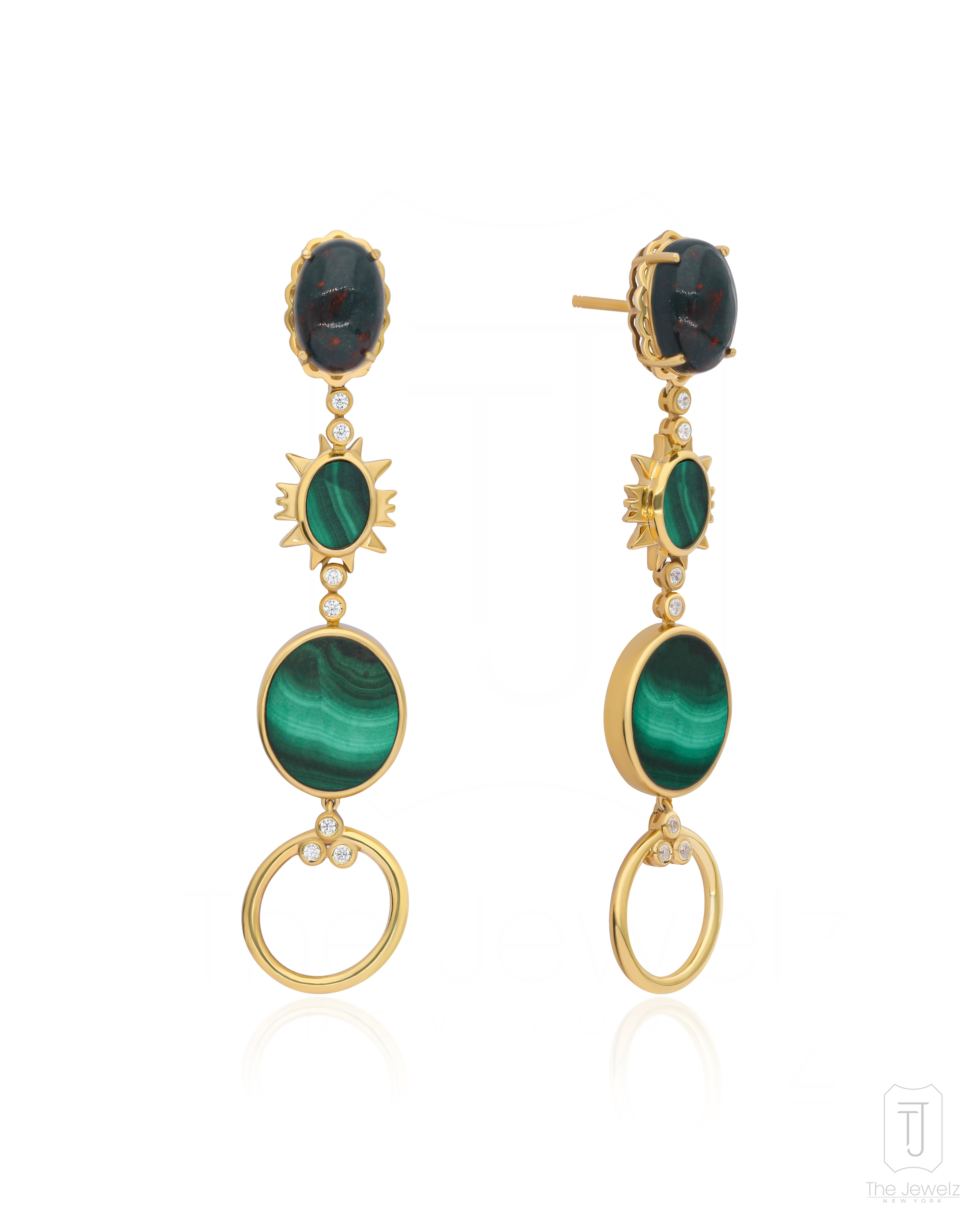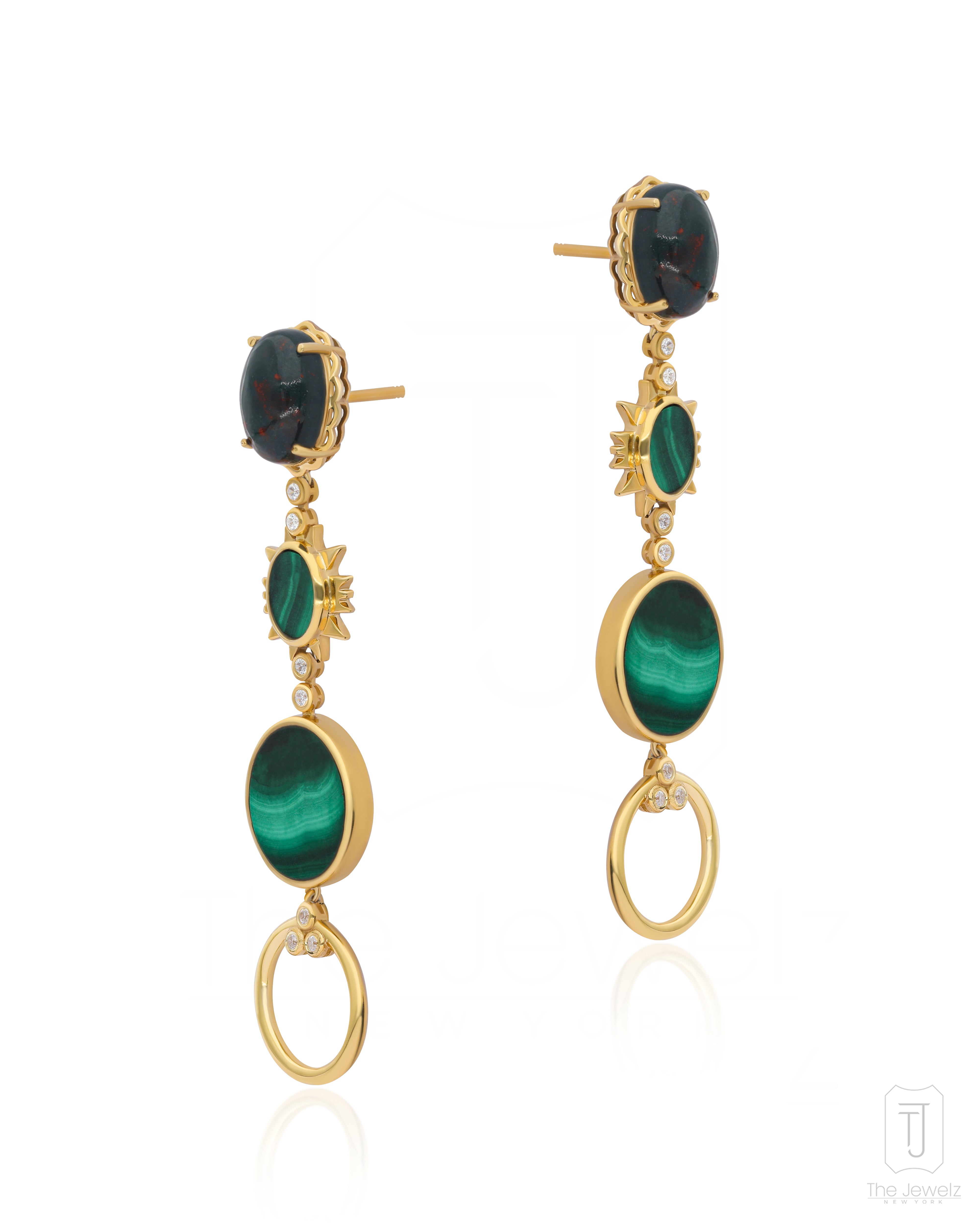 Charmed Danglers – featuring the striking contrast of deep Bloodstone and rich green Malachite, evoke an air of mystery and sophistication. The fluid, dangling design is a nod to contemporary artistic expression. Perfect for the modern muse, these earrings embody the allure of artistic creativity while making a confident statement in any ensemble.