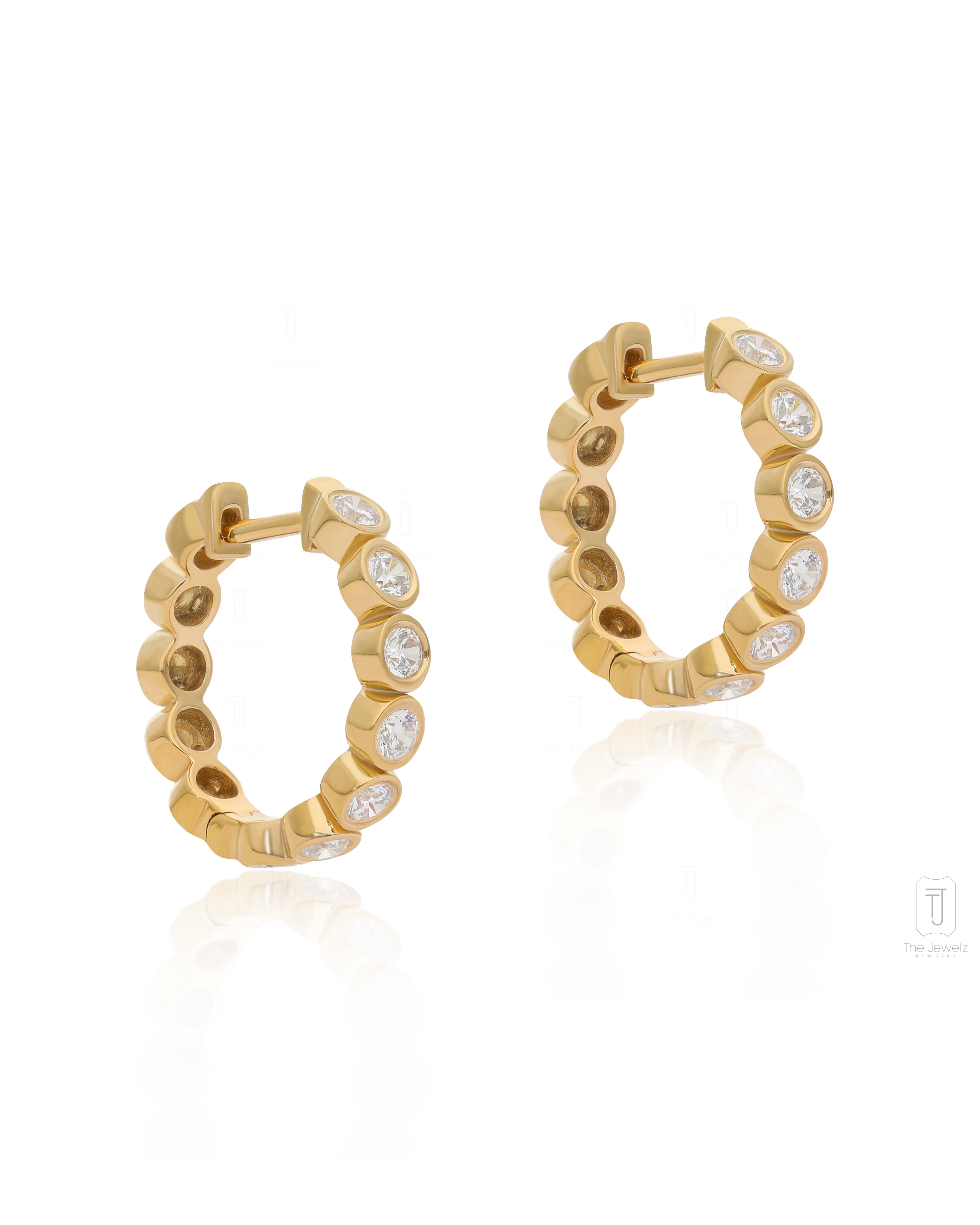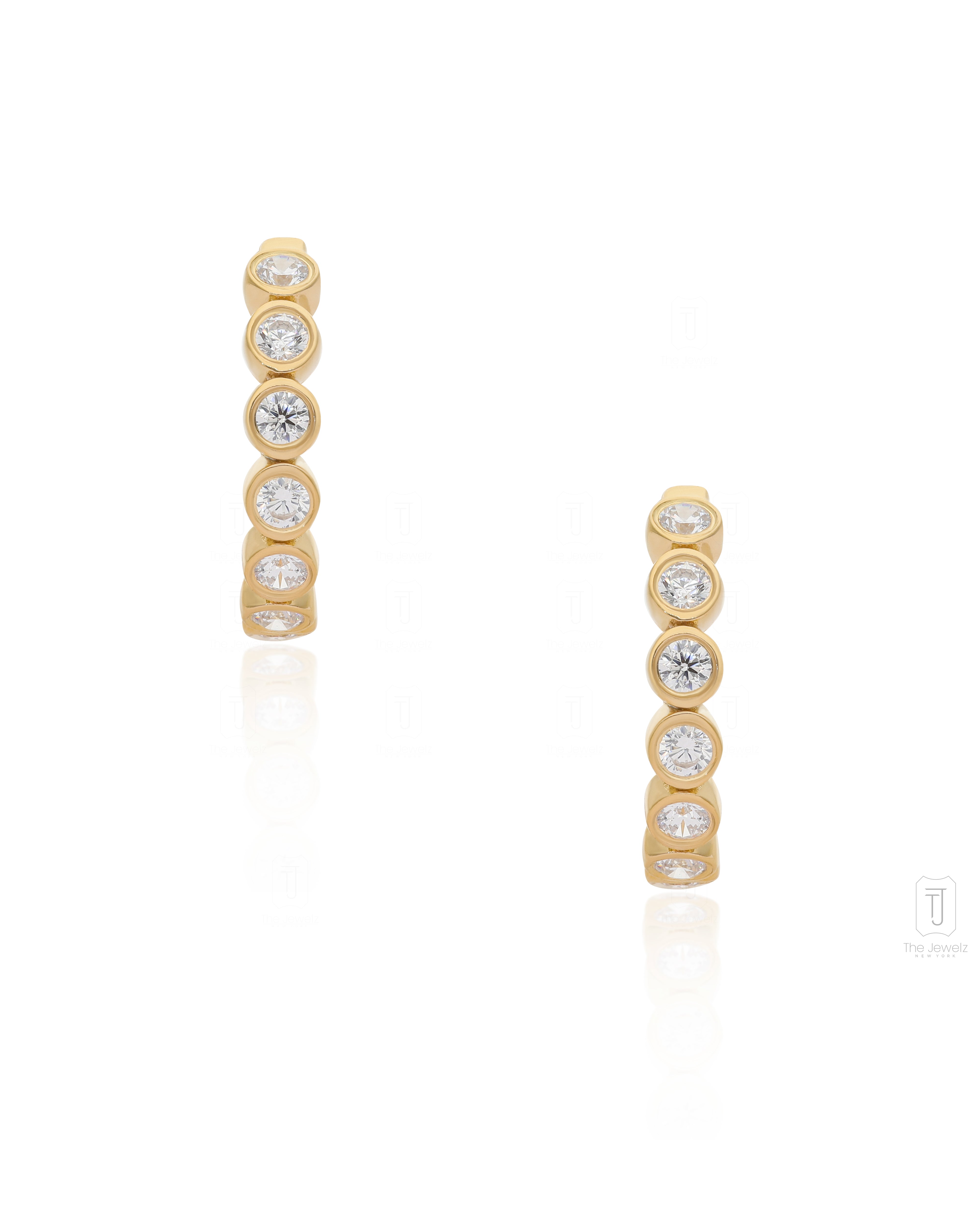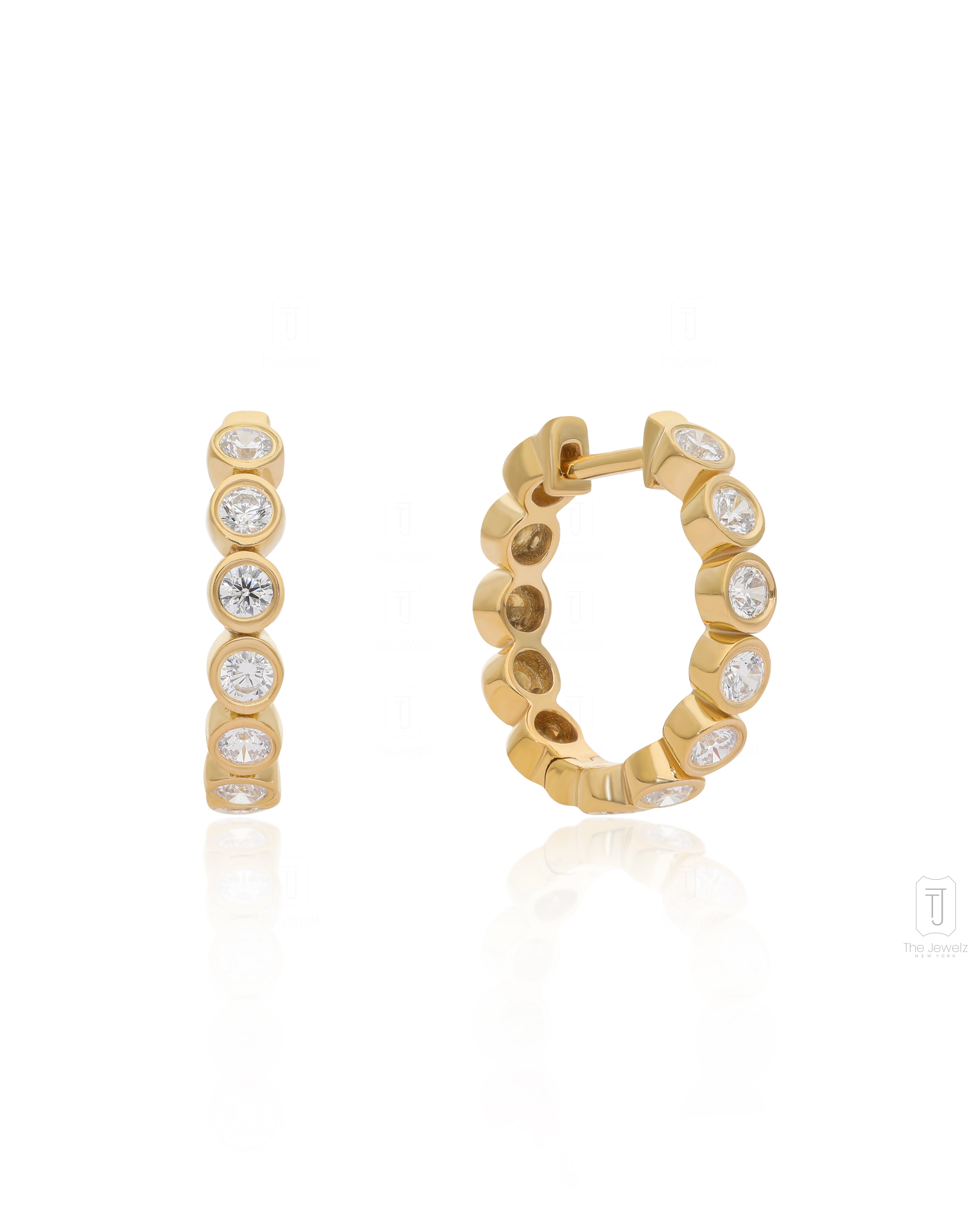Shine bright with these playful Cubic Zirconia Bezel Hoop Earrings! Made with high-quality CZ stones and 925 silver, these lightweight earrings are a perfect addition to your jewelry collection. With a dimension of 15 mm, they are the perfect size for everyday wear. Give your outfit a fun twist with these stylish hoops. (Gross Wt.-2.32 Gms., Metal Wt.-2.15 Gms., CZ Wt.-0.86 Ct.)