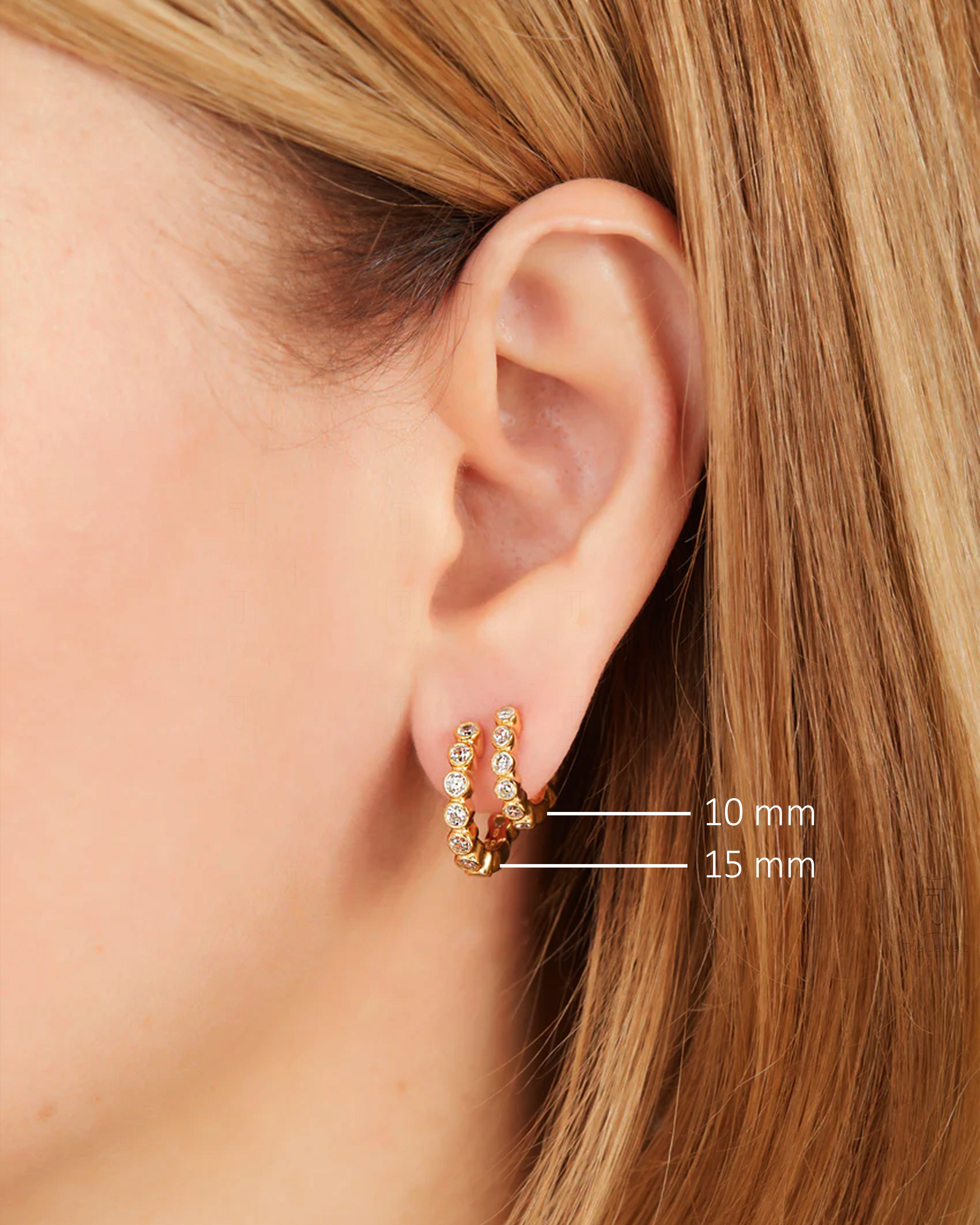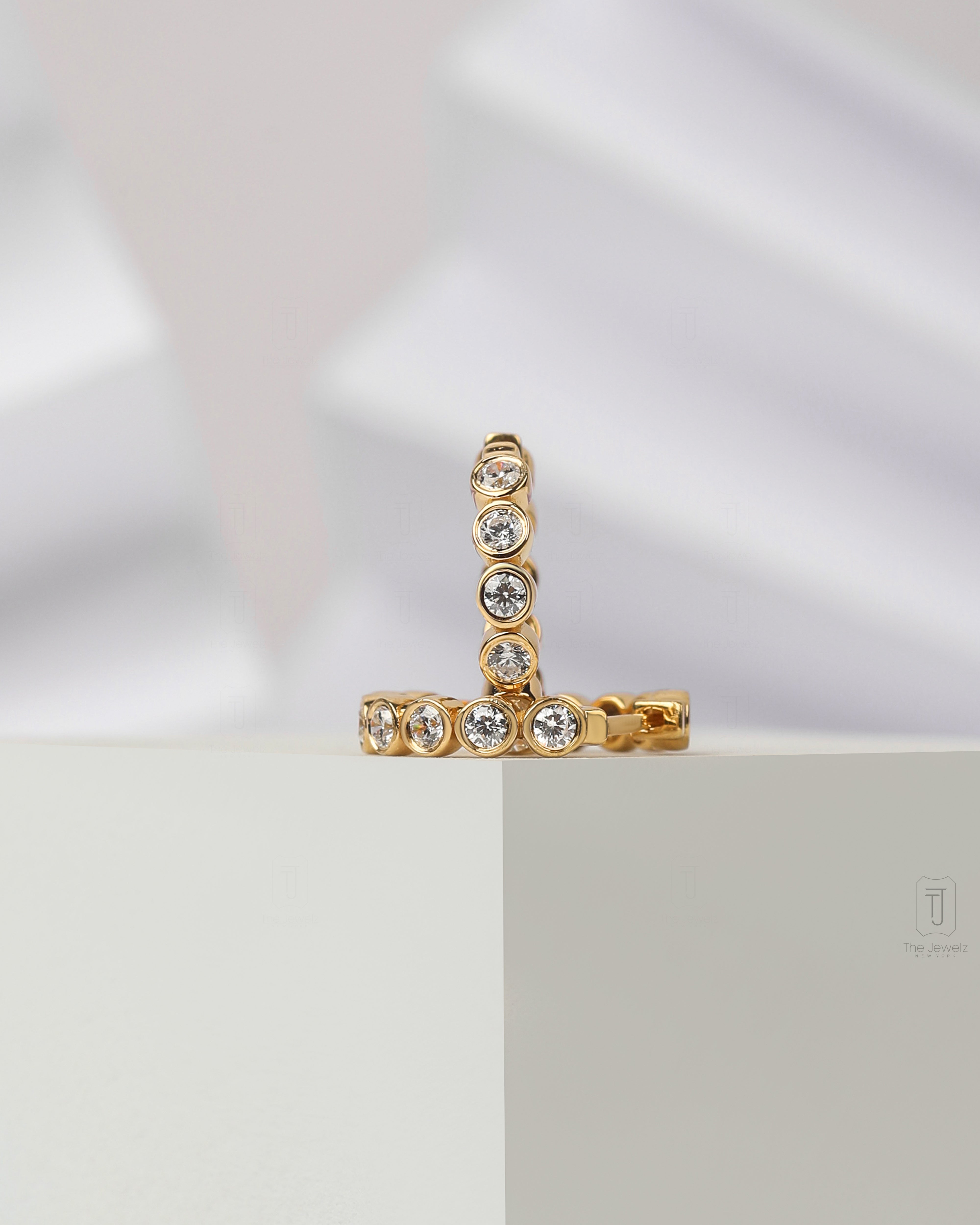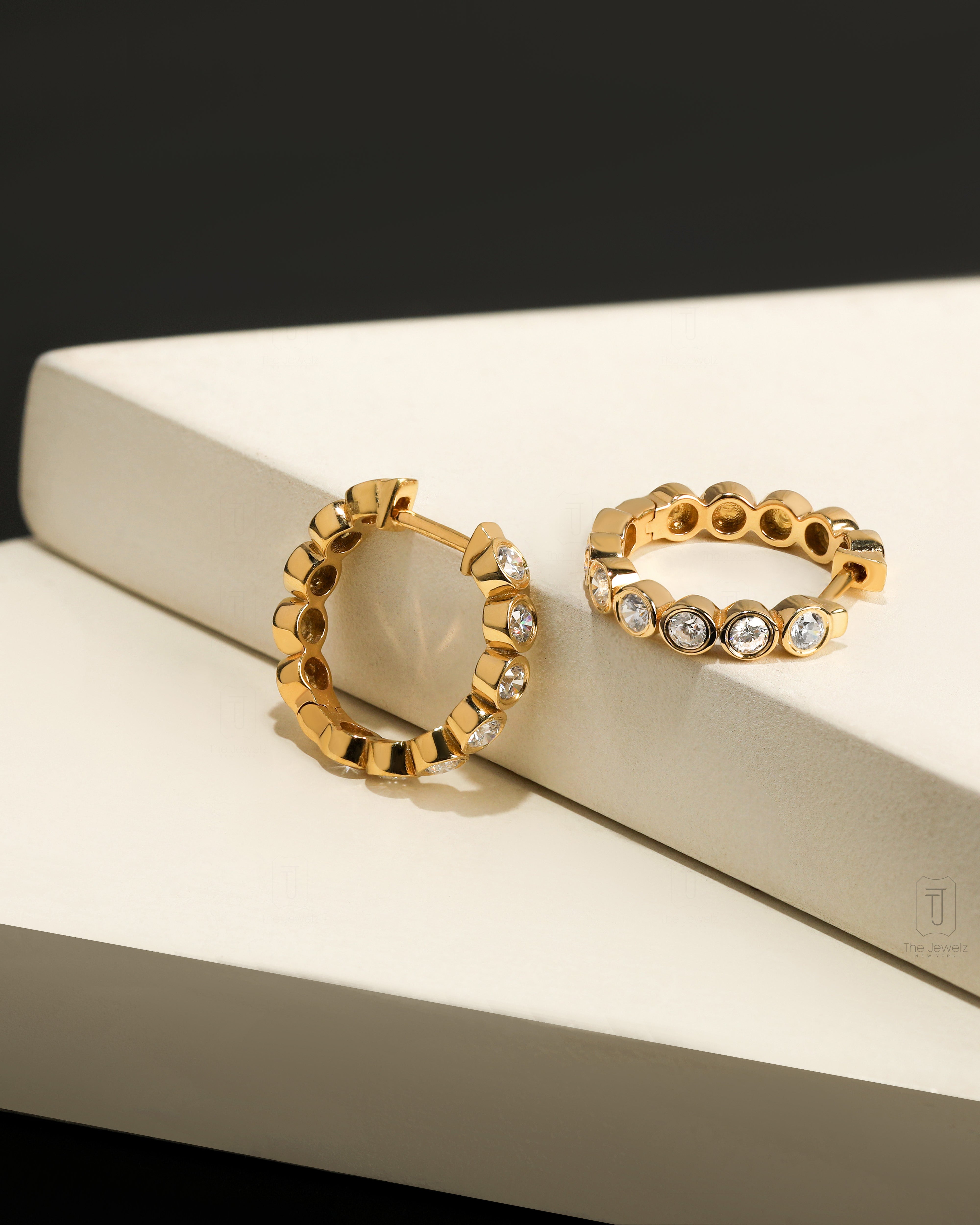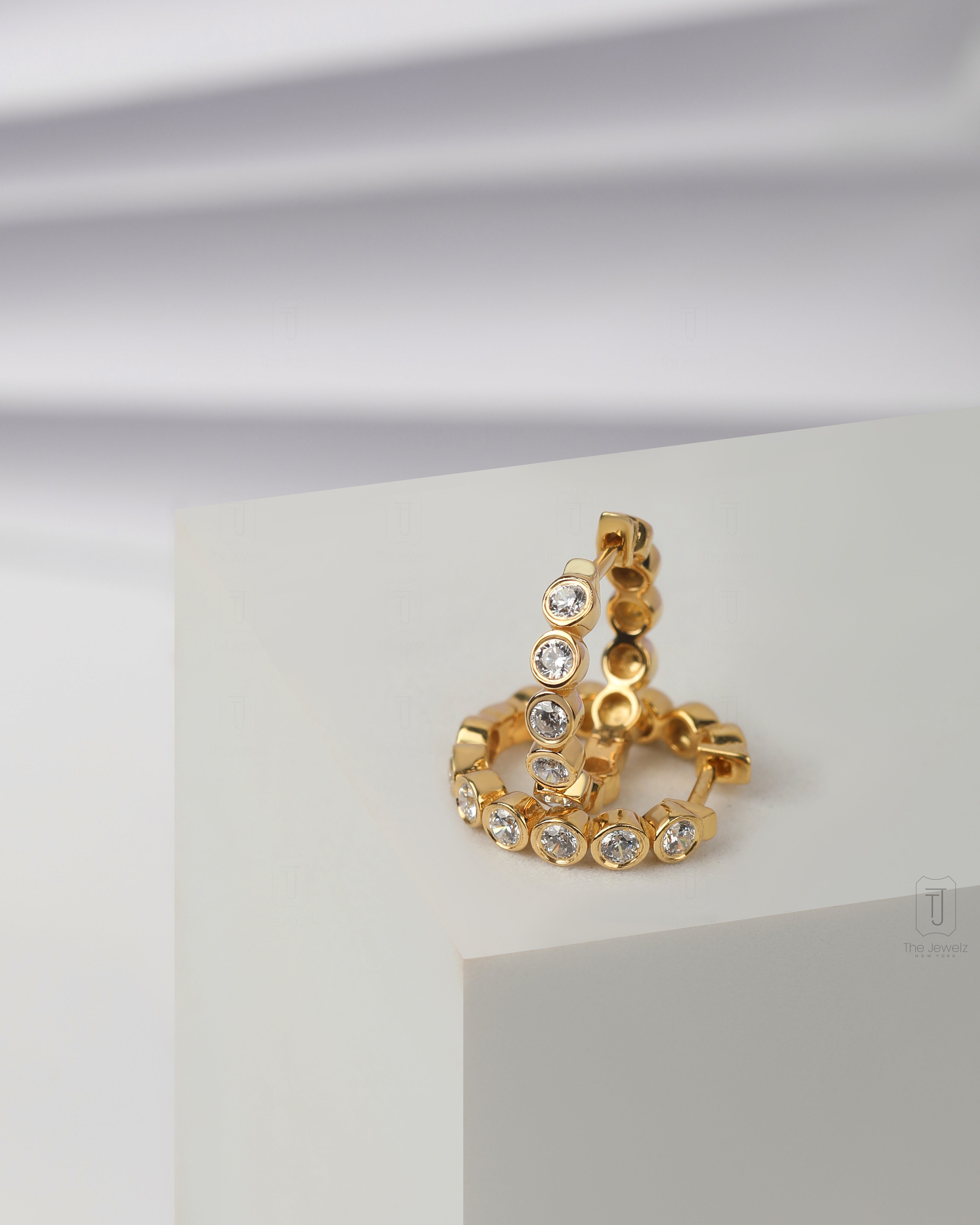 Shine bright with these playful Cubic Zirconia Bezel Hoop Earrings! Made with high-quality CZ stones and 925 silver, these lightweight earrings are a perfect addition to your jewelry collection. With a dimension of 15 mm, they are the perfect size for everyday wear. Give your outfit a fun twist with these stylish hoops. (Gross Wt.-2.32 Gms., Metal Wt.-2.15 Gms., CZ Wt.-0.86 Ct.)