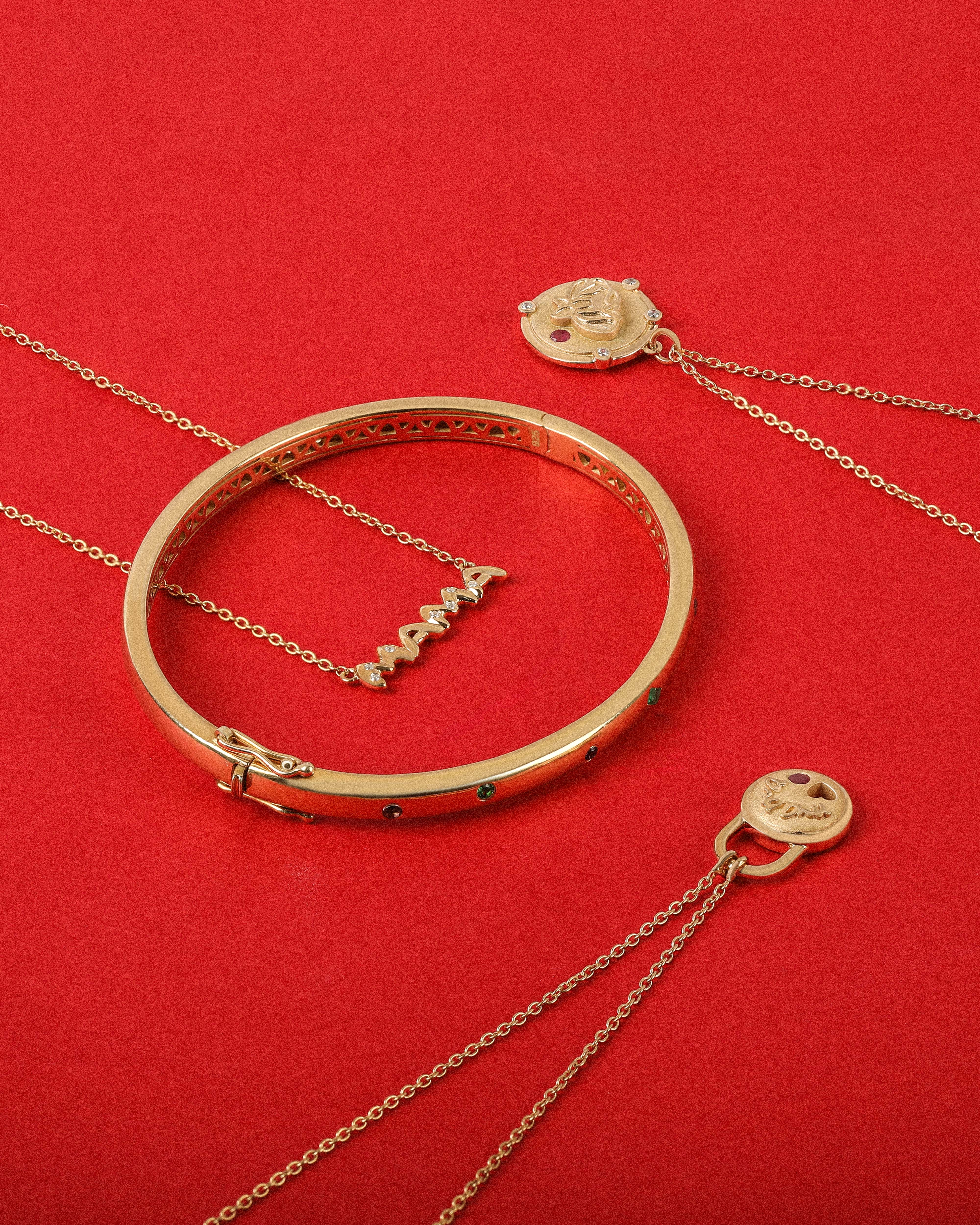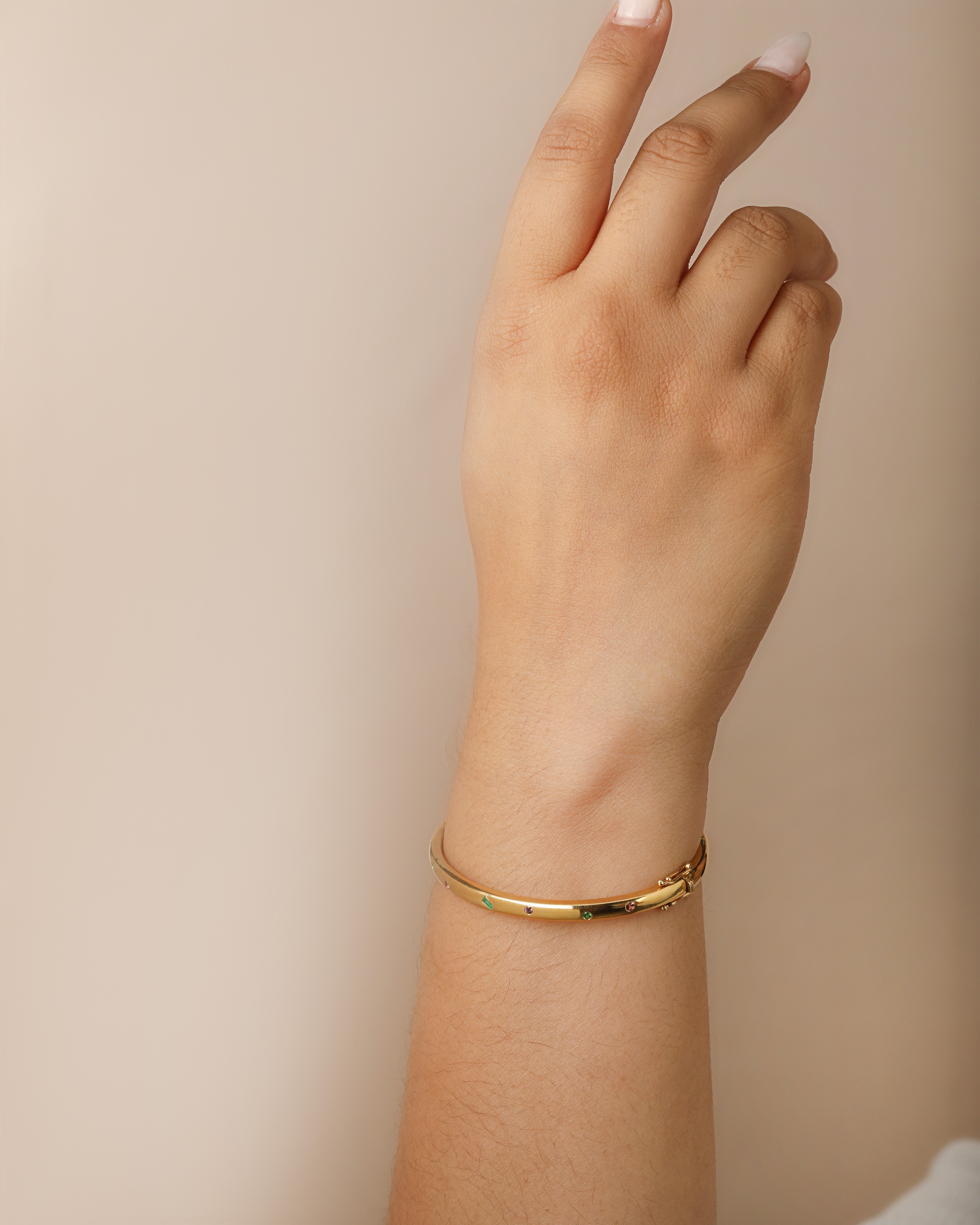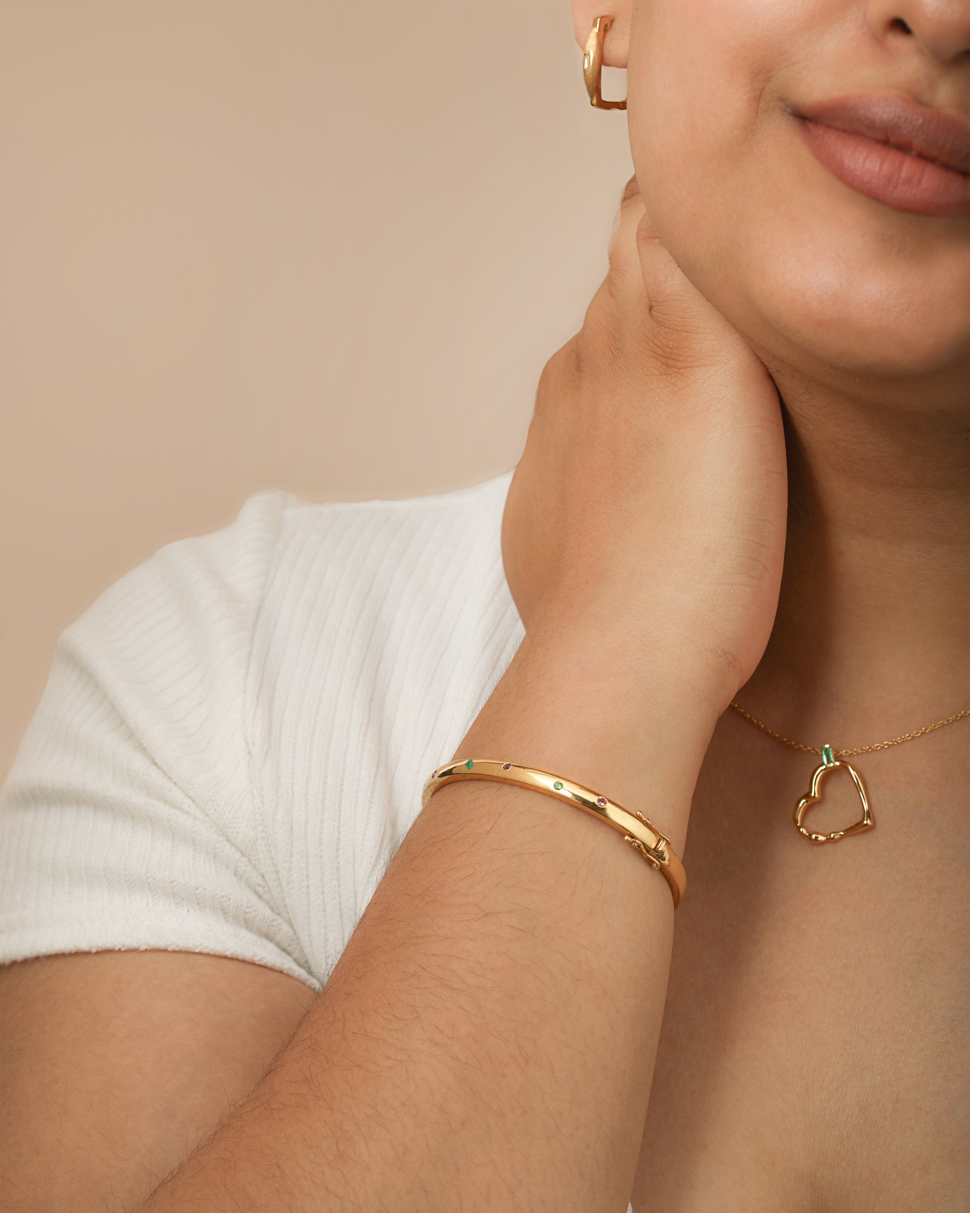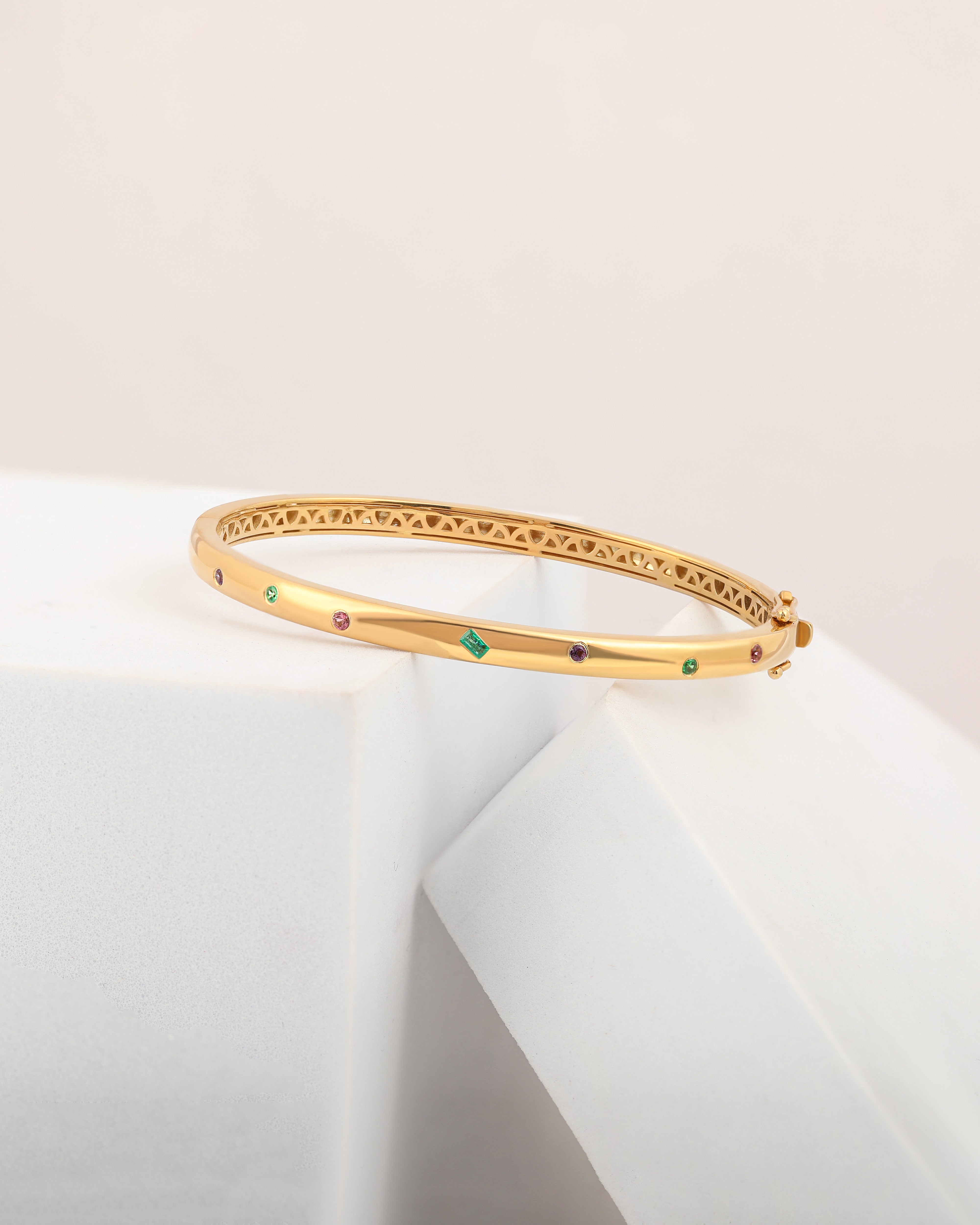 Get ready to add a pop of color and style to your wardrobe with the Eraya Rainbow Bangle! With a gross weight of 12.80 Gms and a dimension of 6.75 inches, this bangle is not only stunning but also lightweight and comfortable to wear. Made with a metal weight of 12.75 Gms and featuring 0.24 Ct. gemstones, this bangle is a true gem. (Talk about serious arm candy!)