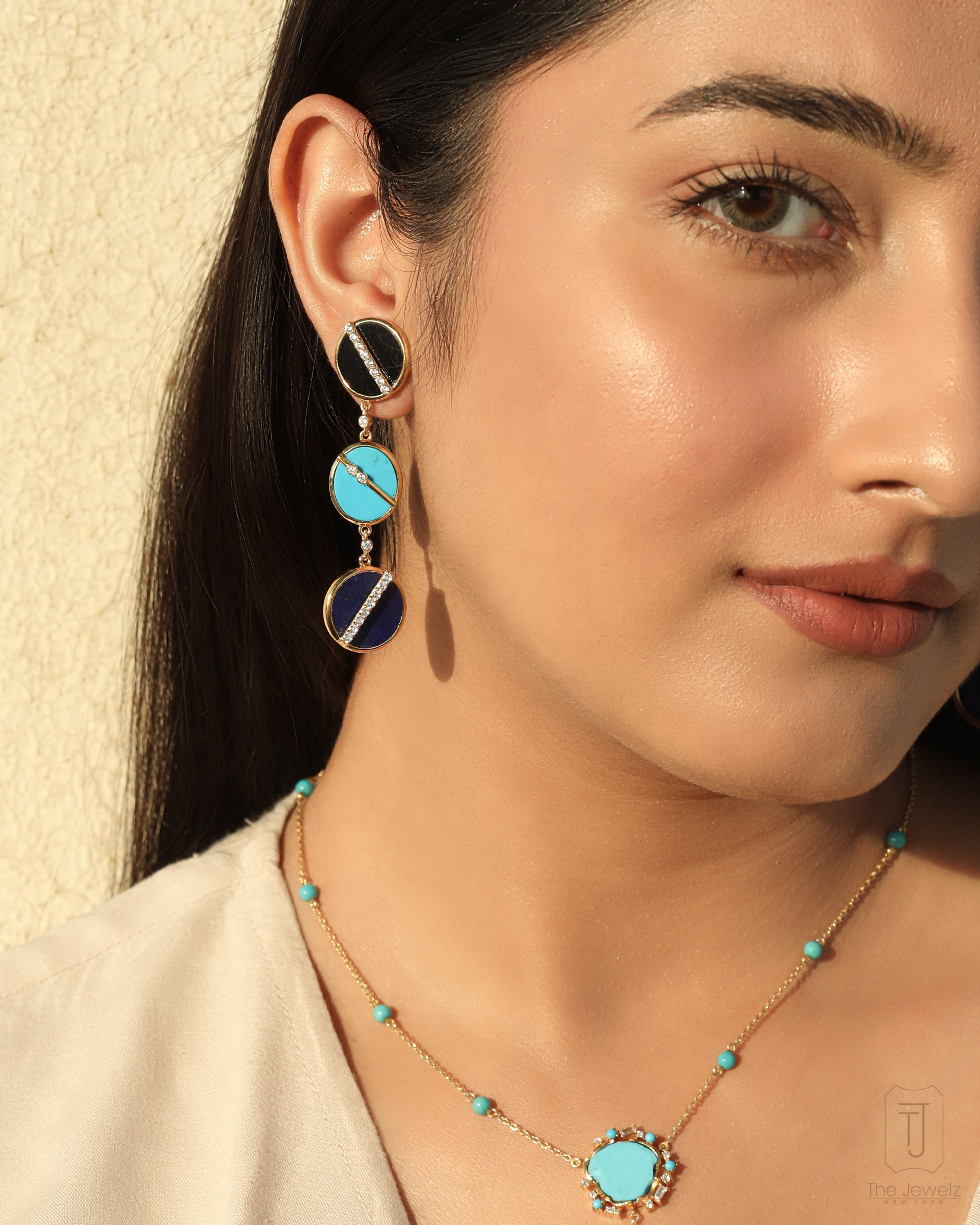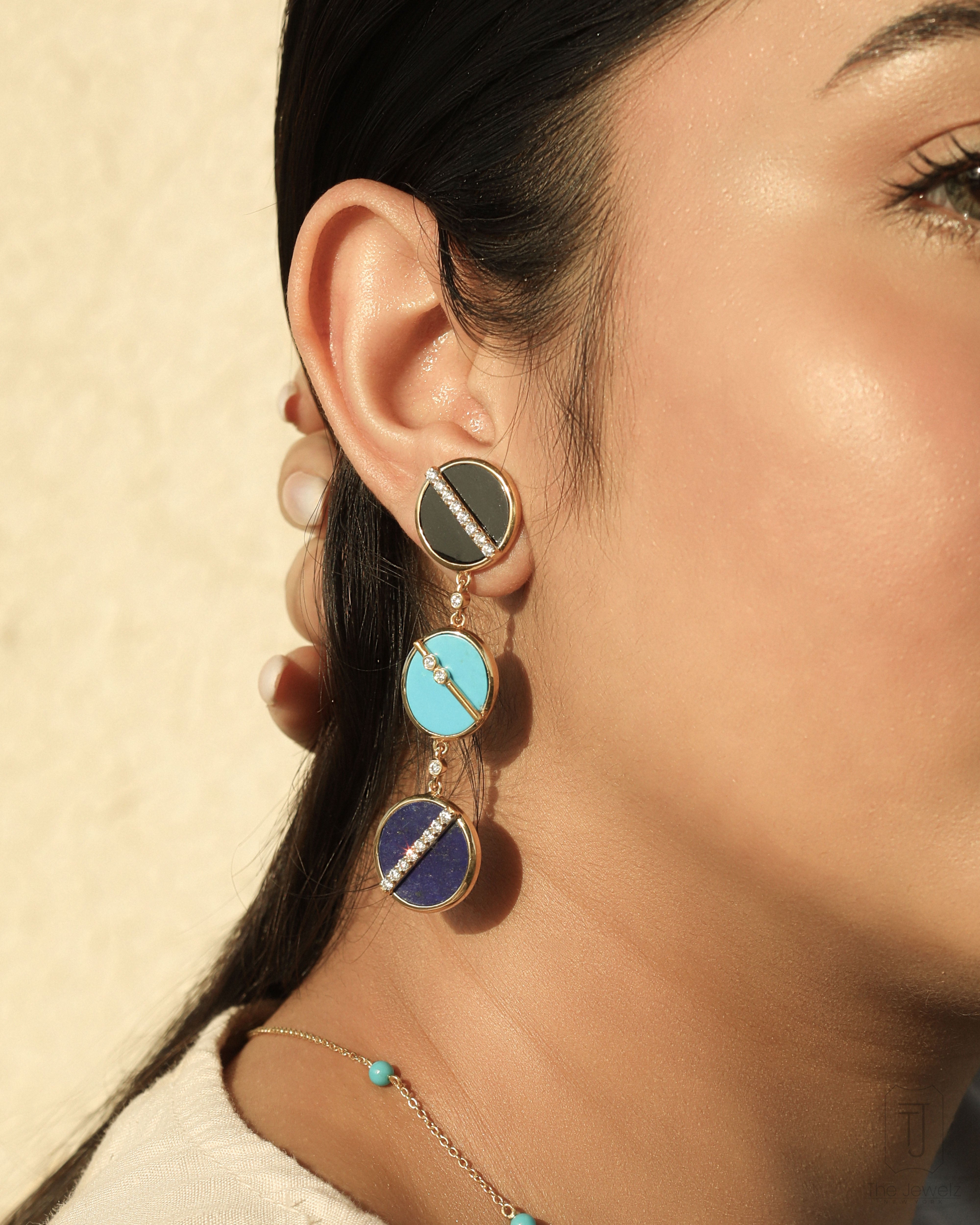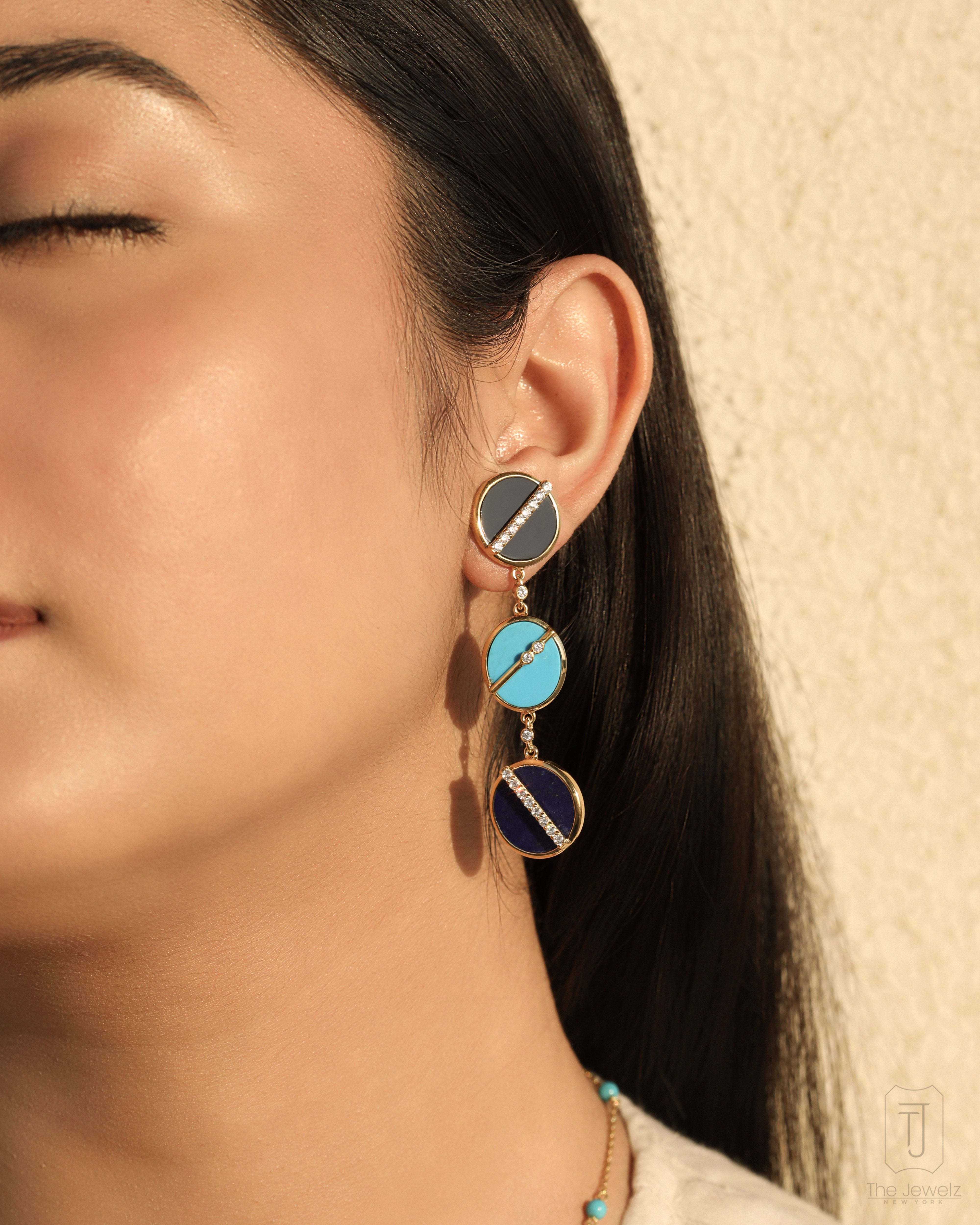 With a trio of bold discs of onyx black, turquoise blue, and lapis, kissed by a diagonal line of glittering diamonds, Harmony Drop Earrings are like a perfectly tuned melody—smooth, balanced, and unforgettable. These earrings don’t just hang—they sway, catching every ounce of light in the room. Whether you’re hitting the dance floor, or that dreamy candlelit dinner, the Harmony Drop Earrings will have everyone saying, ‘What’s your secret?’