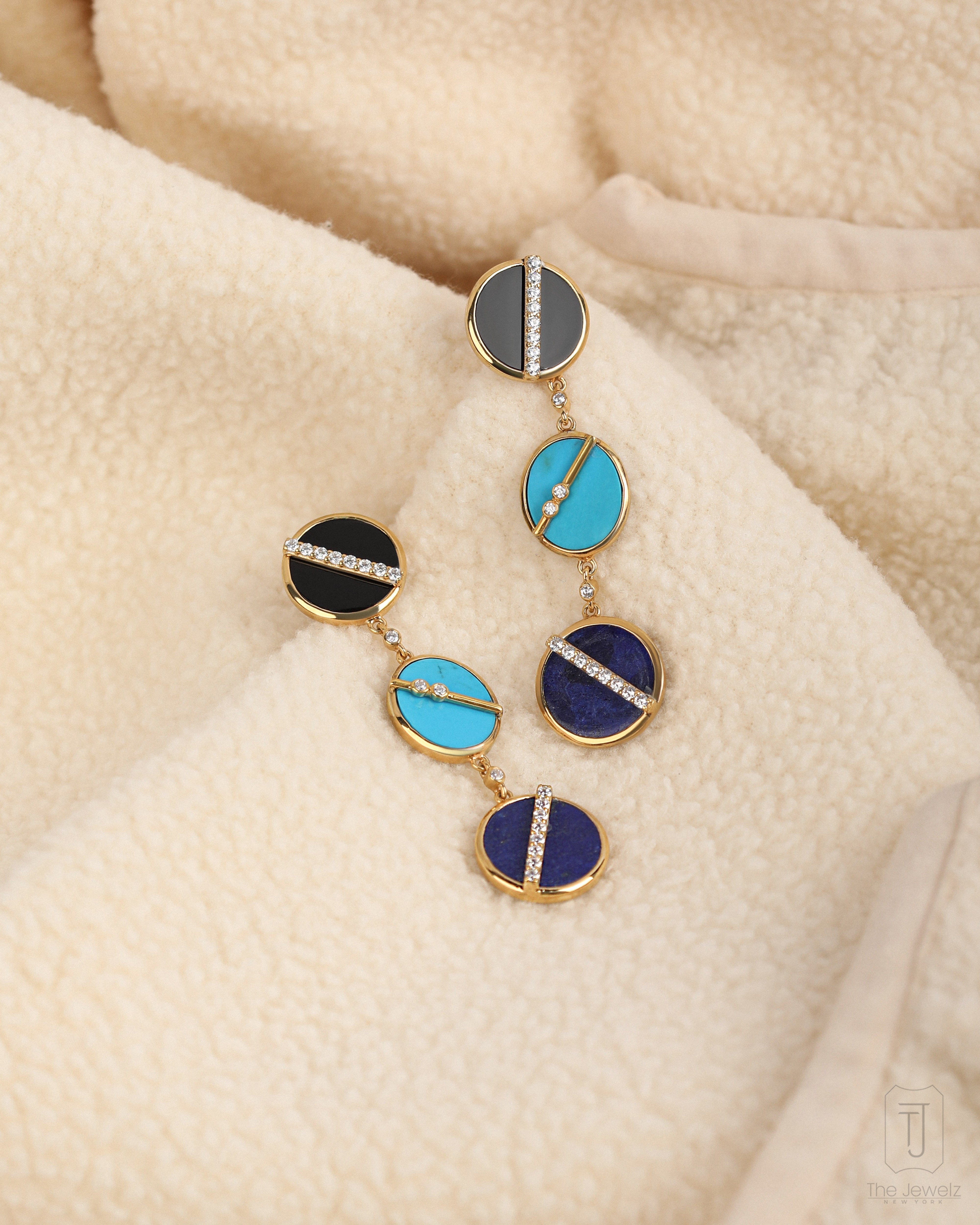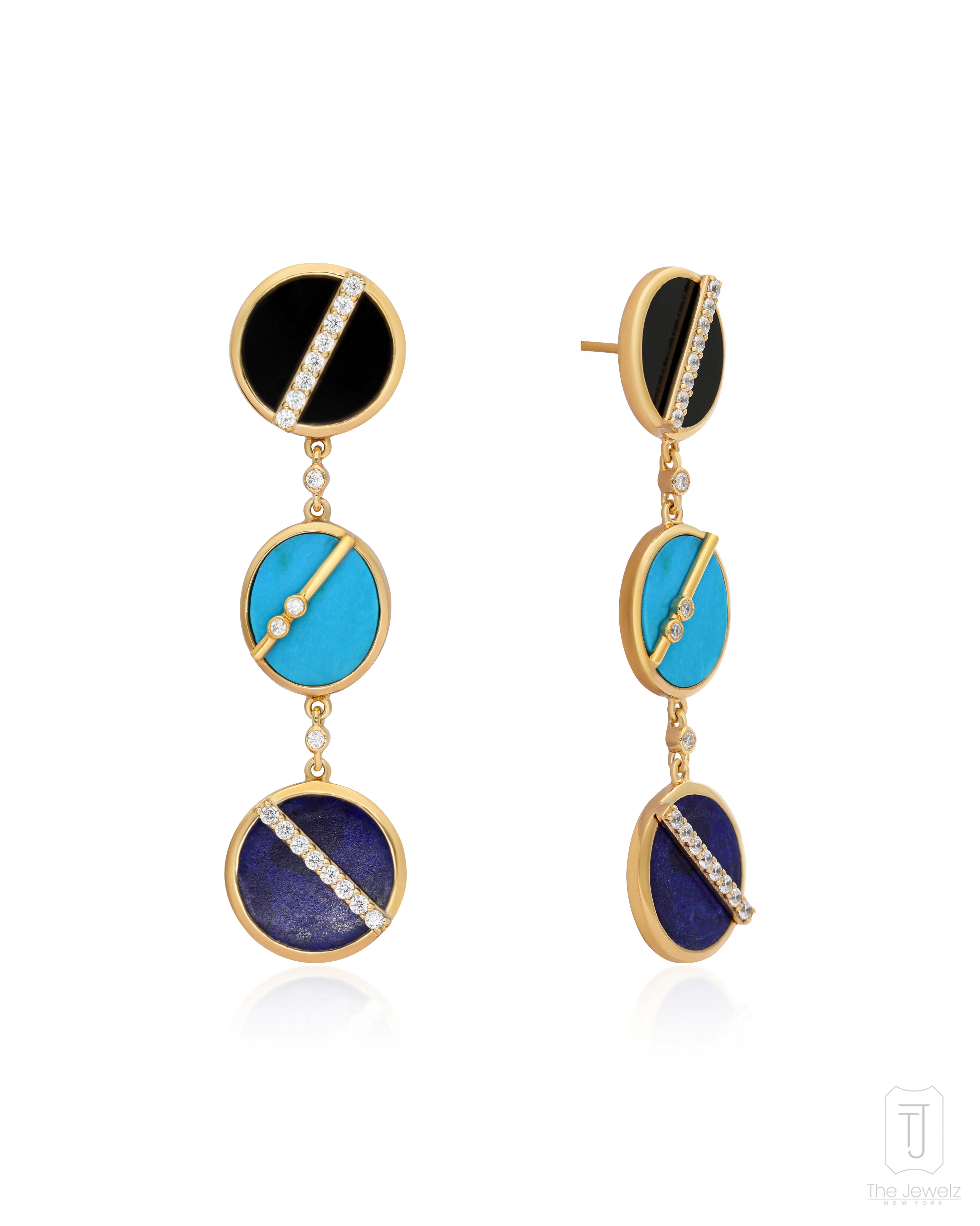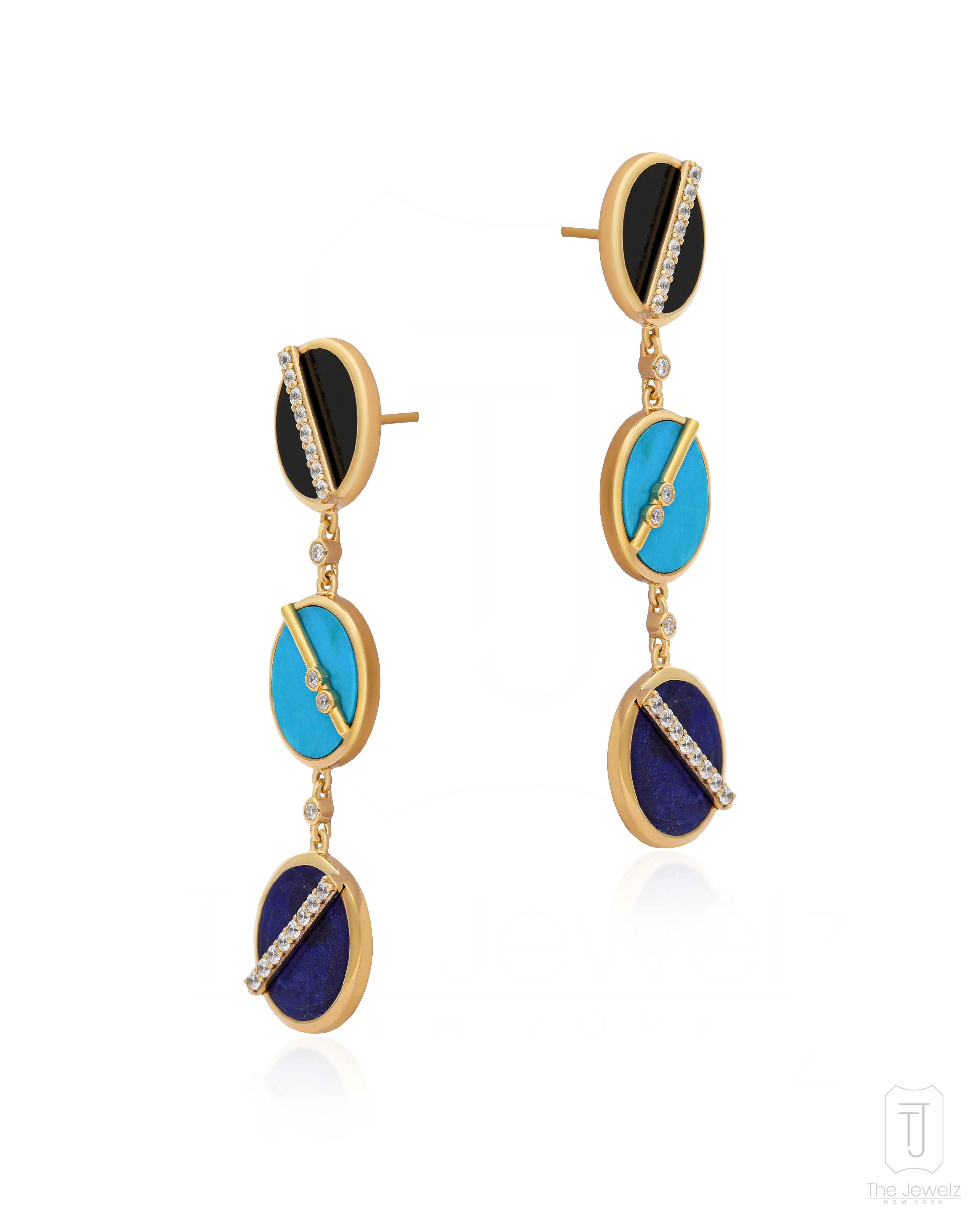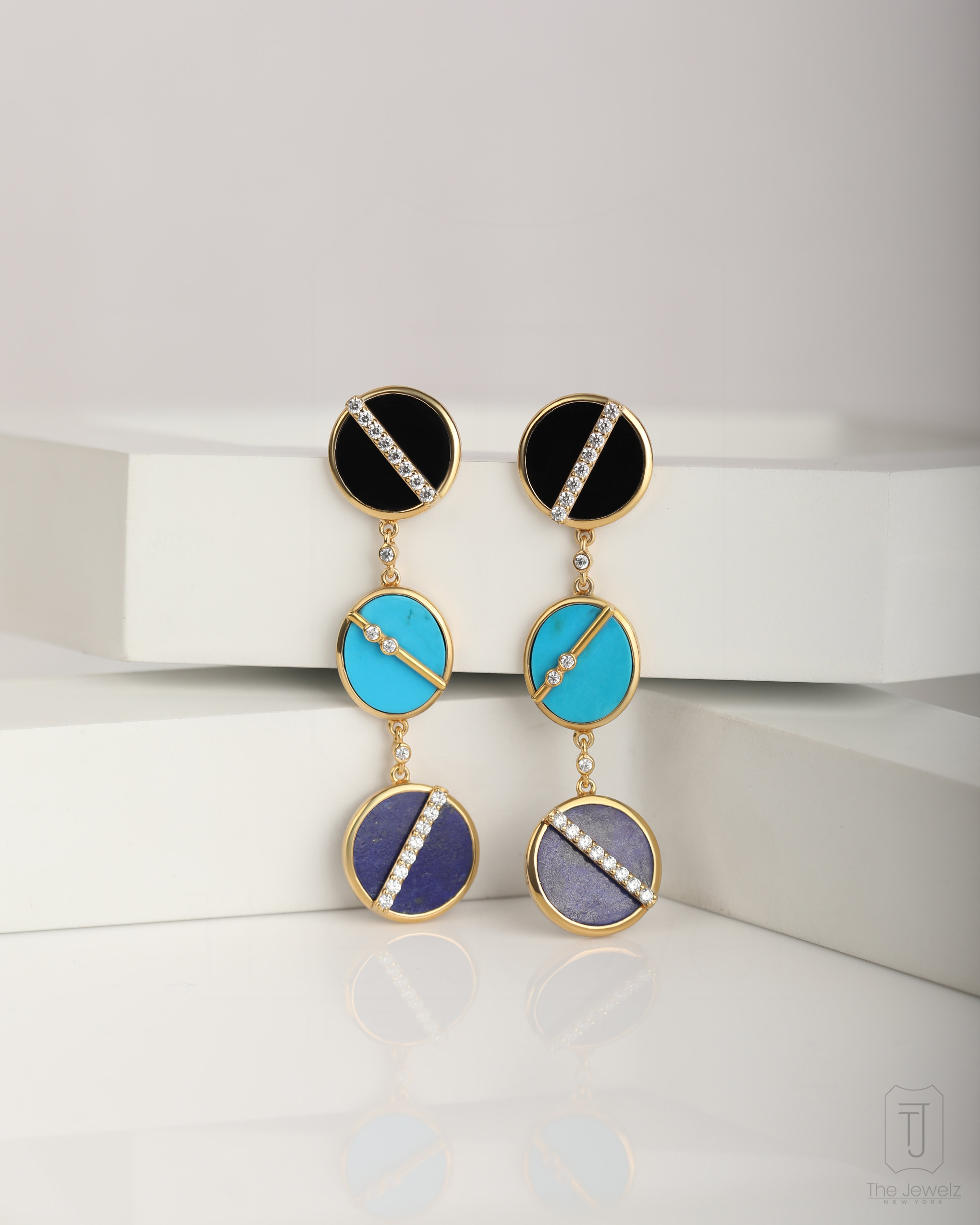 With a trio of bold discs of onyx black, turquoise blue, and lapis, kissed by a diagonal line of glittering diamonds, Harmony Drop Earrings are like a perfectly tuned melody—smooth, balanced, and unforgettable. These earrings don’t just hang—they sway, catching every ounce of light in the room. Whether you’re hitting the dance floor, or that dreamy candlelit dinner, the Harmony Drop Earrings will have everyone saying, ‘What’s your secret?’
