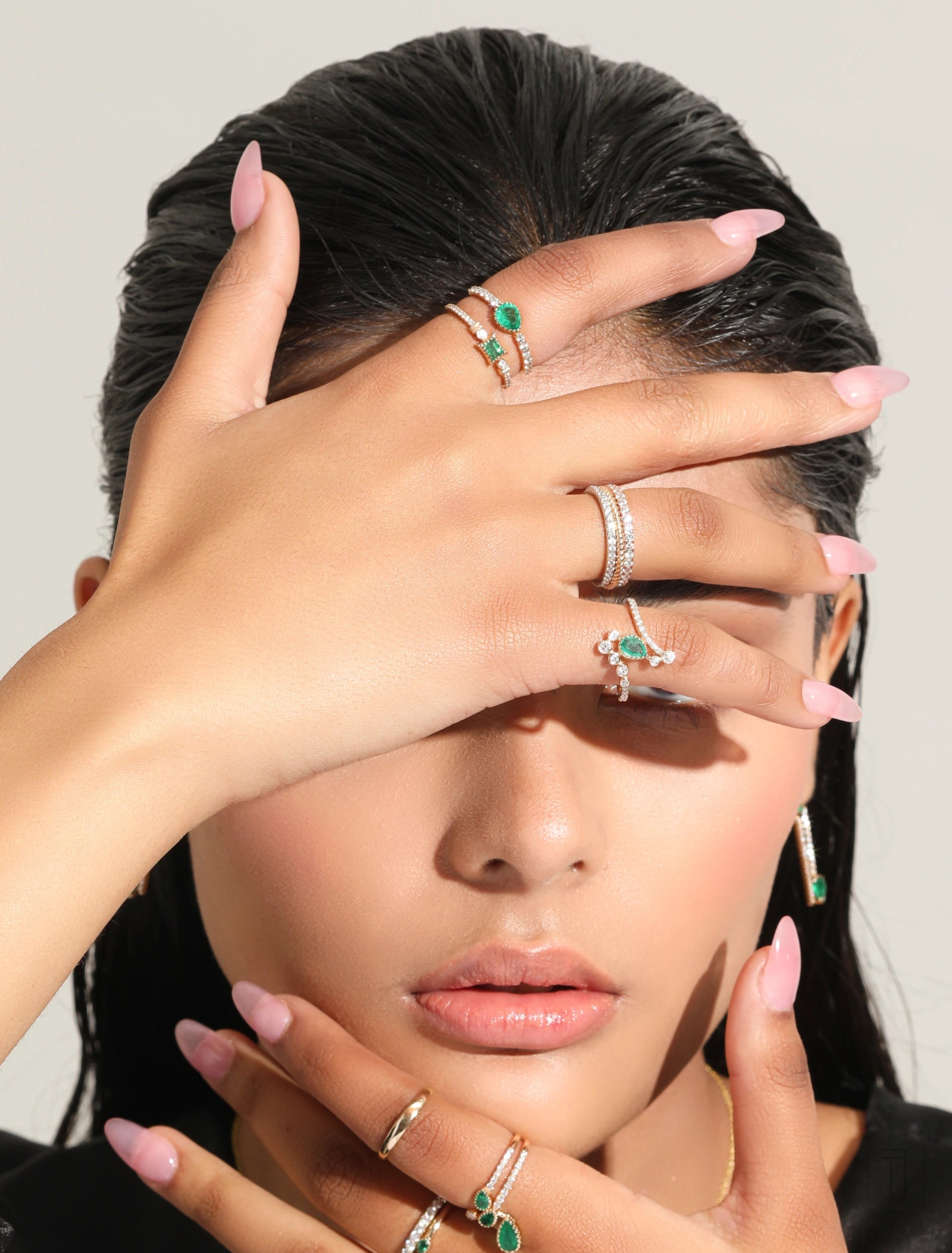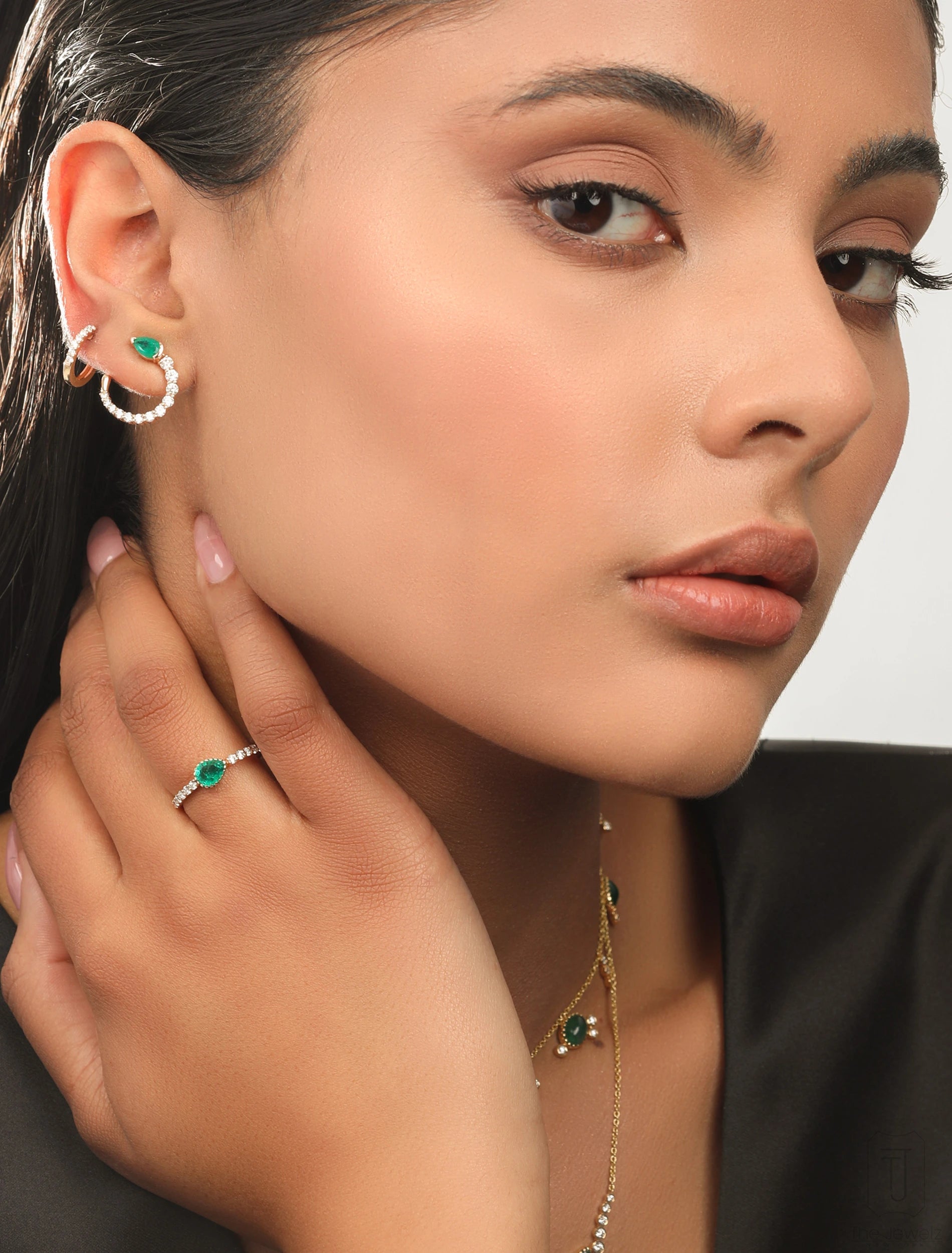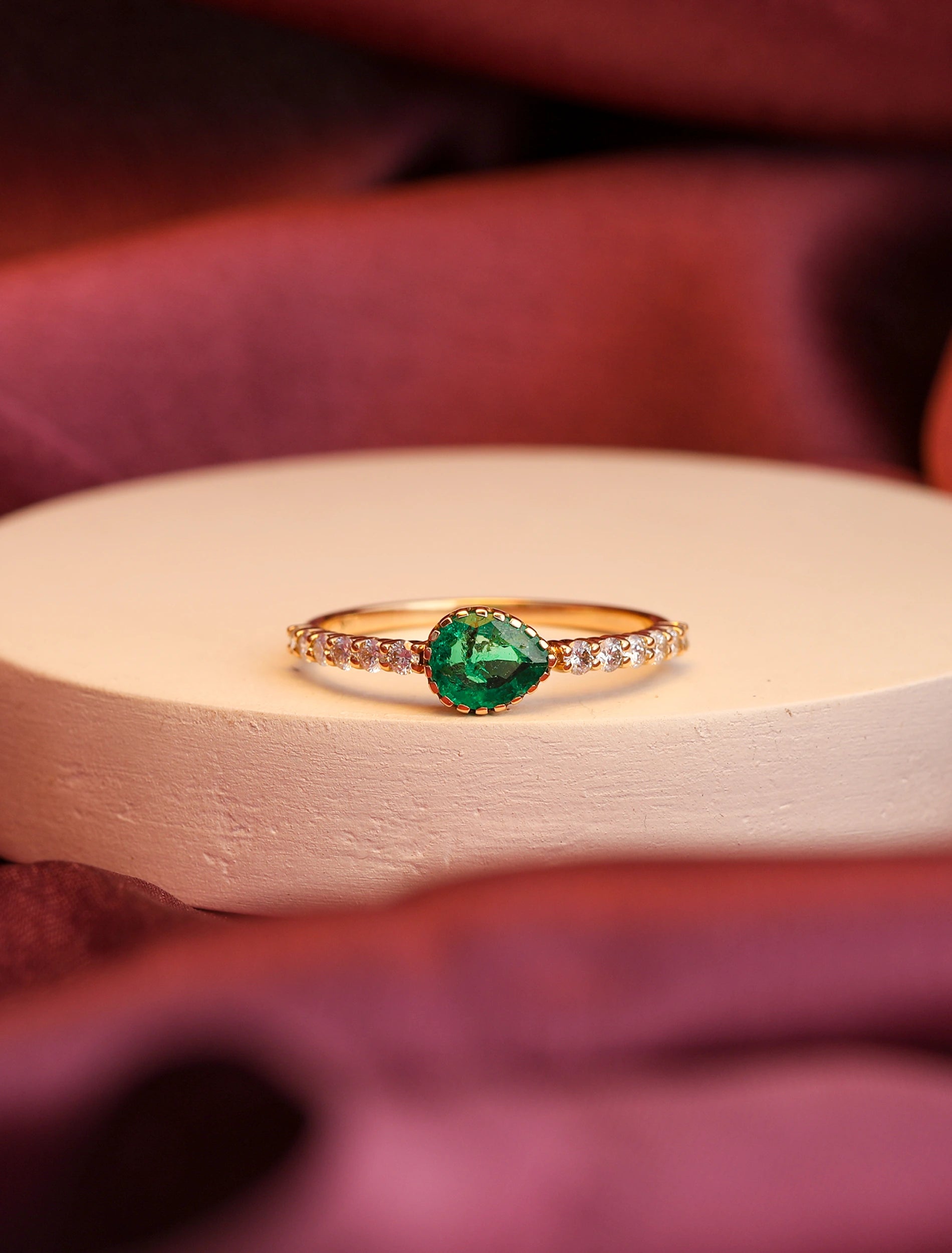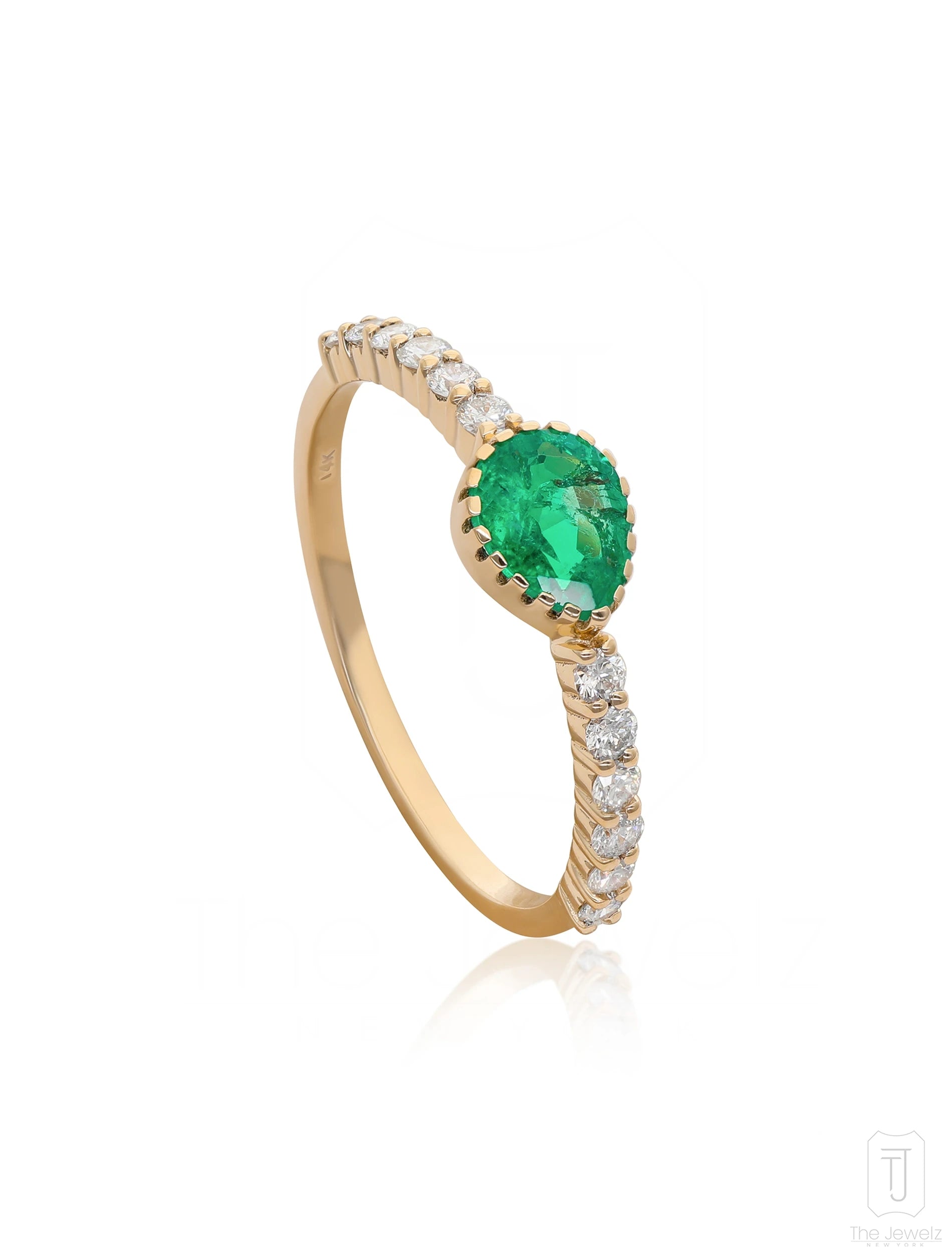 The Aurai Siren Ring features a pear-cut Columbian Emerald set in the center, surrounded by a row of sparkling diamonds. The perfect accessory for any special occasion.