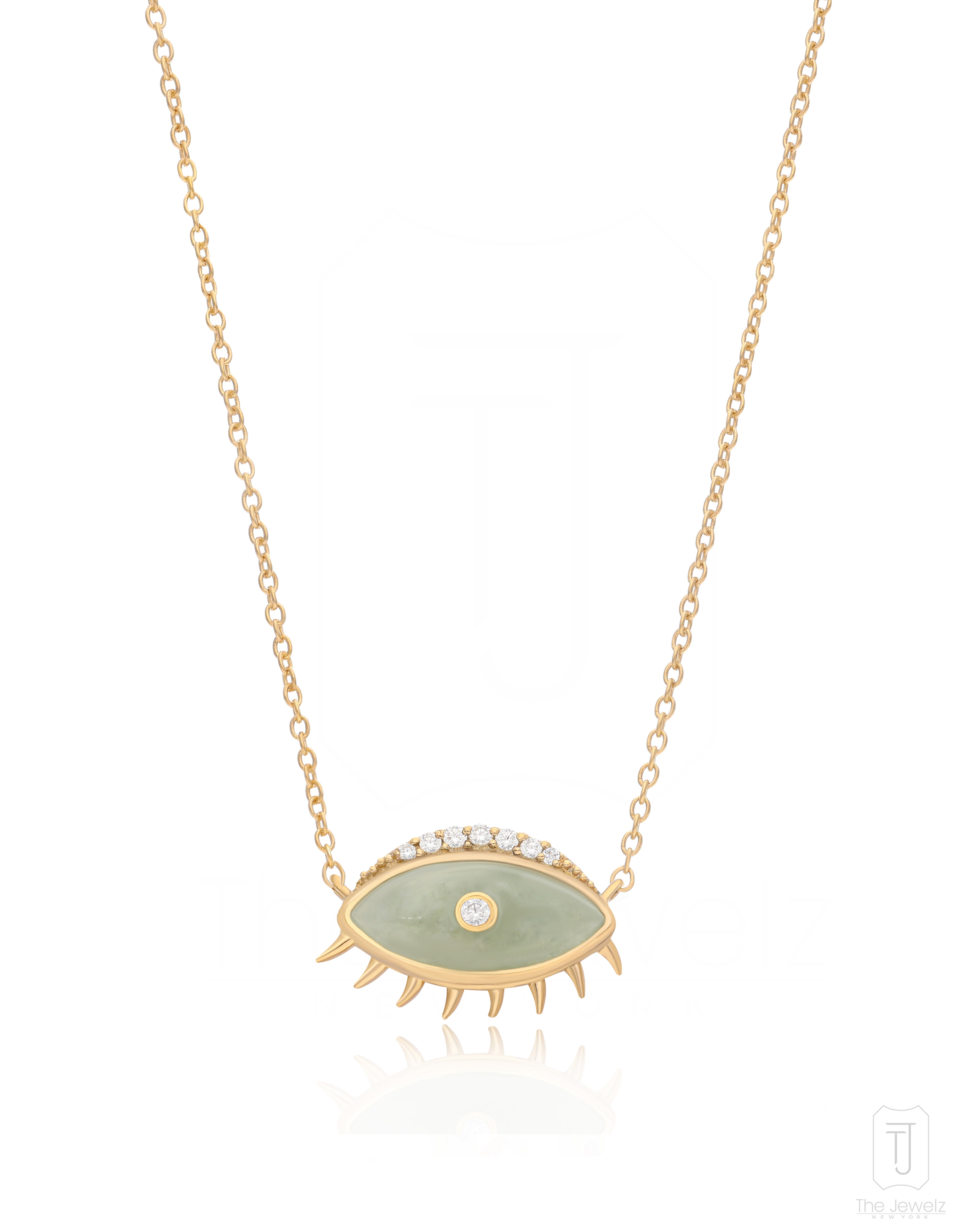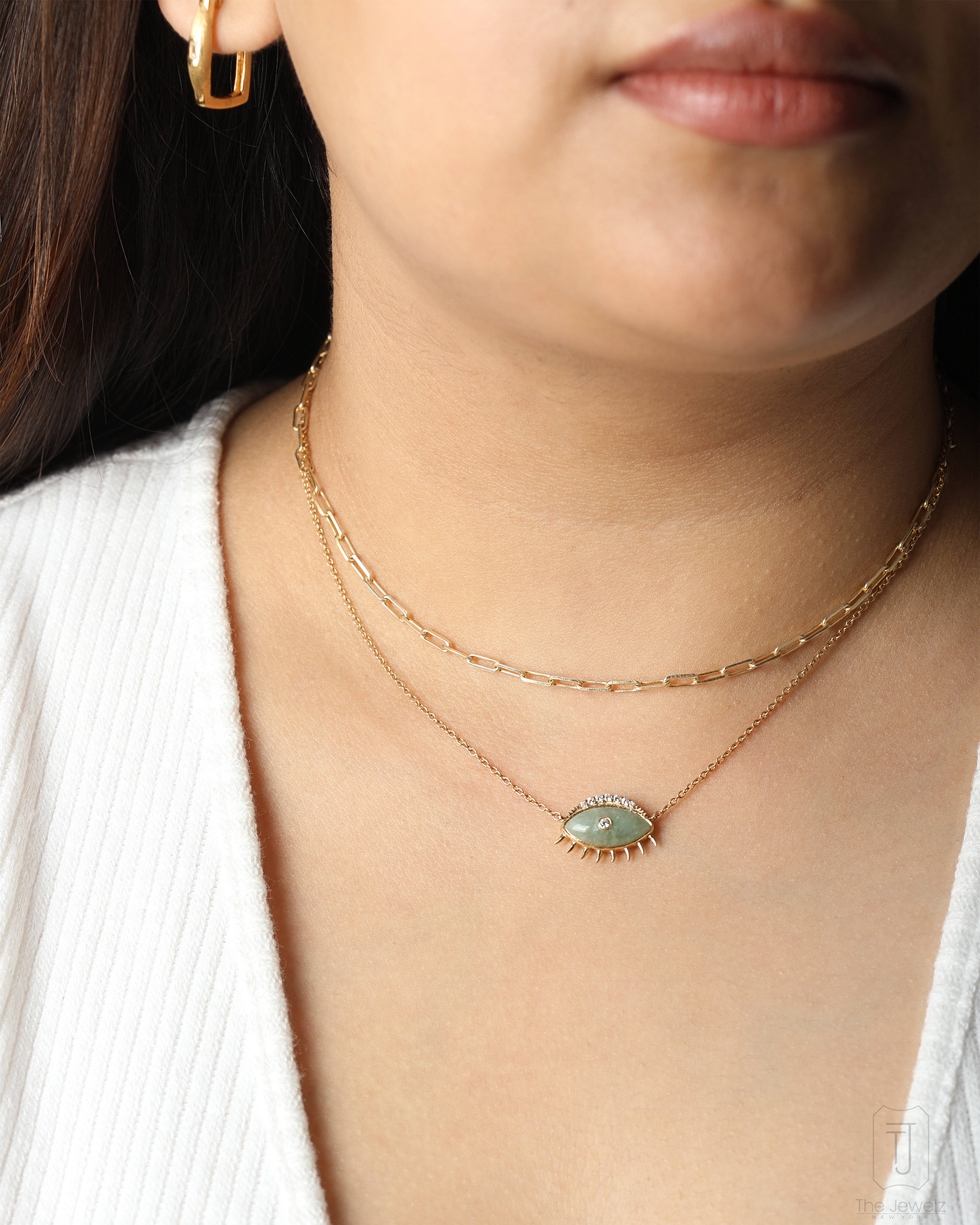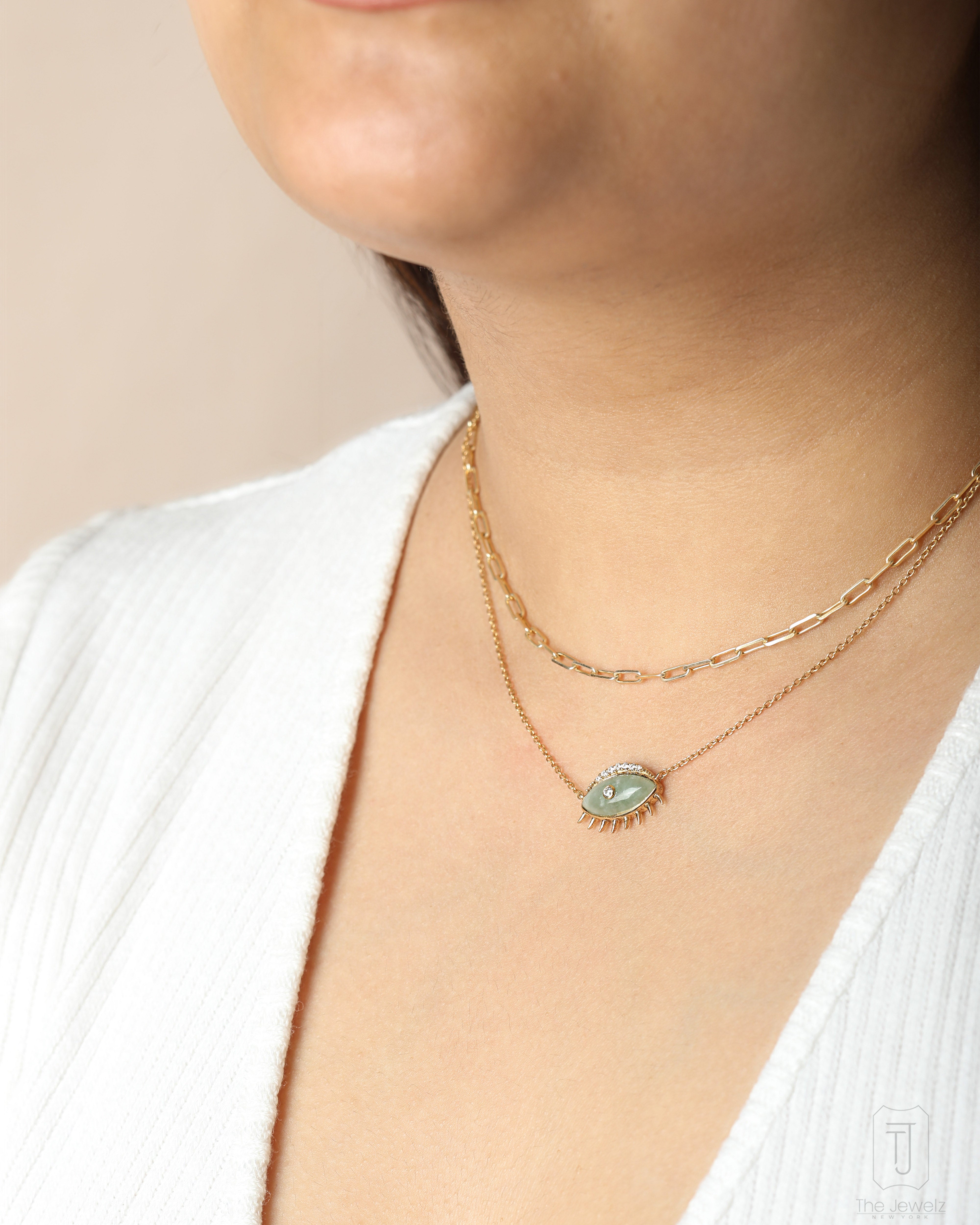 Product experts recommend Eraya's Evil Eye Pendant, weighing 3.21 Gms and adorned with a stunning 3.50 Ct. Aventurine cabochon marquise, for a delicate yet bold accessory. The 16 inch chain adds an additional touch of elegance, boasting a sturdy metal weight of 2.46 Gms.