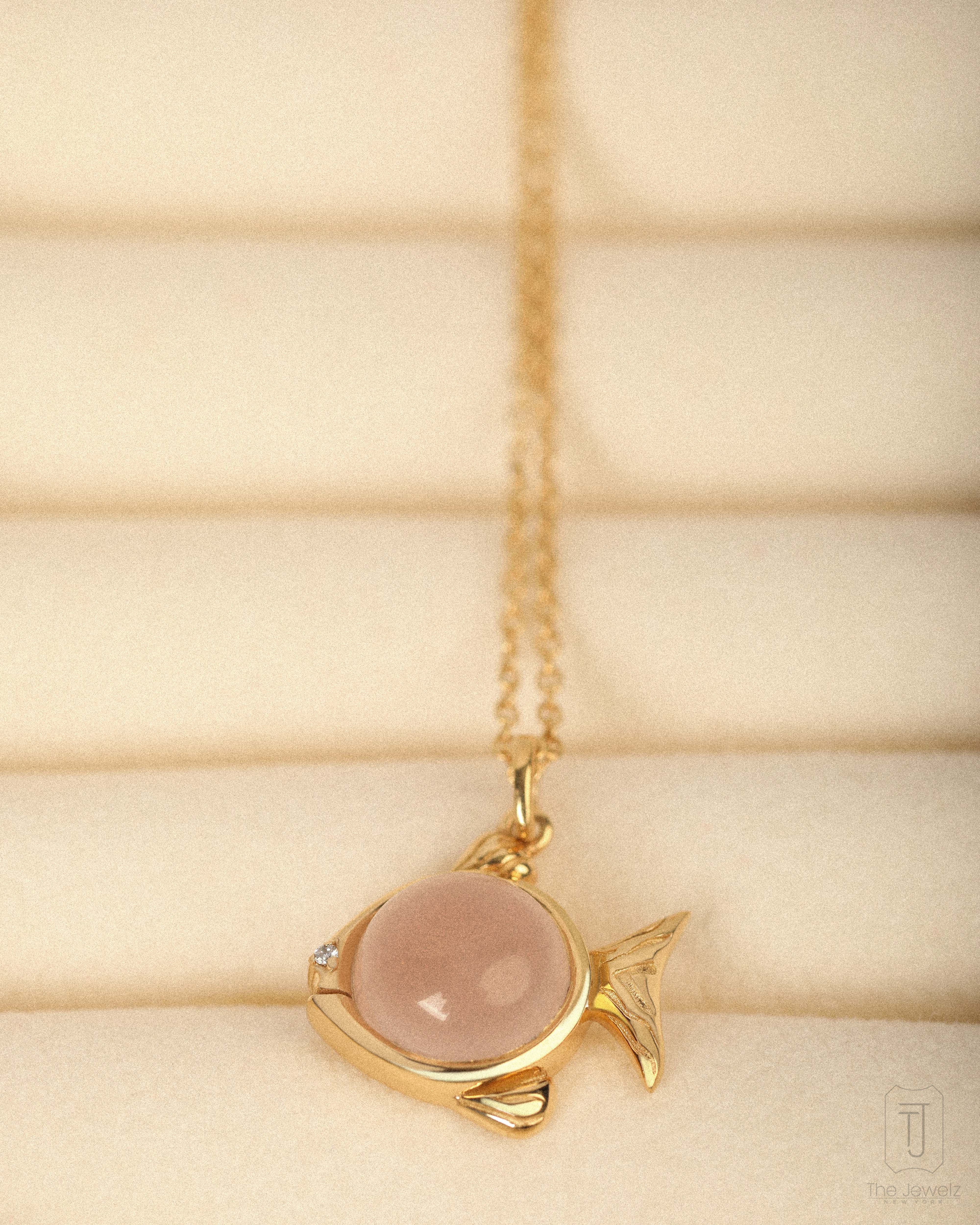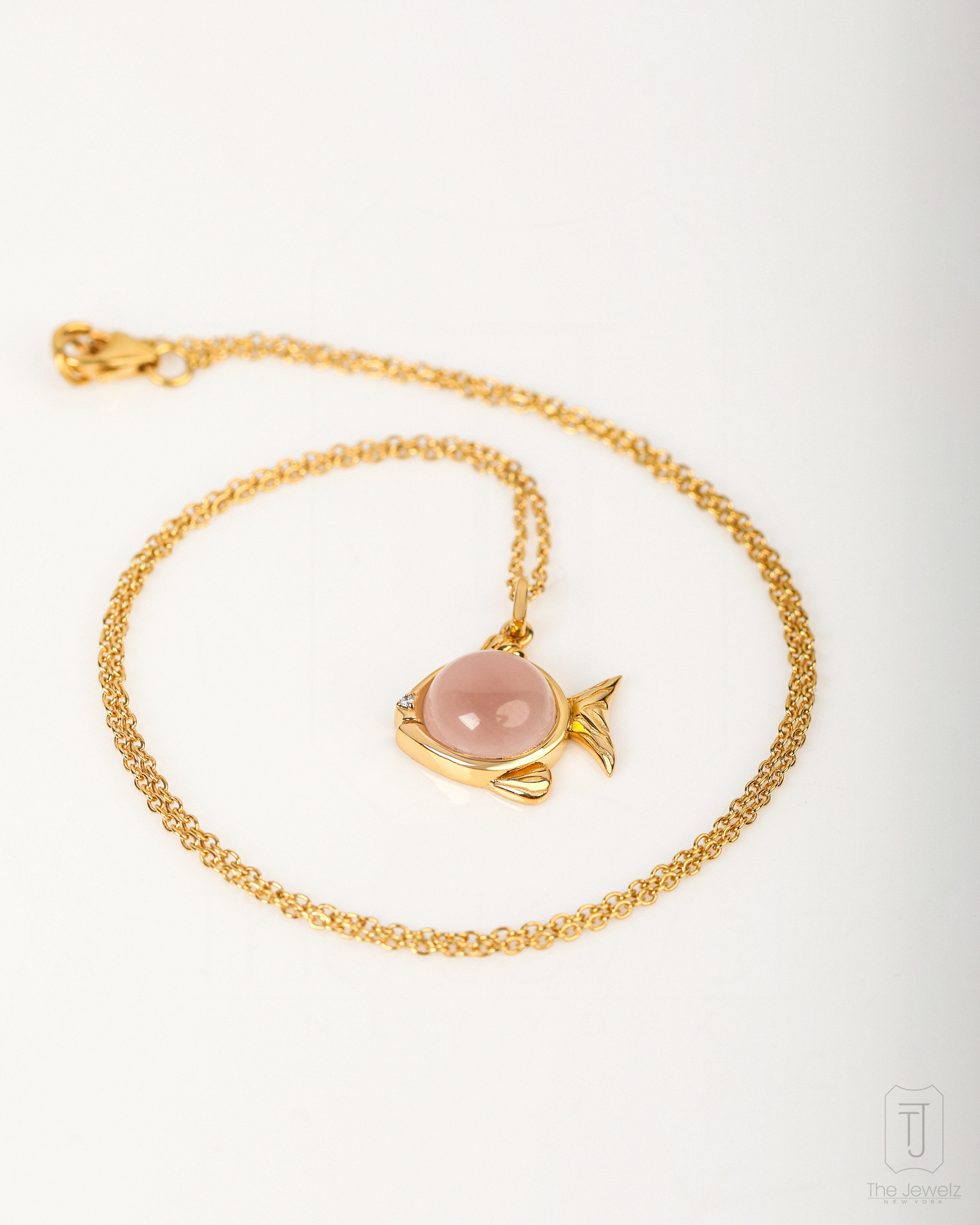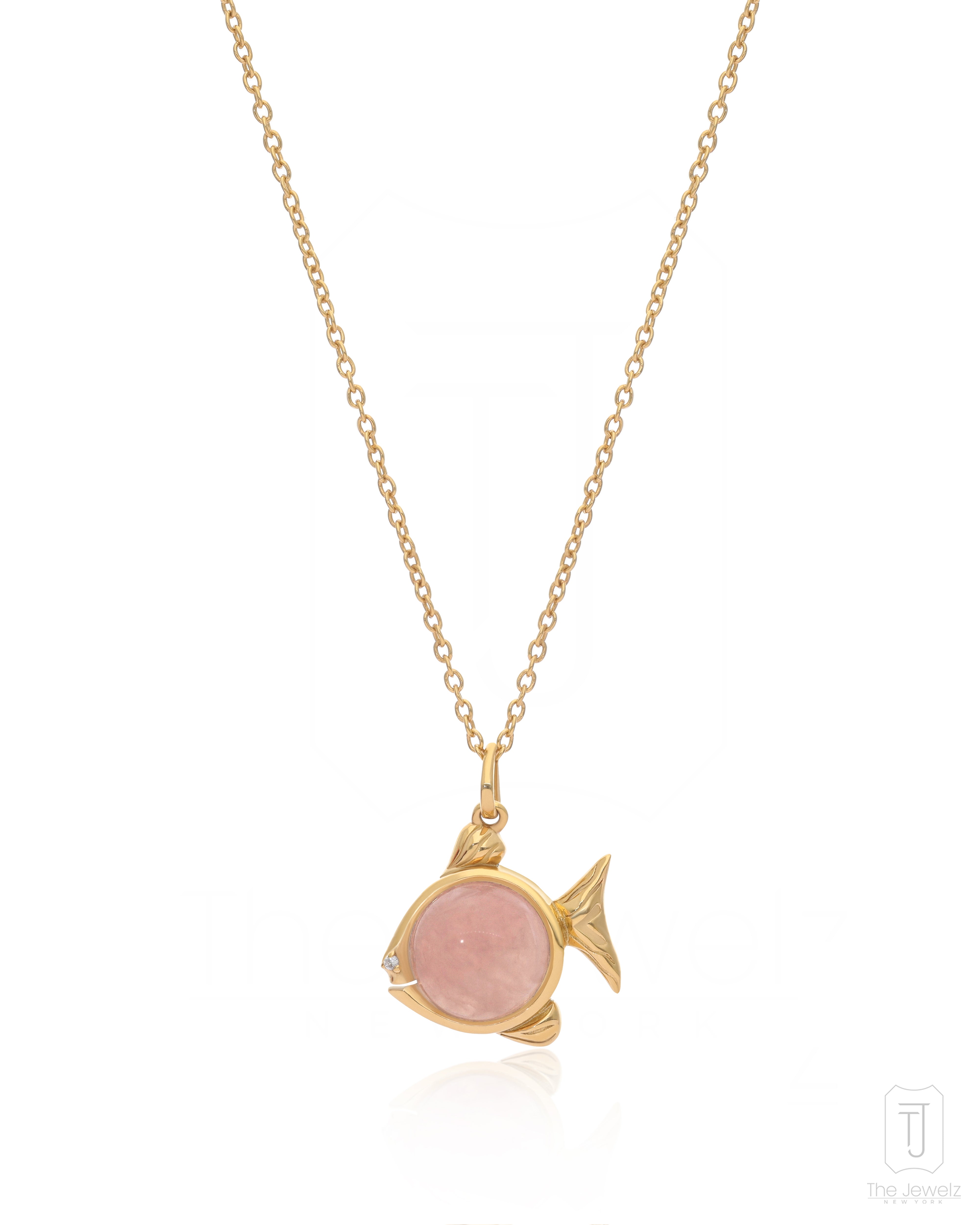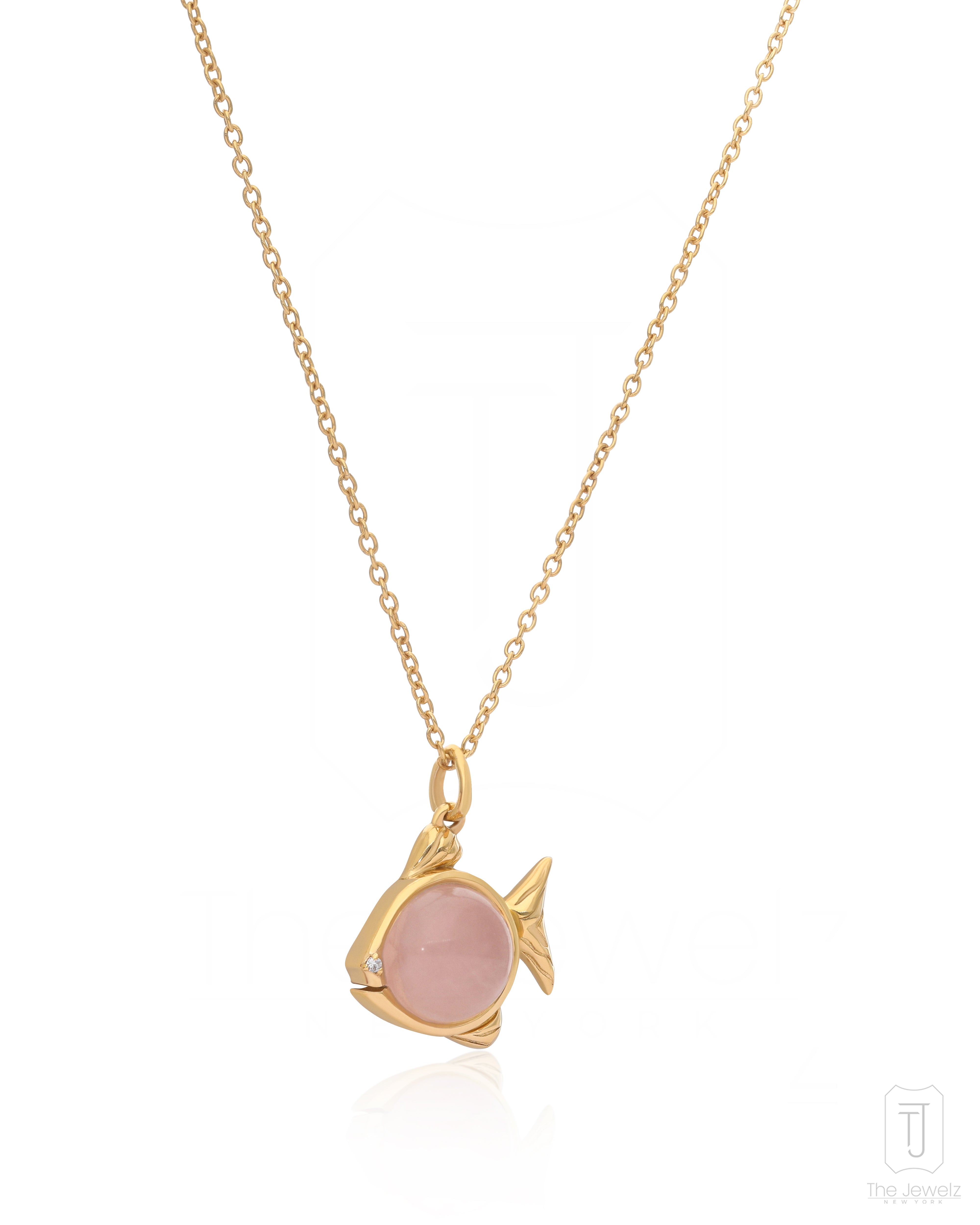 This playful fish pendant necklace is a unique gift option. Made with 925 silver and adorned with a rose quartz gemstone, it exudes a delicate charm. The perfect balance of 3.76 Ct. gemstone and 0.01 Ct. CZ adds a touch of sparkle to this quirky piece. Gross weight- 3.29 Gms & Metal weight- 2.53 Gms.