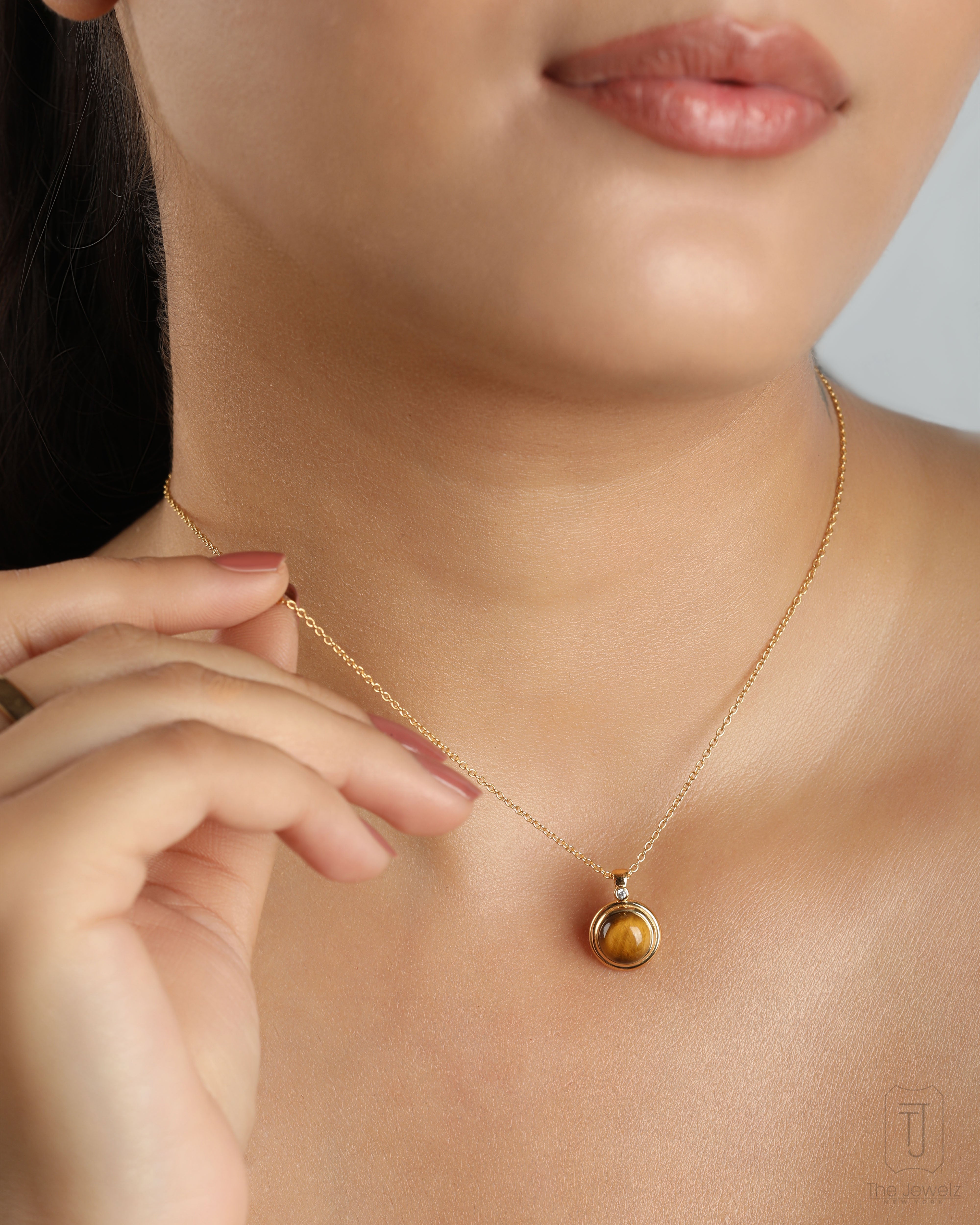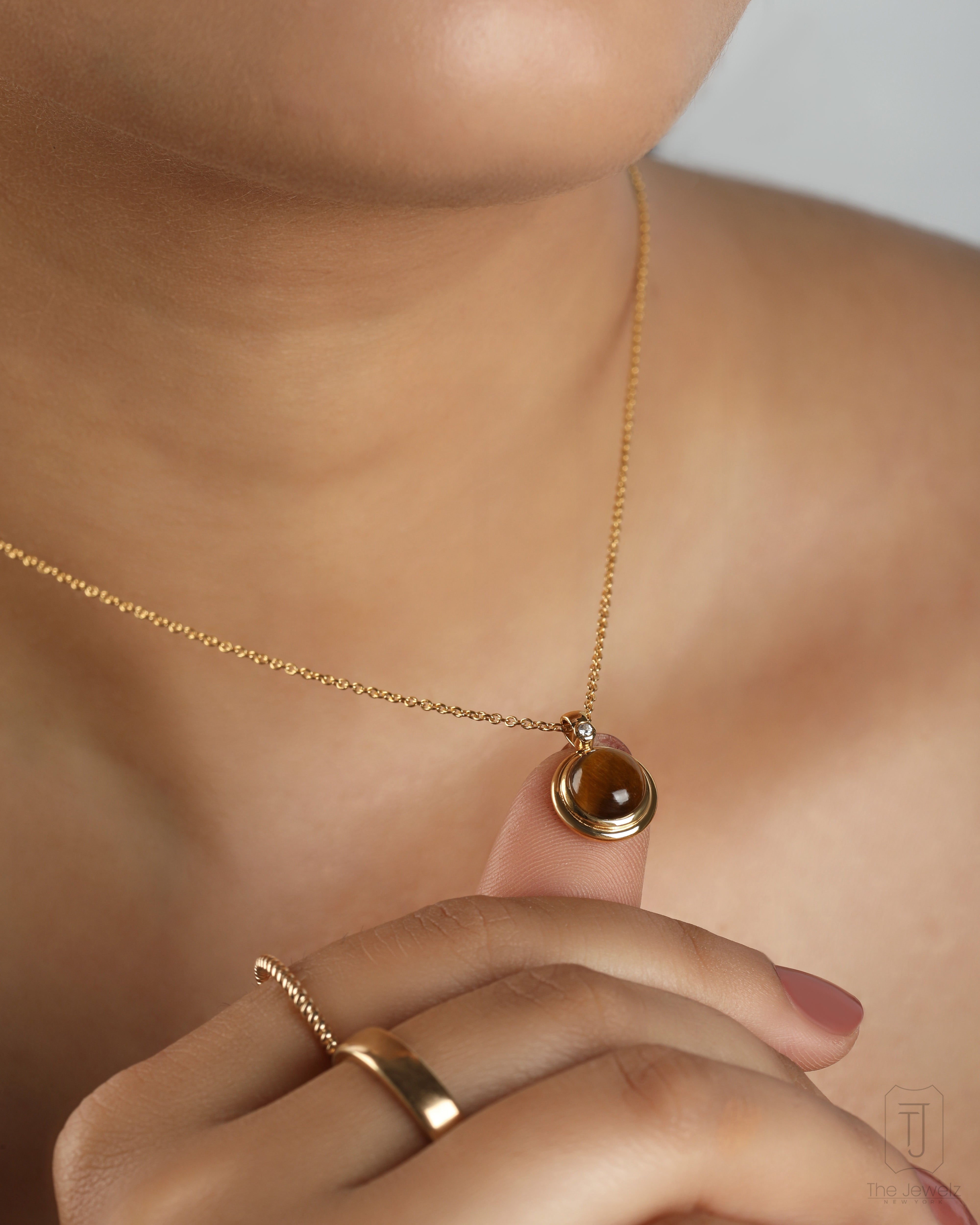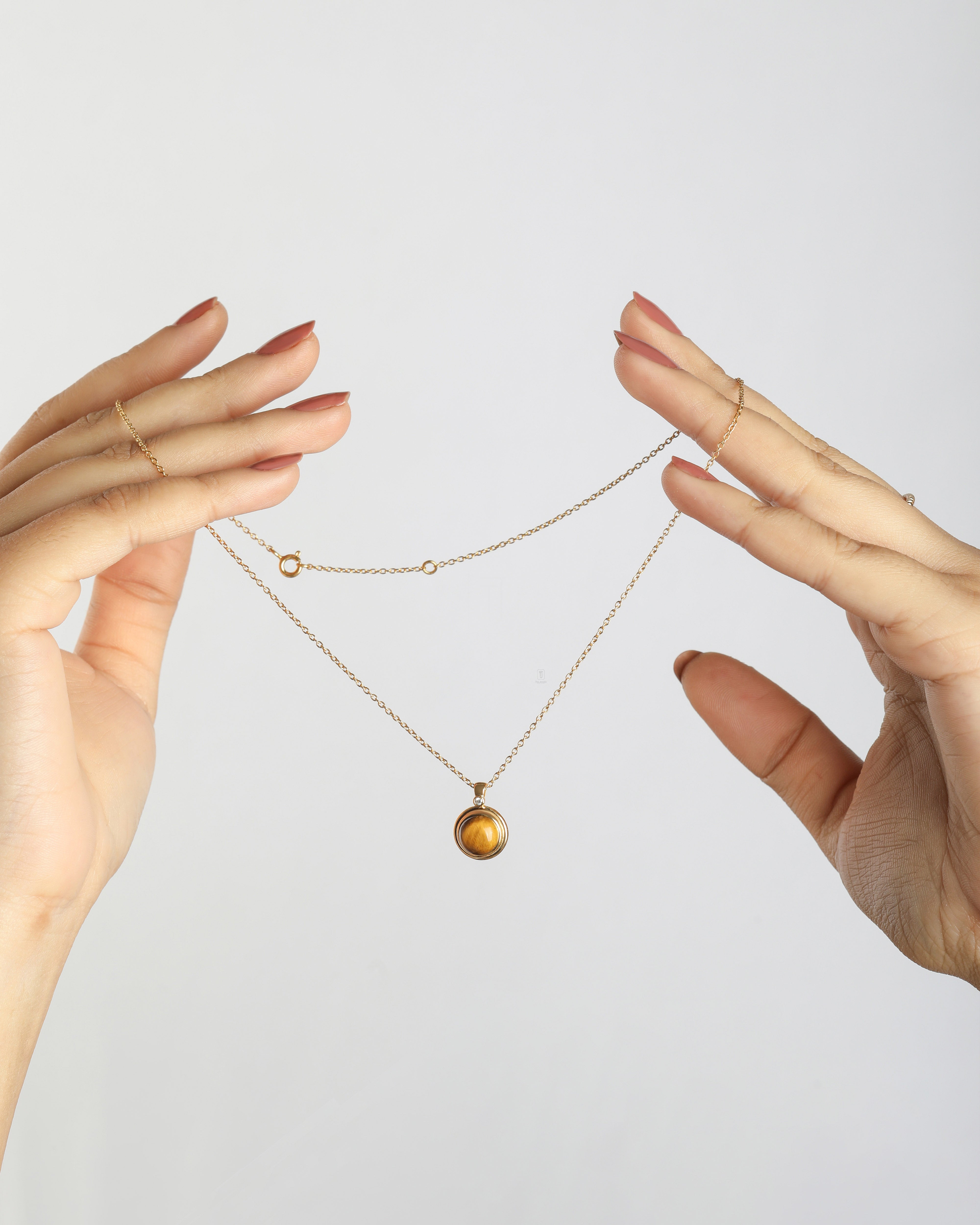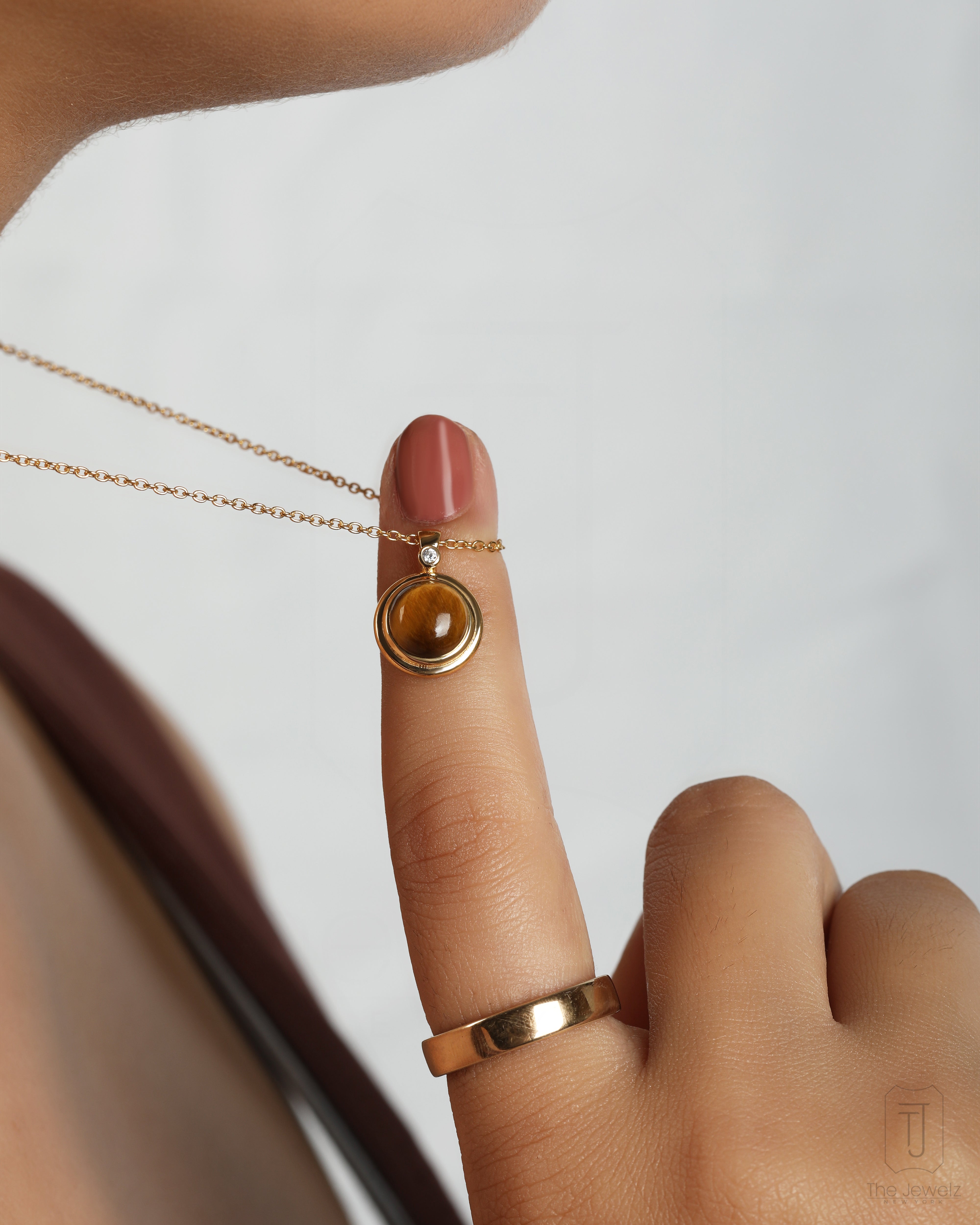 Step into your own orbit with the Singularity Pendant Necklace—a fluid, warm-toned masterpiece that brings chic sophistication to your everyday style. This hypnotic, disc-shaped pendant features a mesmerizing cabochon tiger eye that glows with golden-brown hues, capturing light and attention with every movement.
