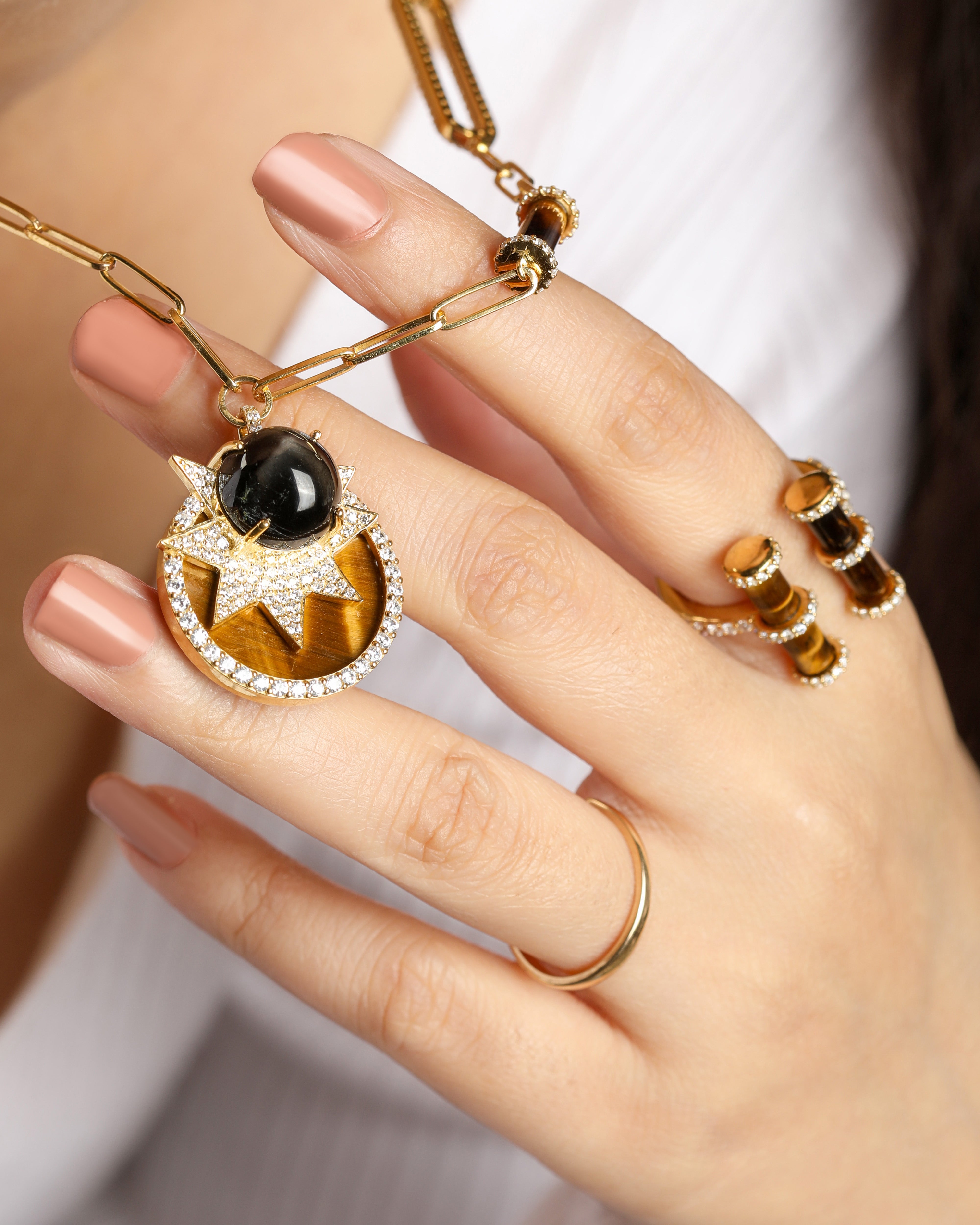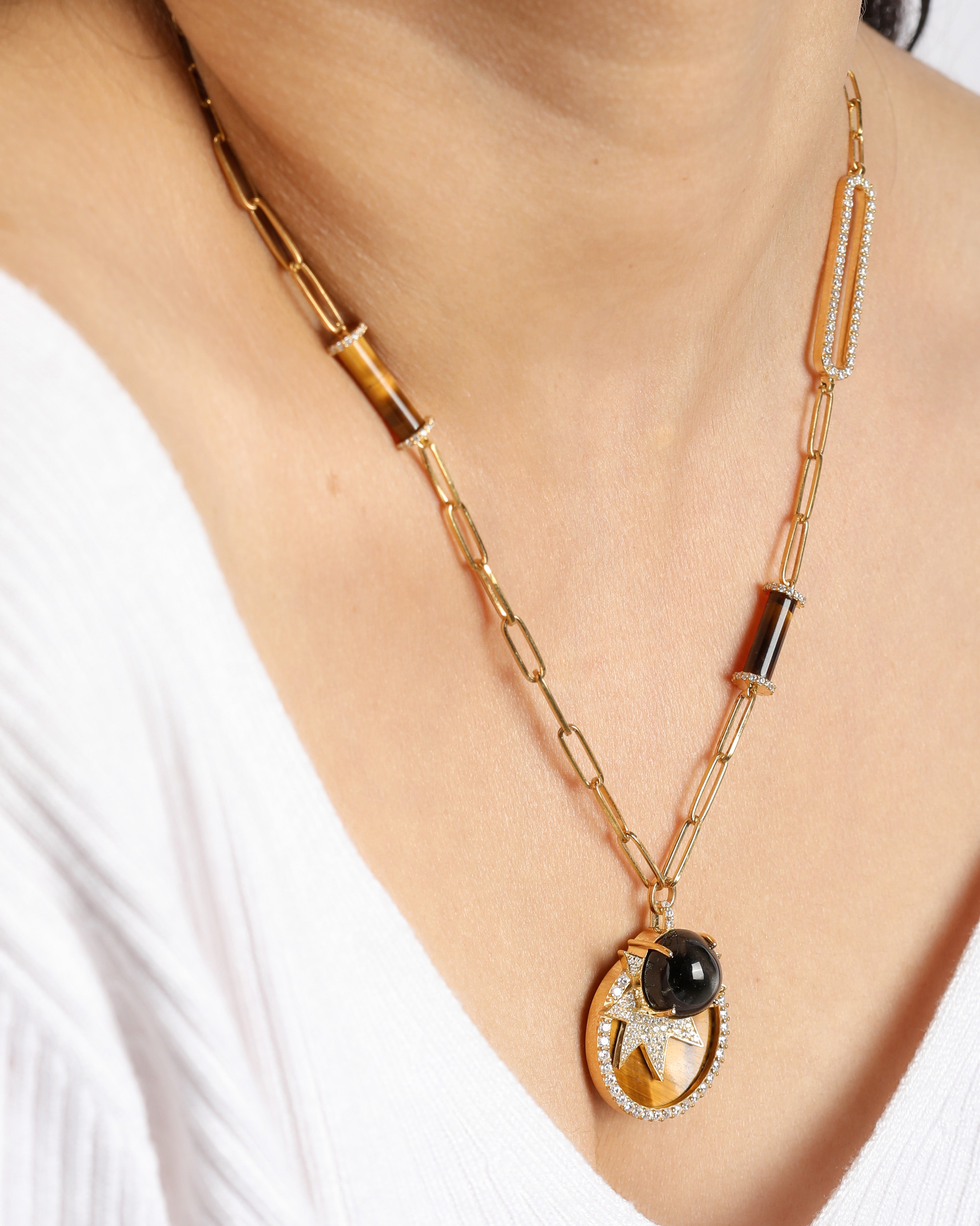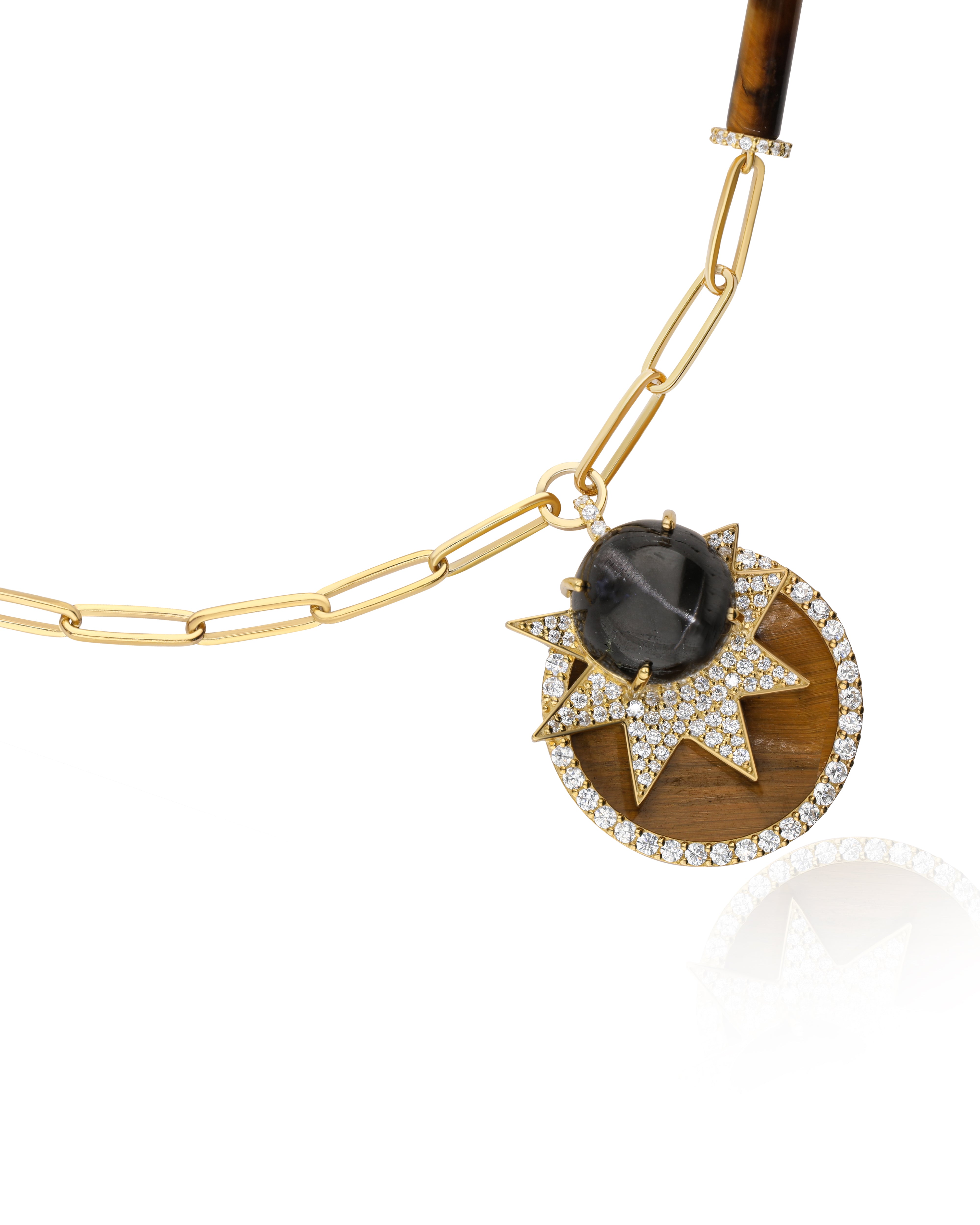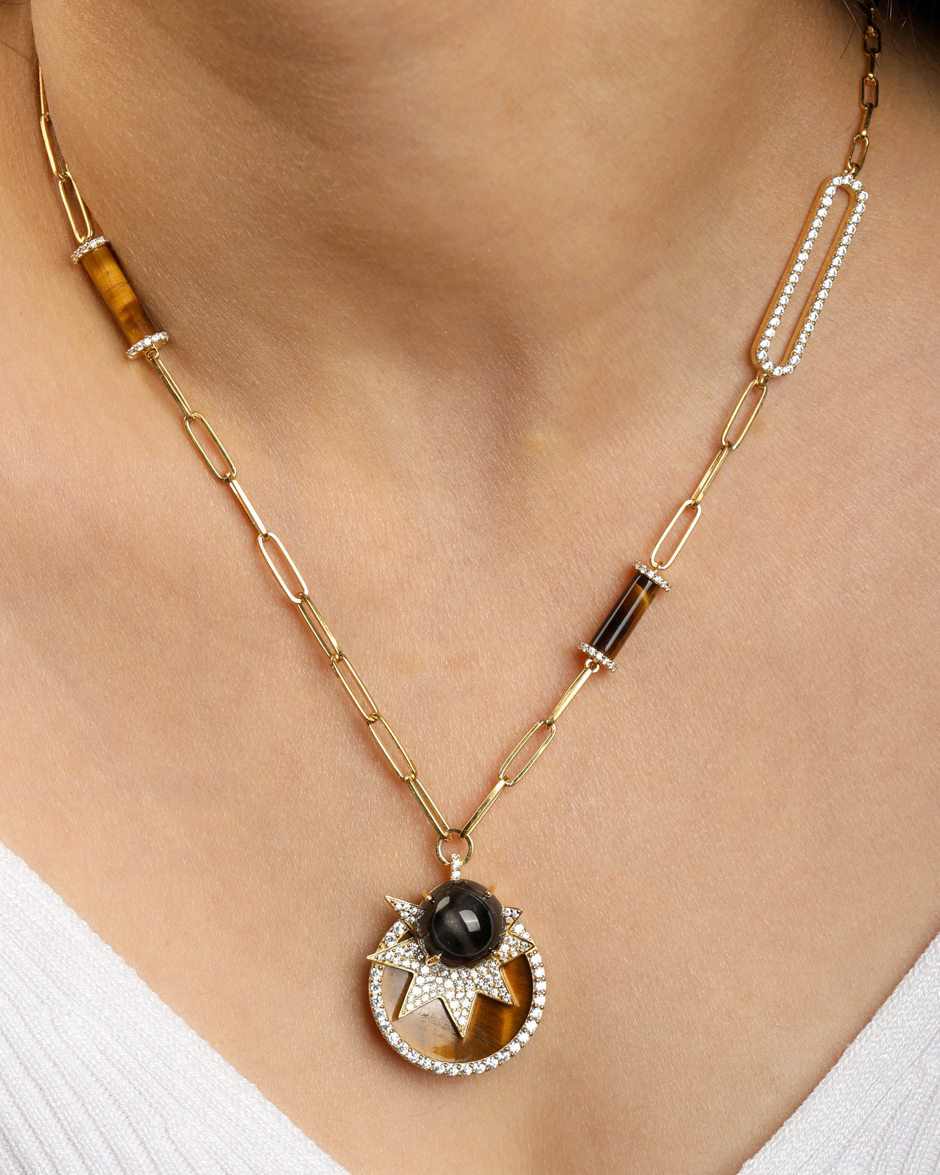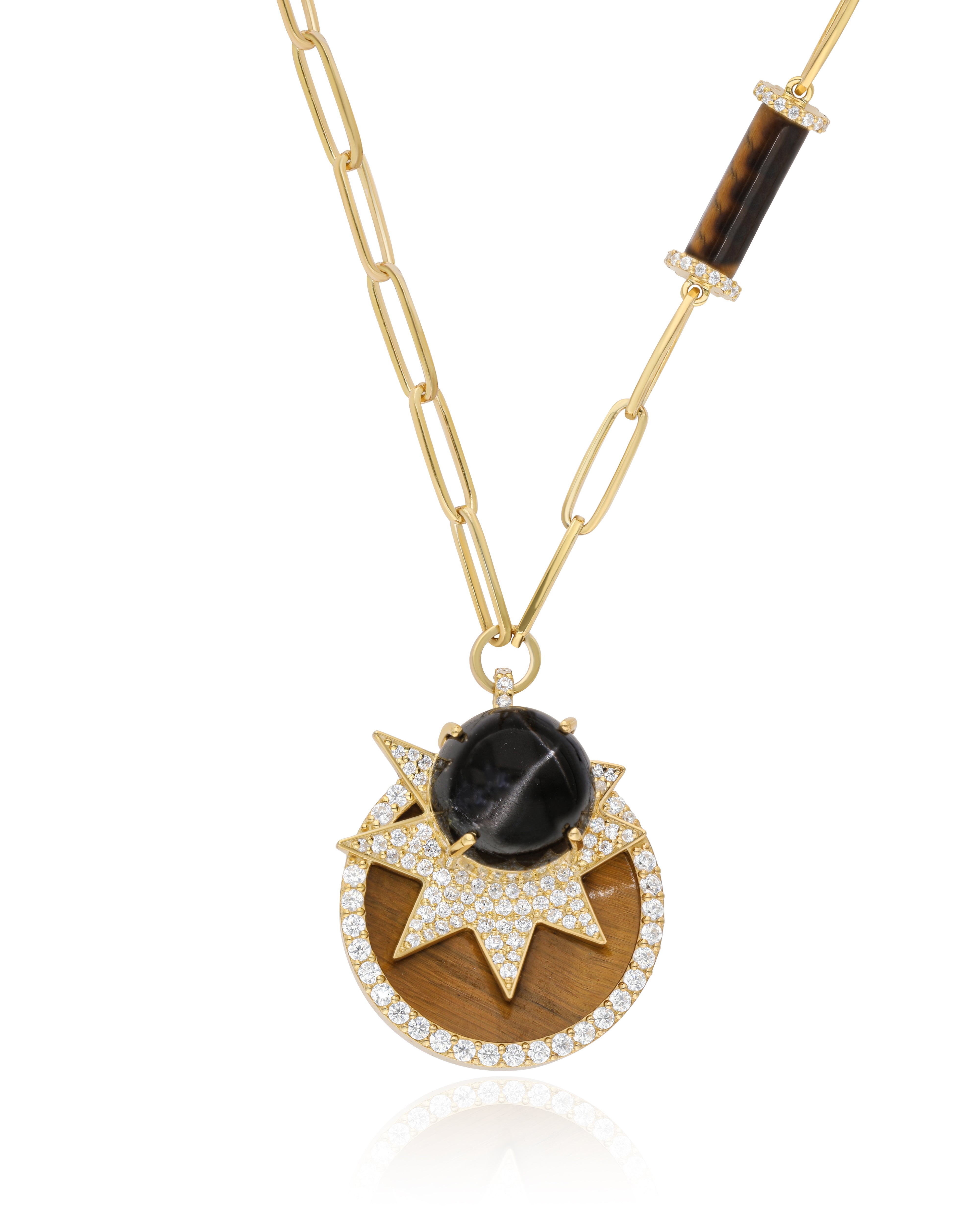 "Forget waiting to wish upon a falling star - With the Starflare Necklace, you won't need to! Tiger's eye burns bright like your wildest dreams, while Chrysoberyl keeps you chill like a spacewalking astronaut. This knockout combo isn't just gorgeous, it's a magnet for good luck and irresistible charm. Basically, this accessory is the difference between blending in and owning the room. You ready to be a star?