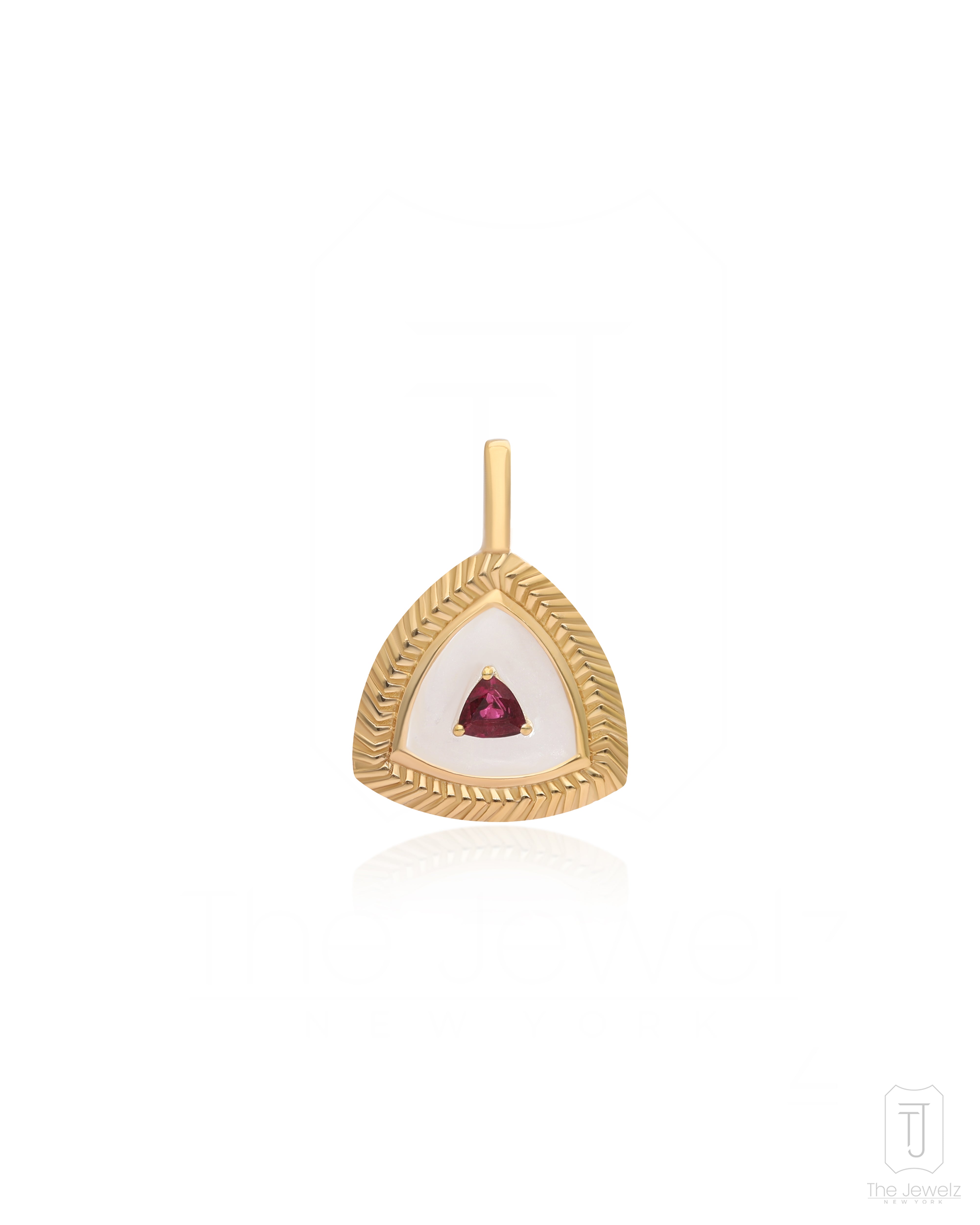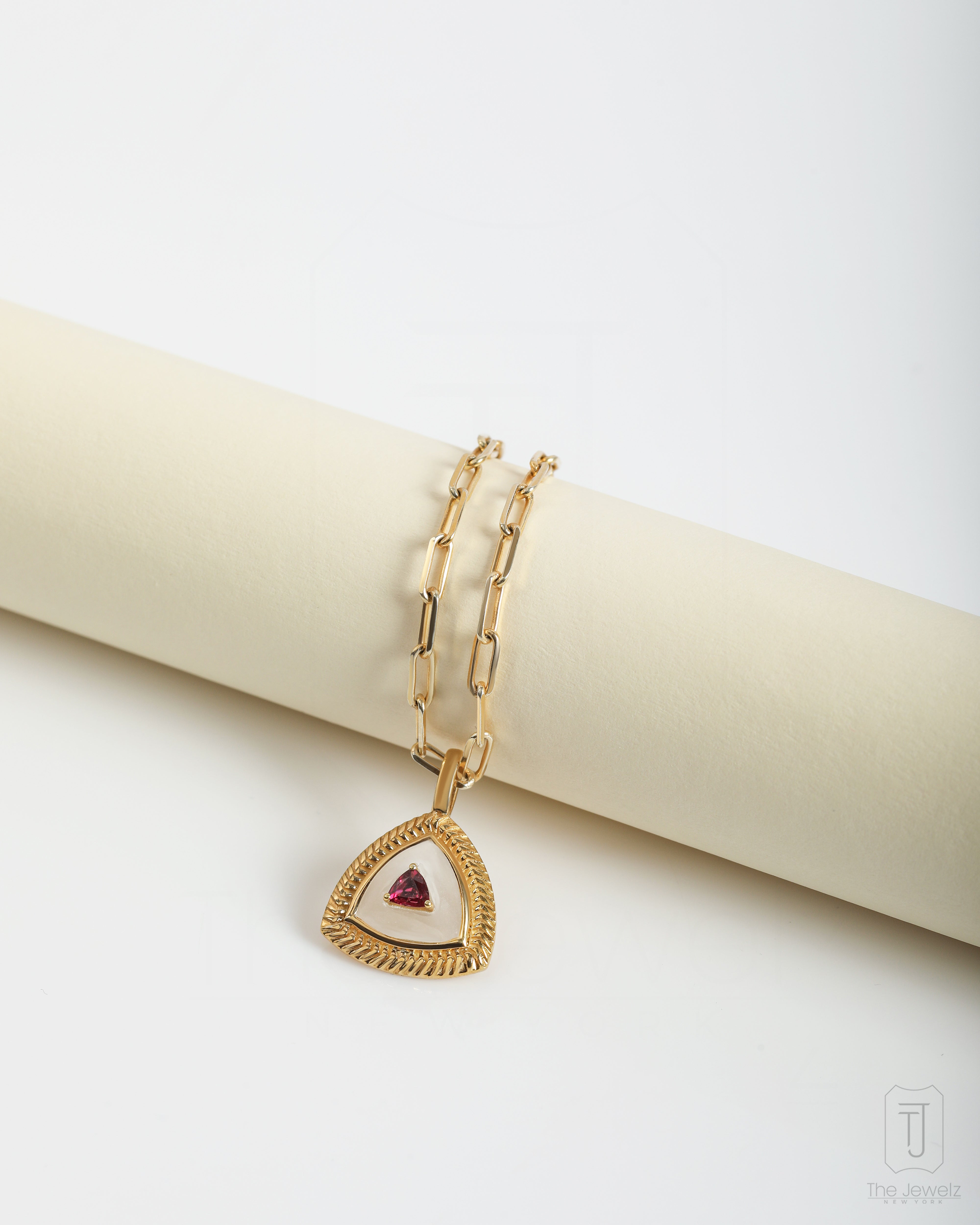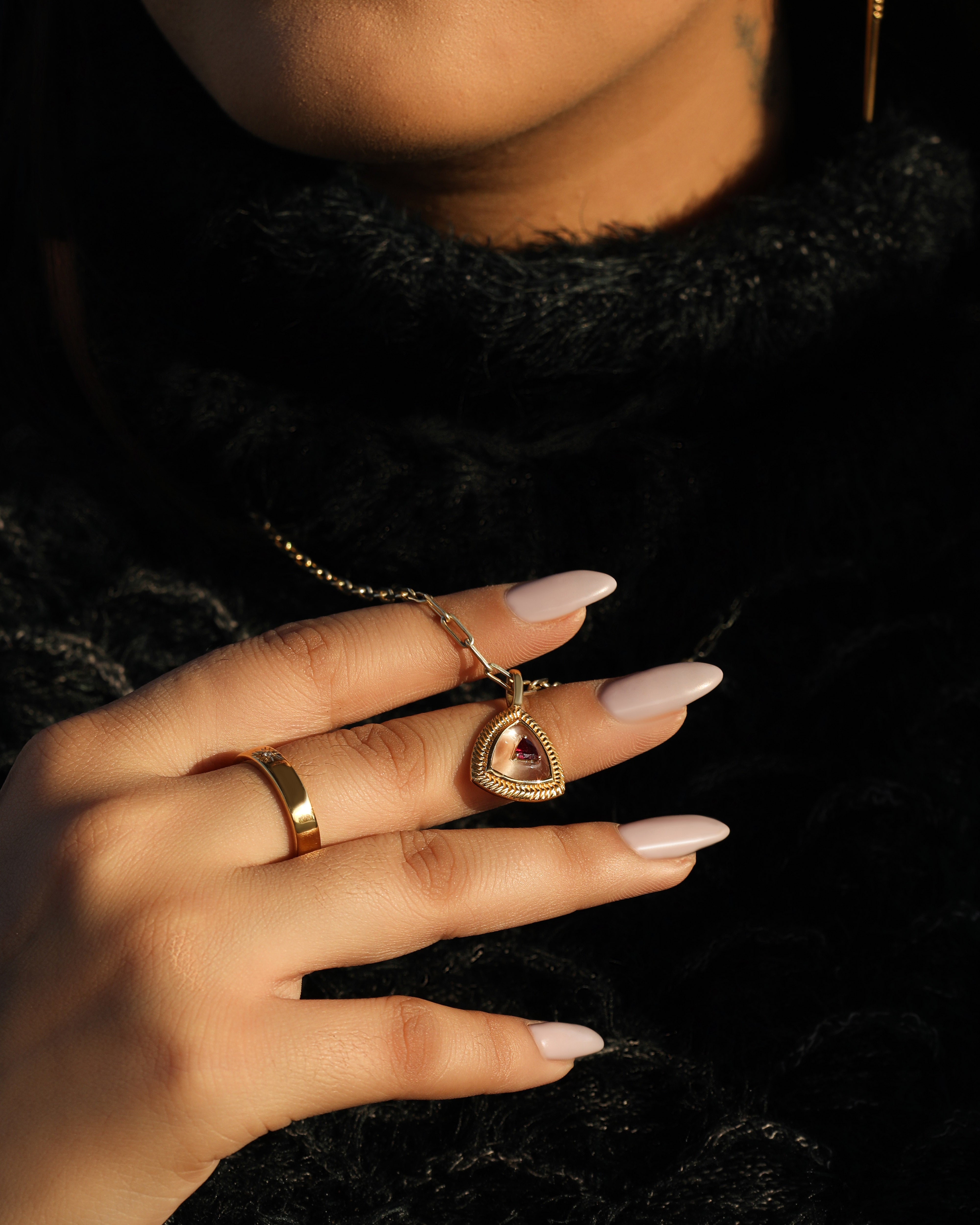 Meet the Tourmaline Kink Pendant, where precision meets play. A mesmerizing trillion-cut pink tourmaline crystal steals the show, shimmering with cheeky confidence. Encased in a subtle chevron-patterned border, it gives you that mix of refined edge and effortless cool—like showing up late and still stealing all the attention.