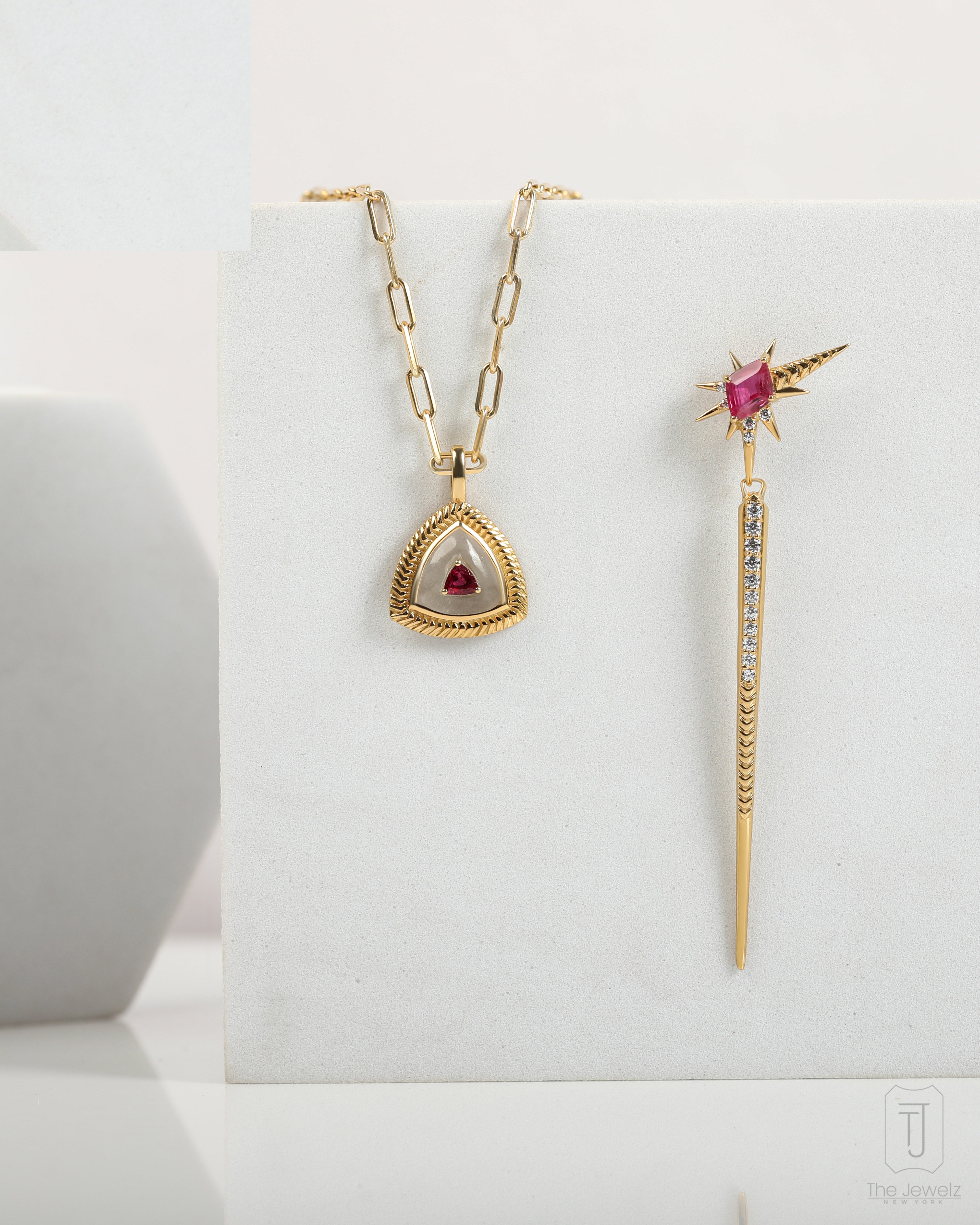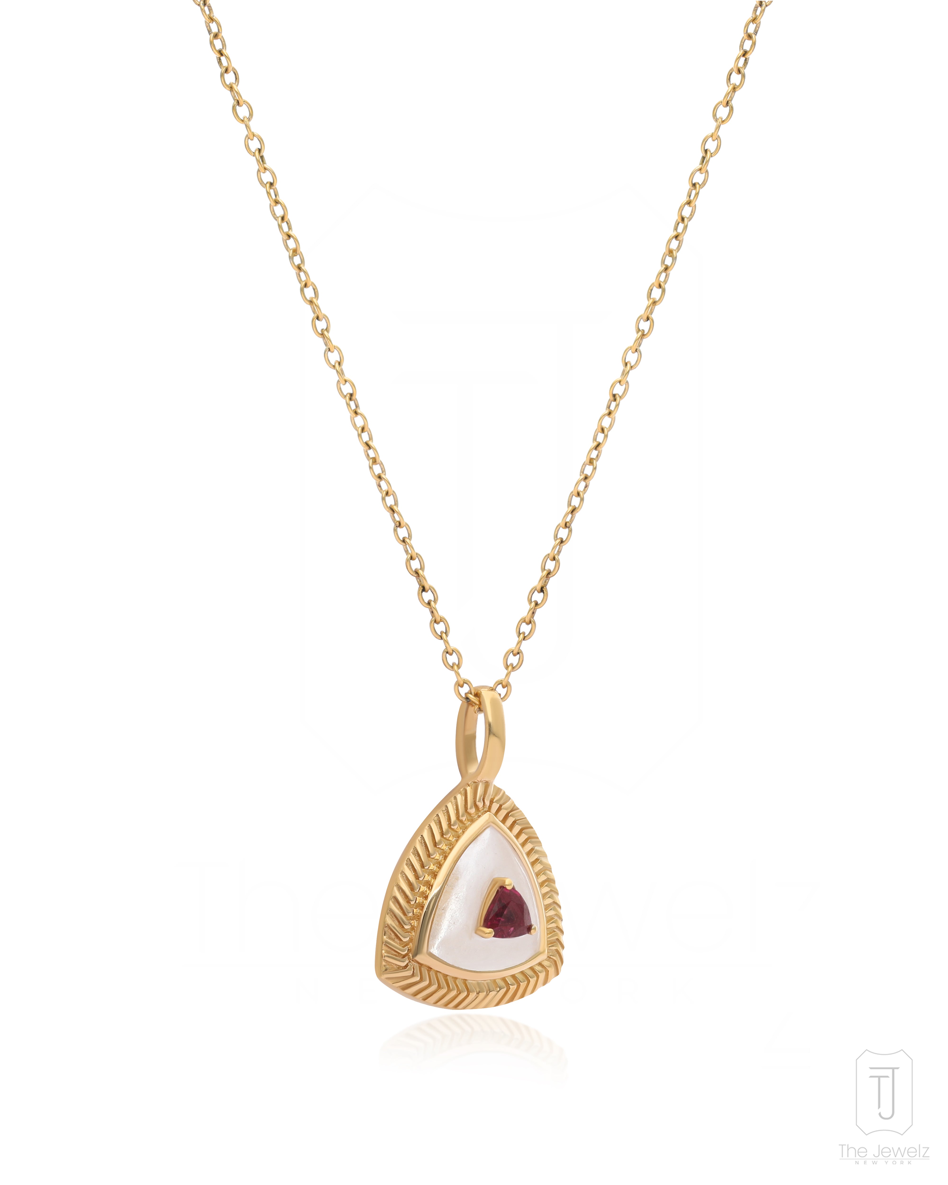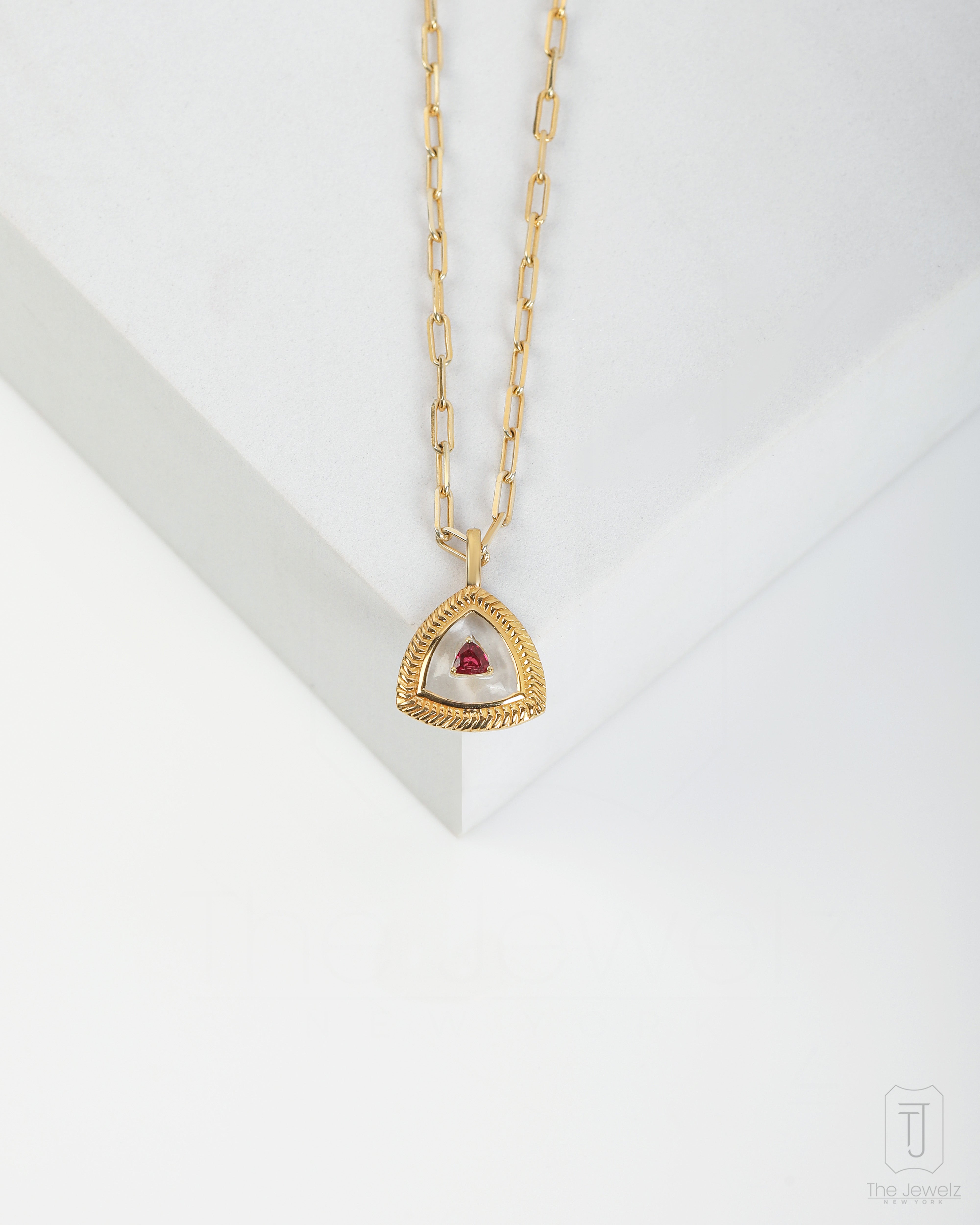 Meet the Tourmaline Kink Pendant, where precision meets play. A mesmerizing trillion-cut pink tourmaline crystal steals the show, shimmering with cheeky confidence. Encased in a subtle chevron-patterned border, it gives you that mix of refined edge and effortless cool—like showing up late and still stealing all the attention.