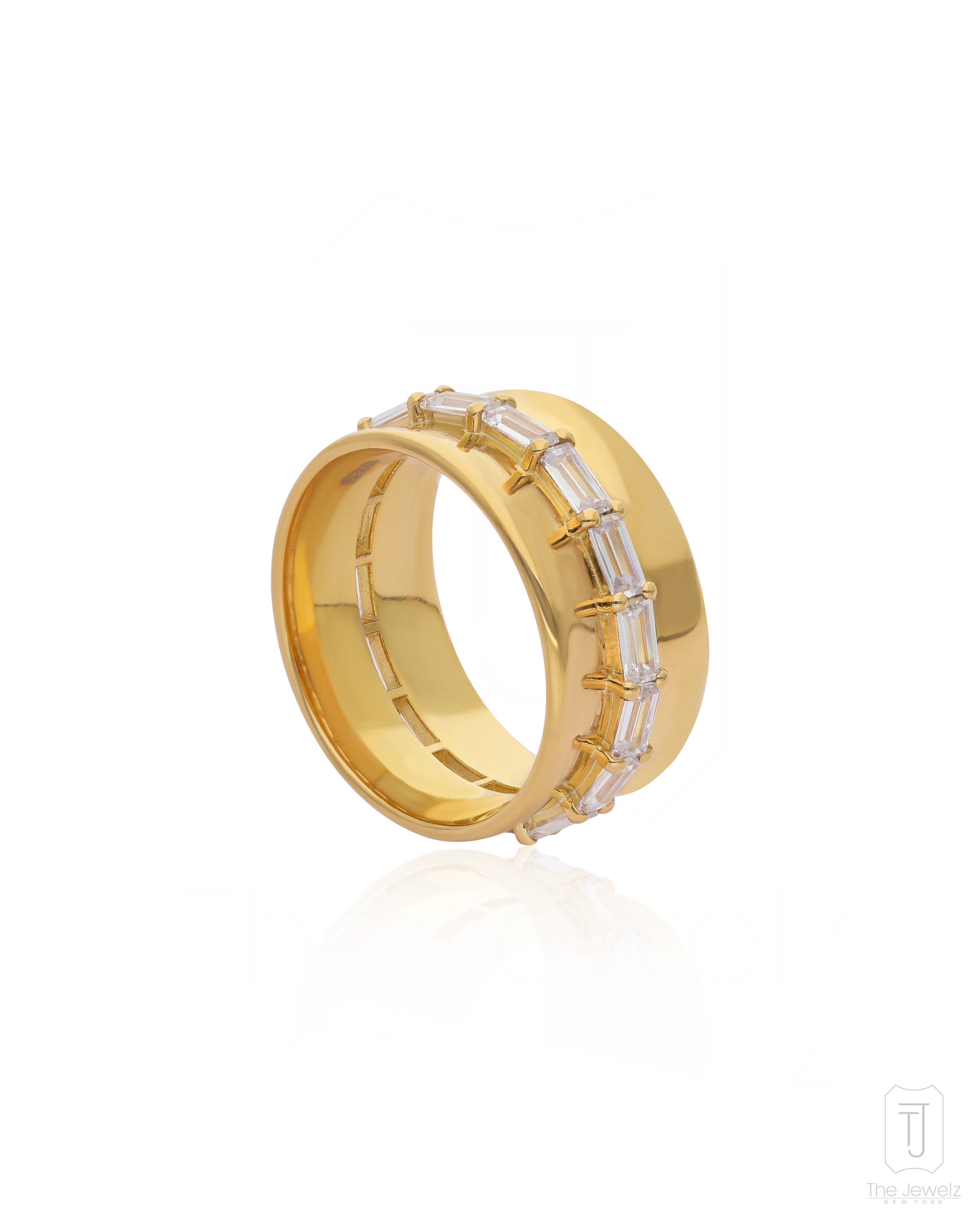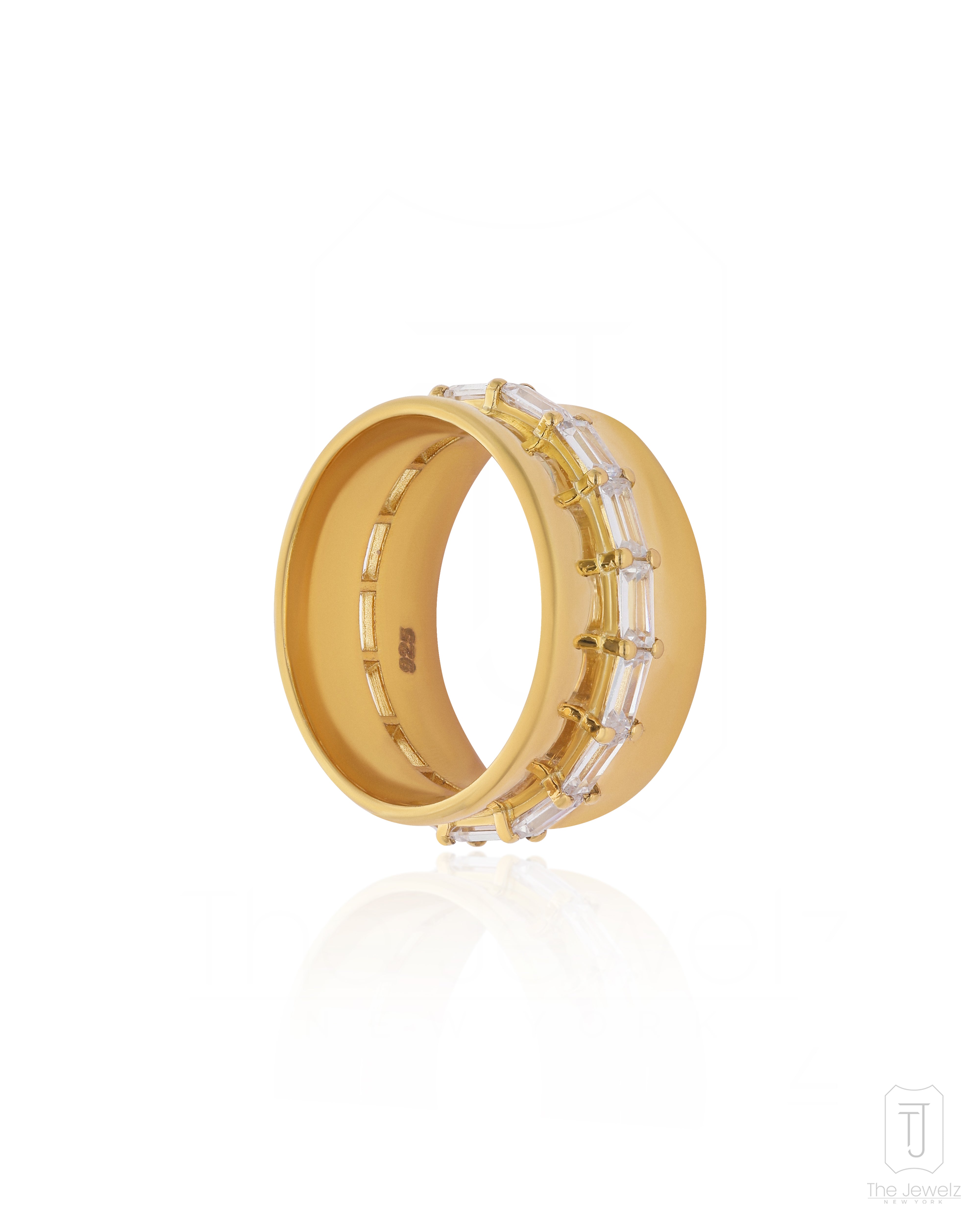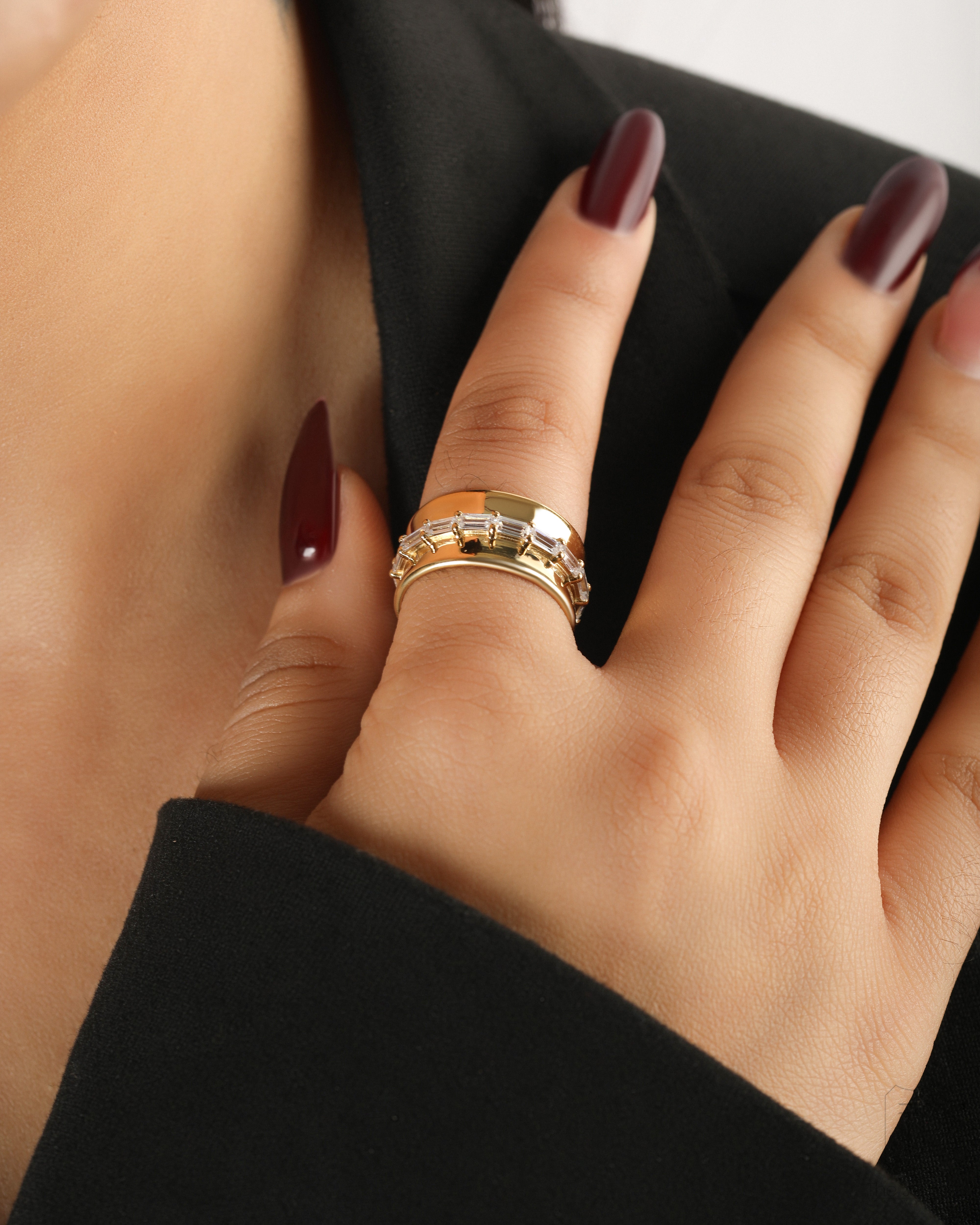It’s the kind of ring you slip on and forget—until the light catches just right, and suddenly, you’re distracted mid-sentence, admiring your own hand. The 925 silver band hugs your finger, smooth and substantial, while the row of baguette-cut stones glints like a knowing smirk. It’s elegant but a little bold, classic with a hint of mischief. Wear it alone when you want to feel effortlessly put together, or stack it up when you're feeling a little extra. Either way, it belongs on your hand. Obviously.