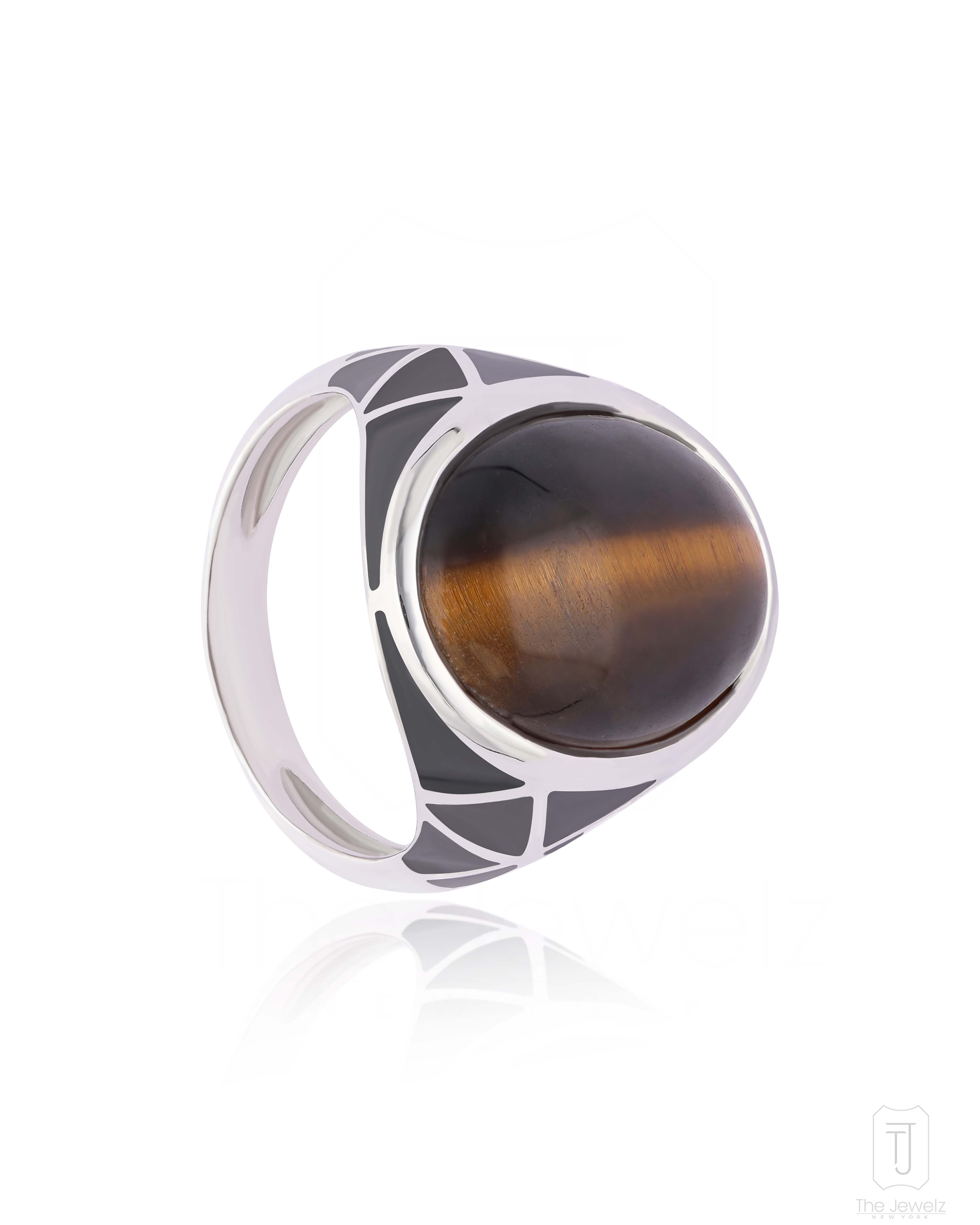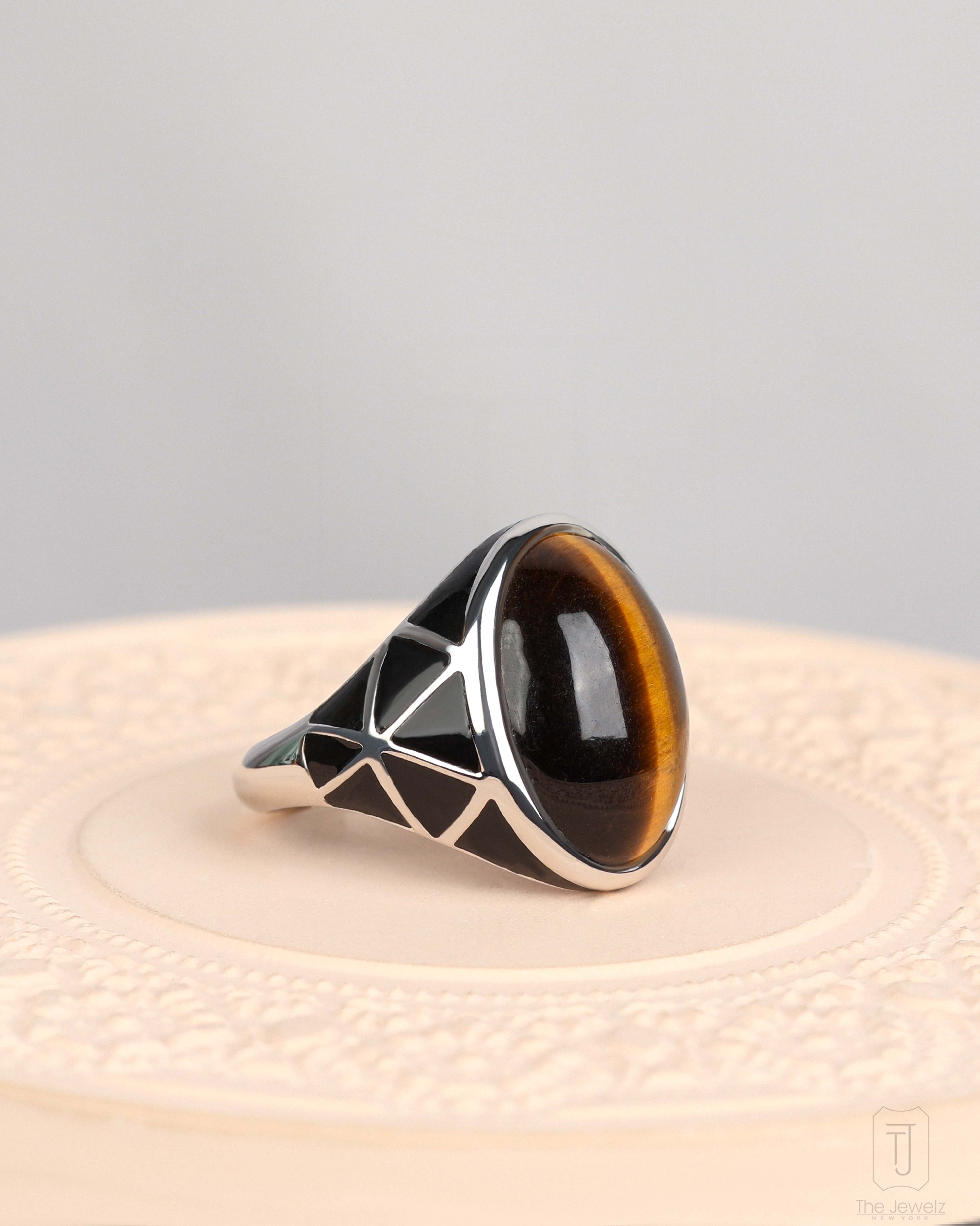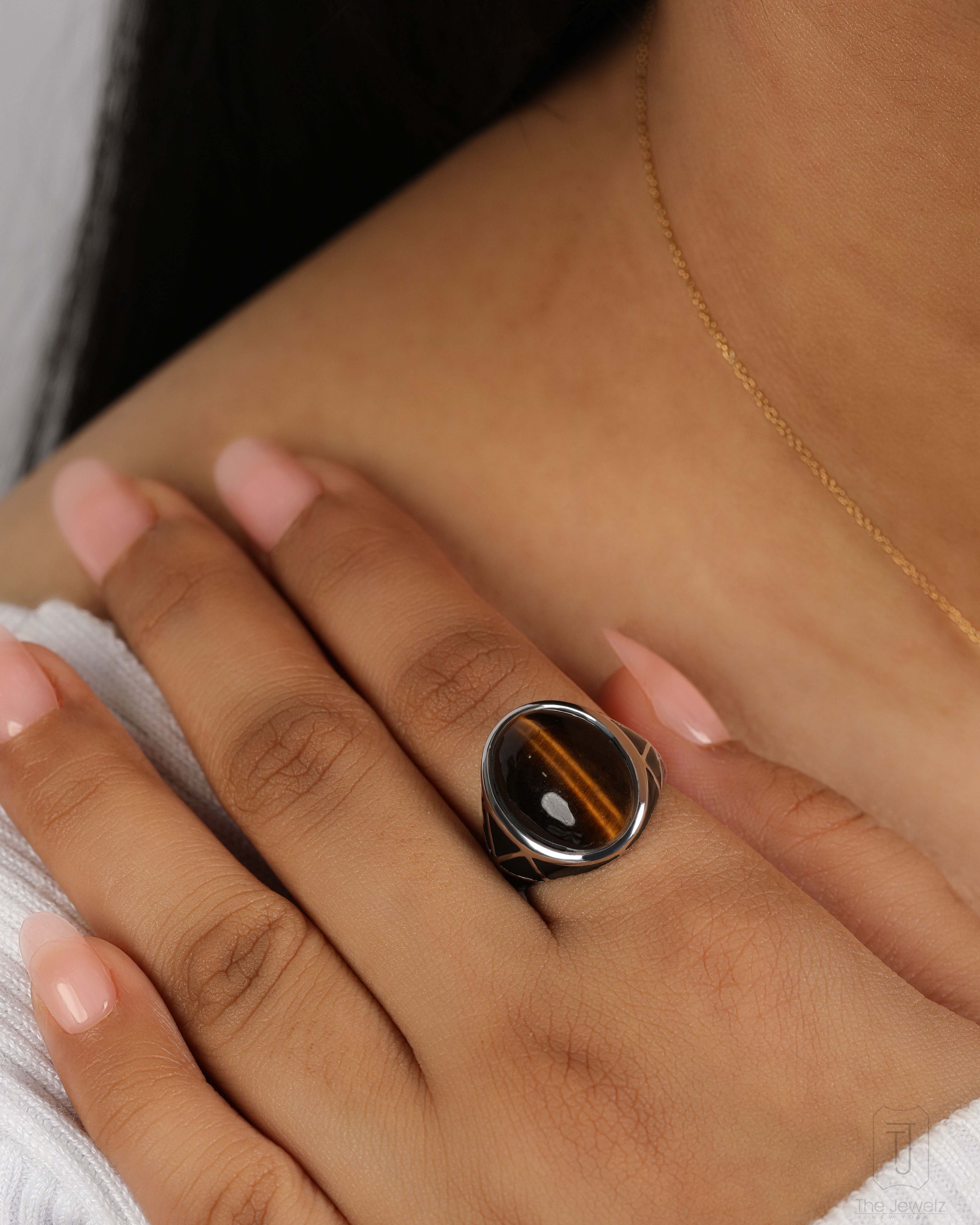 Channel your fierce energy with this captivating Tiger's Eye gemstone ring. Set in premium sterling silver, this piece features a genuine tiger's eye stone with its iconic honey and chocolate striations that seem to dance in the light. The bold black enamel accents add an edgy flair that transforms this ring into a conversation starter. Whether you're channeling confidence or embracing your adventurous spirit, this natural gemstone ring is your wearable reminder to stay bold and unapologetically you.