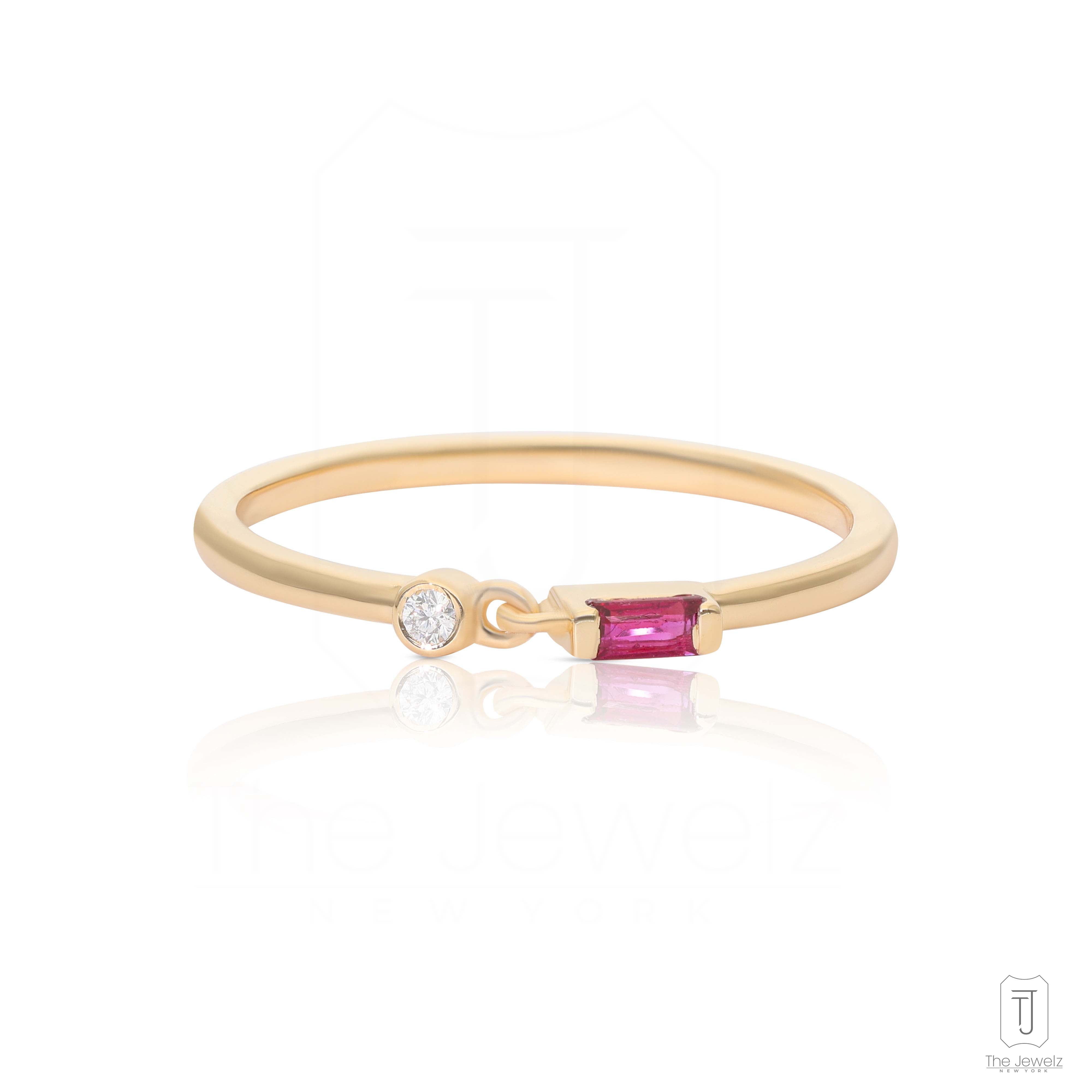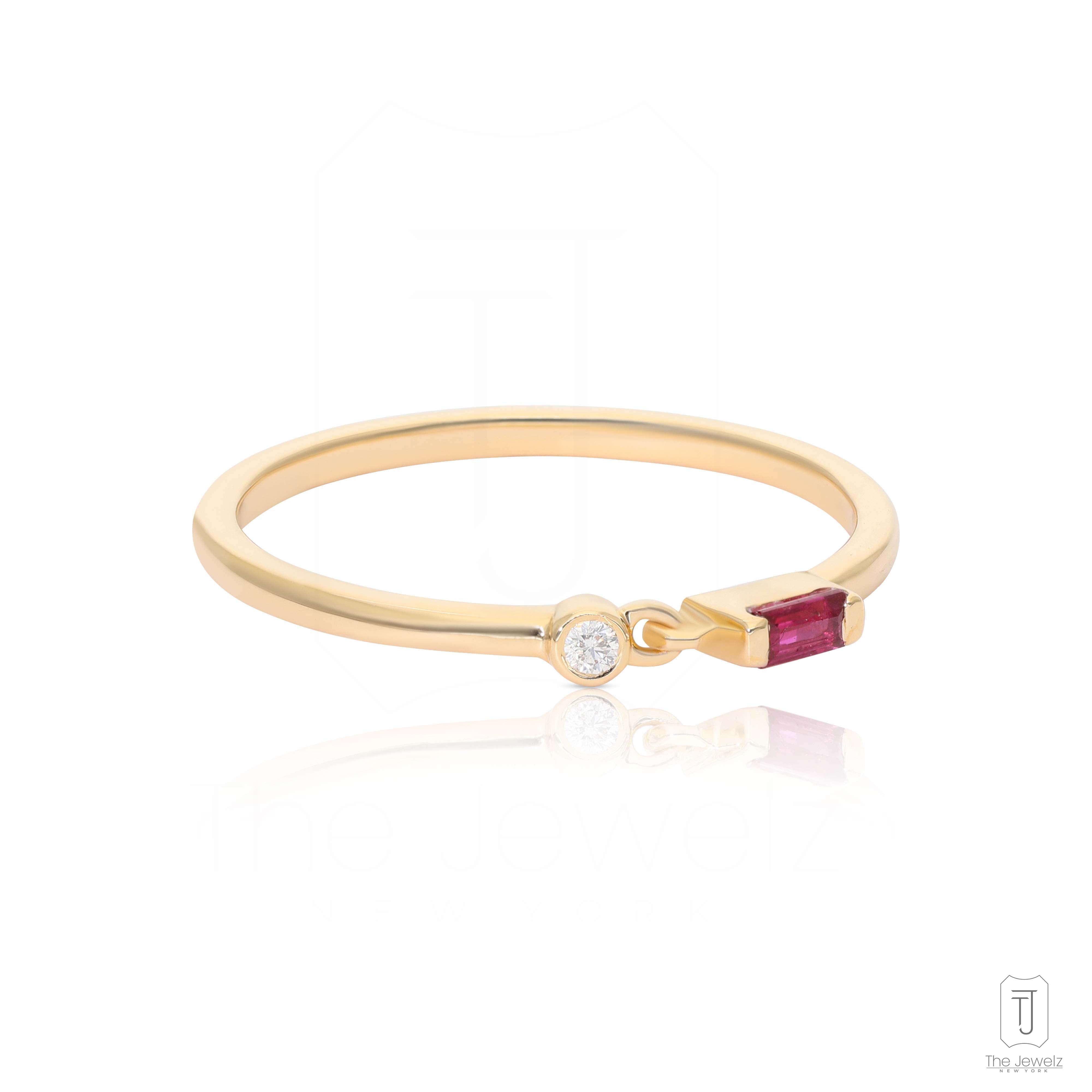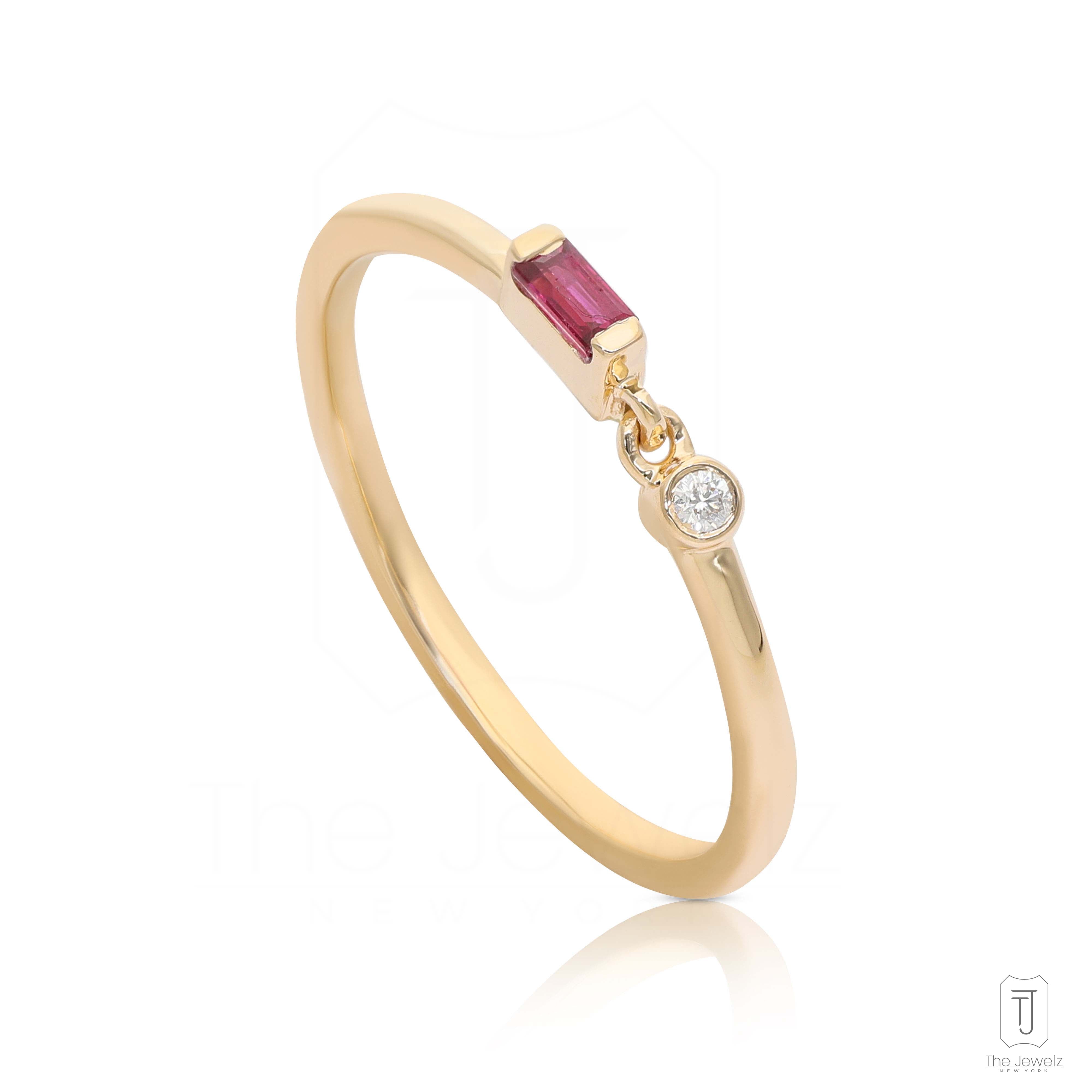 This Ruby Baguette Ring crafted from 14k gold is sure to draw attention. A shining diamond accentuates the timeless beauty of the piece. Show off your sophistication and class with this high-quality, elegant ring.