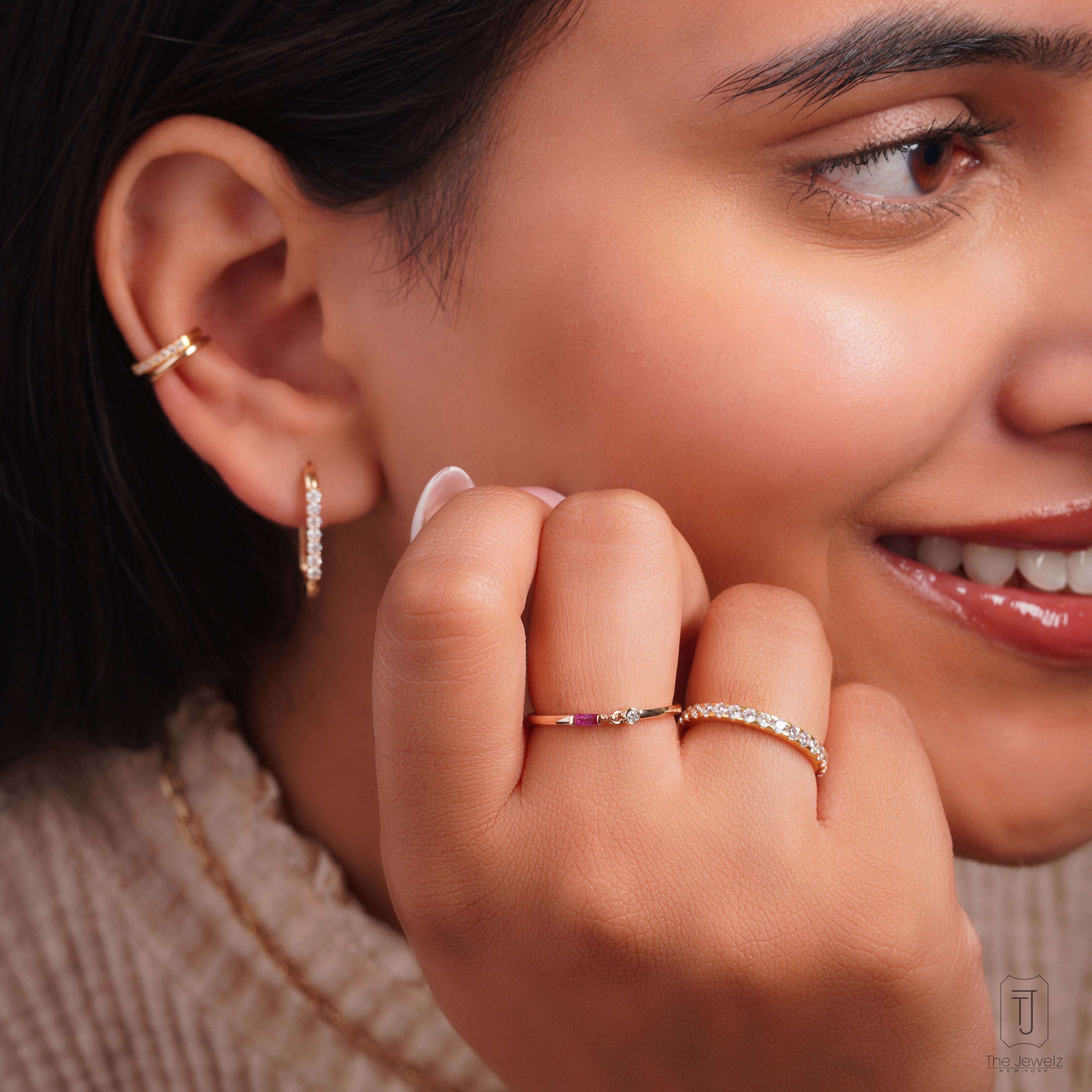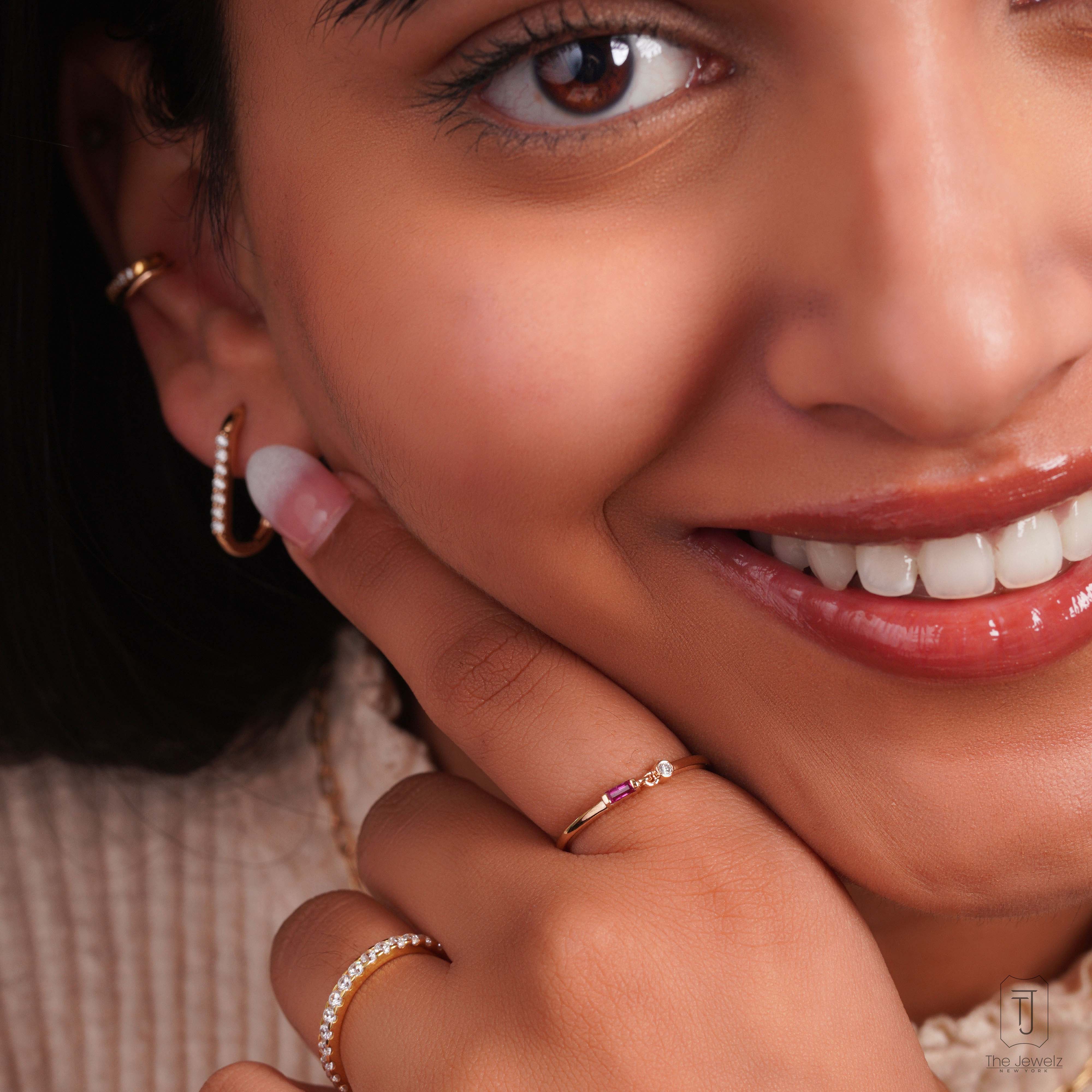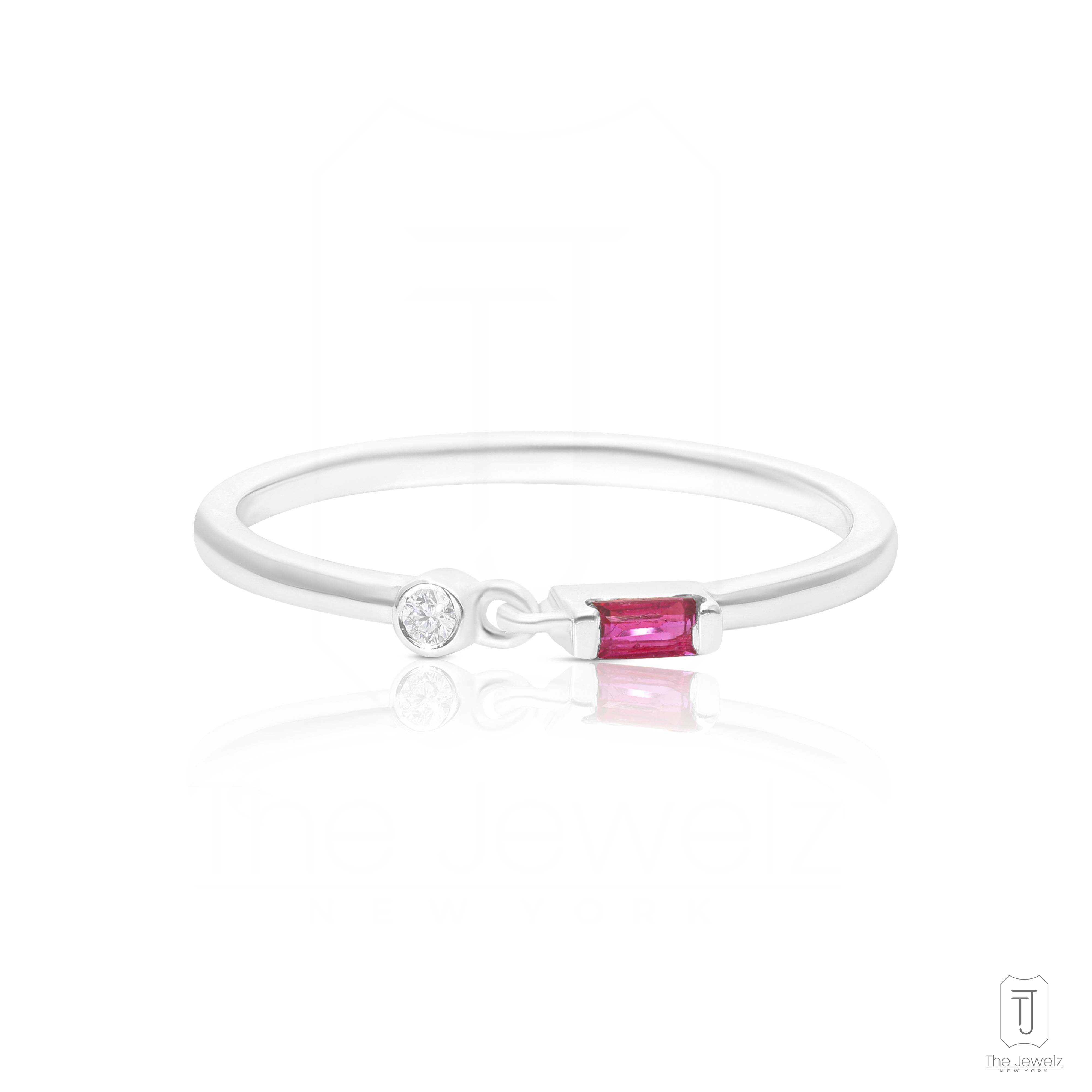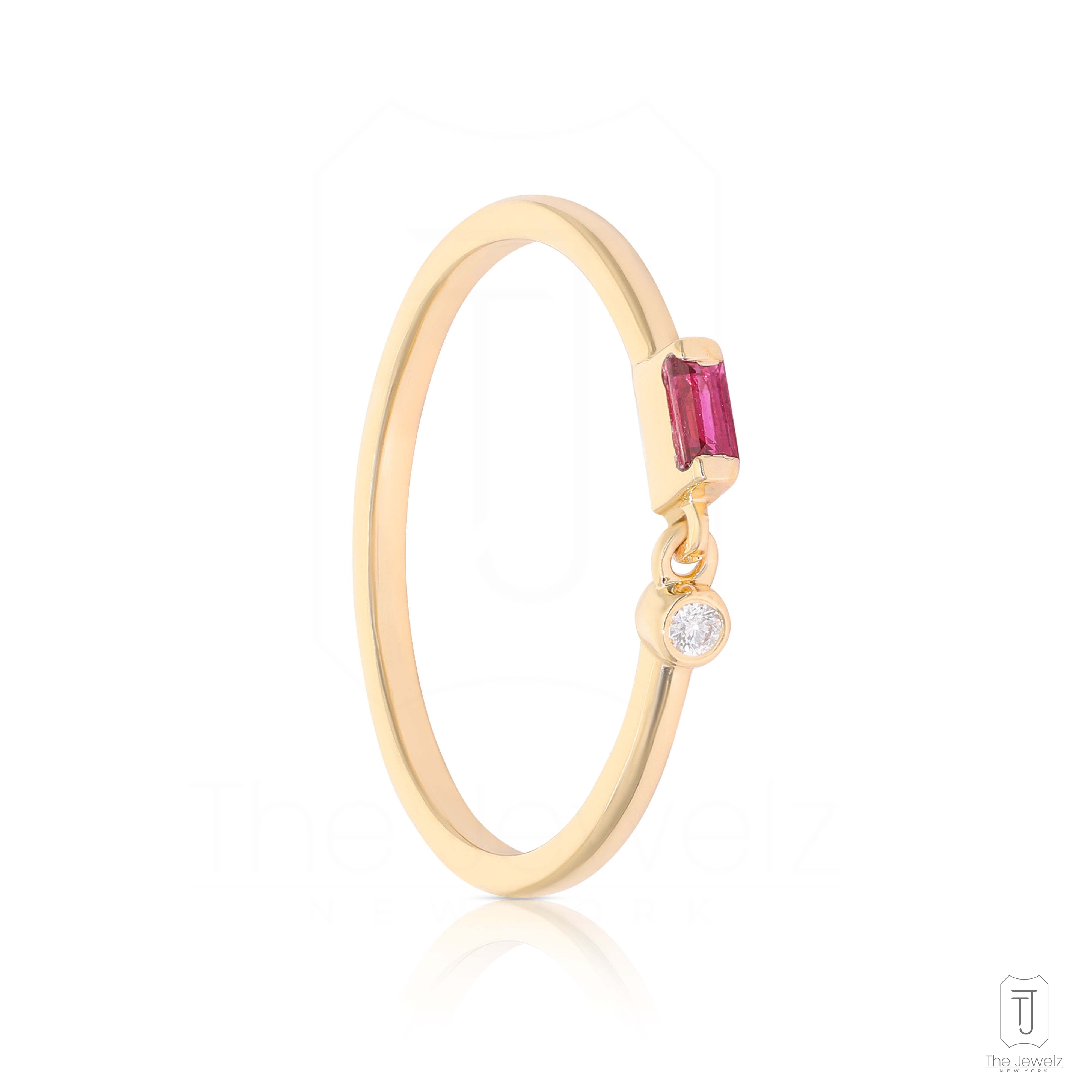 This Ruby Baguette Ring crafted from 14k gold is sure to draw attention. A shining diamond accentuates the timeless beauty of the piece. Show off your sophistication and class with this high-quality, elegant ring.